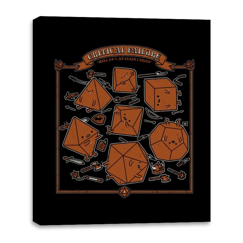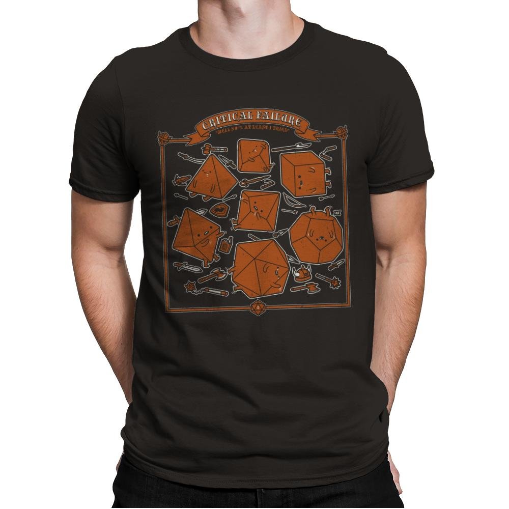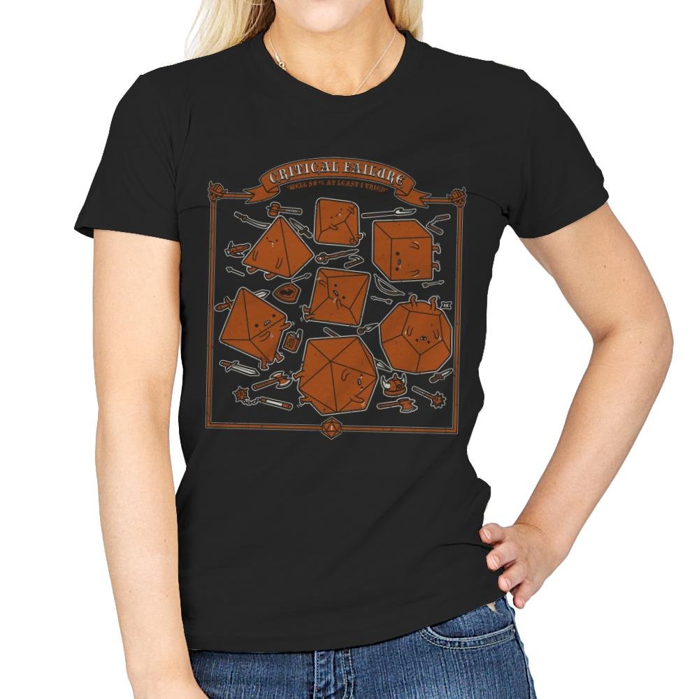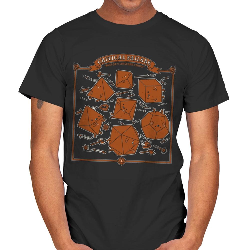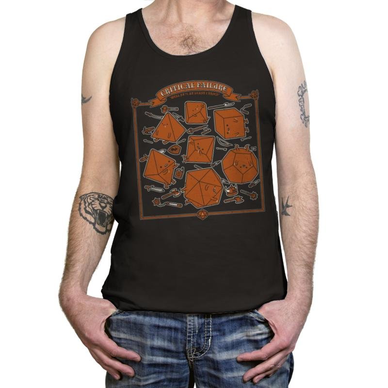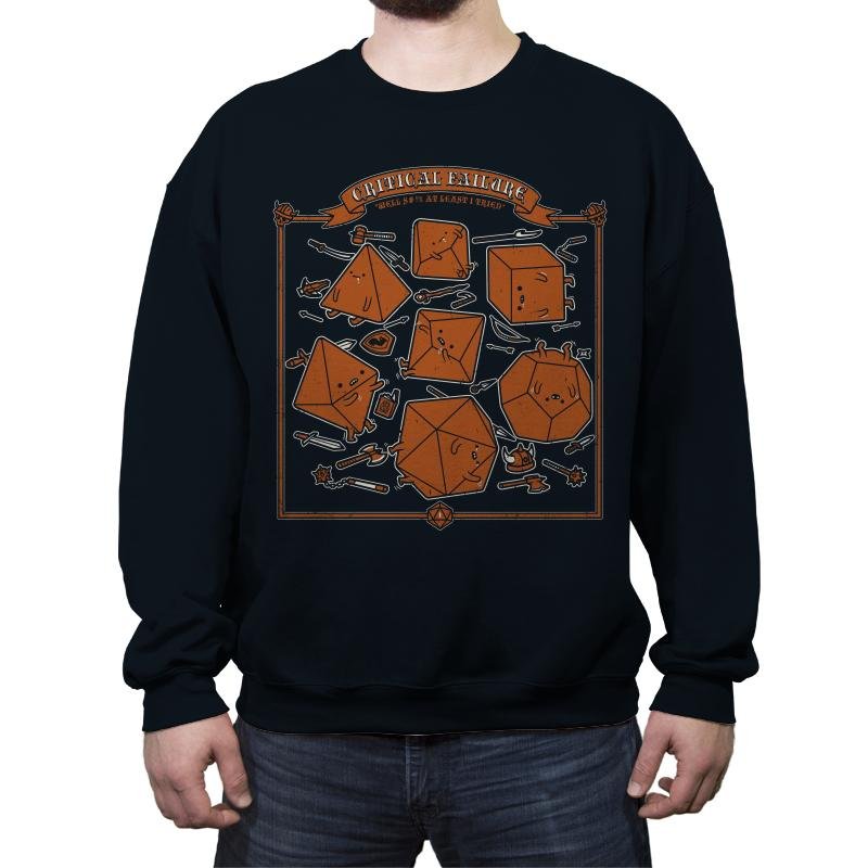 This design turns a full set of polyhedral dice into bumbling adventurers mid disaster. Each die shape has a tiny face and limbs, tumbling through a mess of swords, arrows, coins, and broken gear. The banner at the top reads Critical Failure, followed by the resigned reminder You win some, you fumble others. The whole scene looks like a tapestry of botched rolls that any tabletop player has lived through more than once.