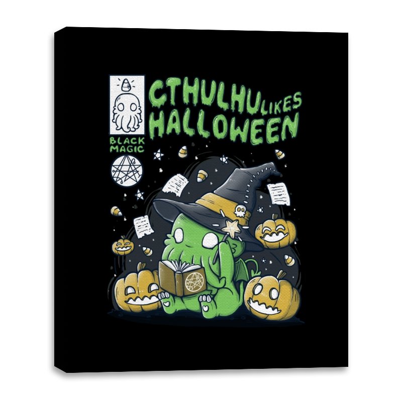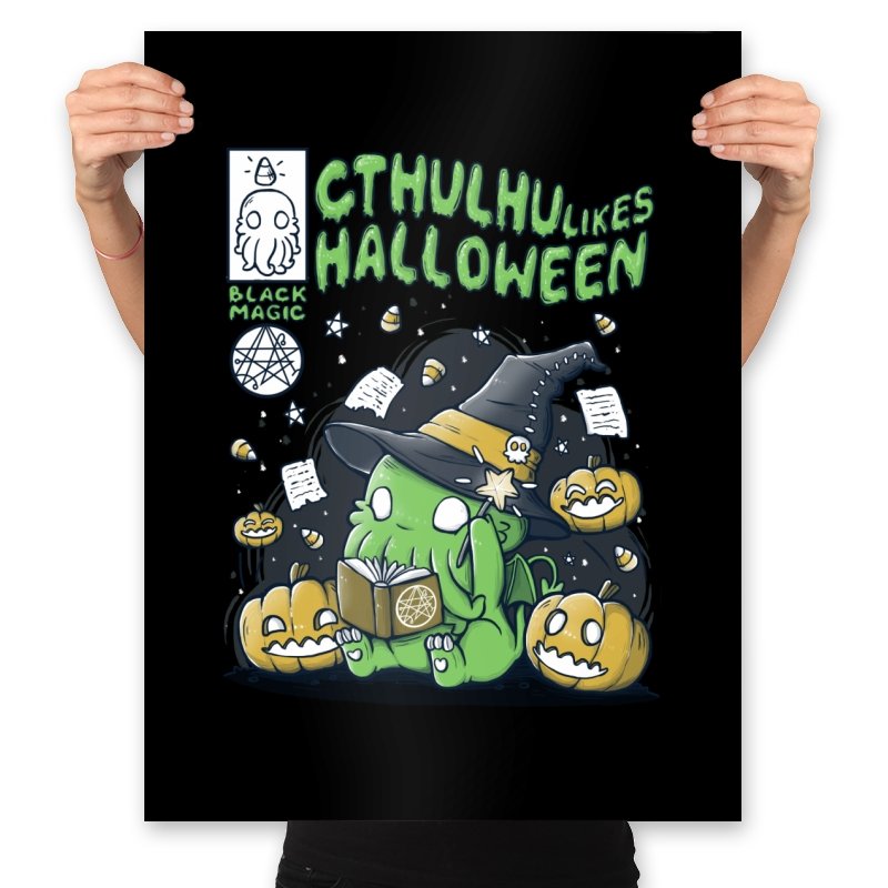 Cthulhu Likes Halloween imagines a tentacled elder thing as a shy trick-or-treater. The small green creature sits cross-legged in a wizard’s hat, reading an arcane book while candy and spell scraps float around. Jack o’ lanterns grin in approval as stars, runes, and bees orbit the scene like familiar spirits. The chalky lettering and doodle side panels give it the feel of a notebook sketch gone occult.