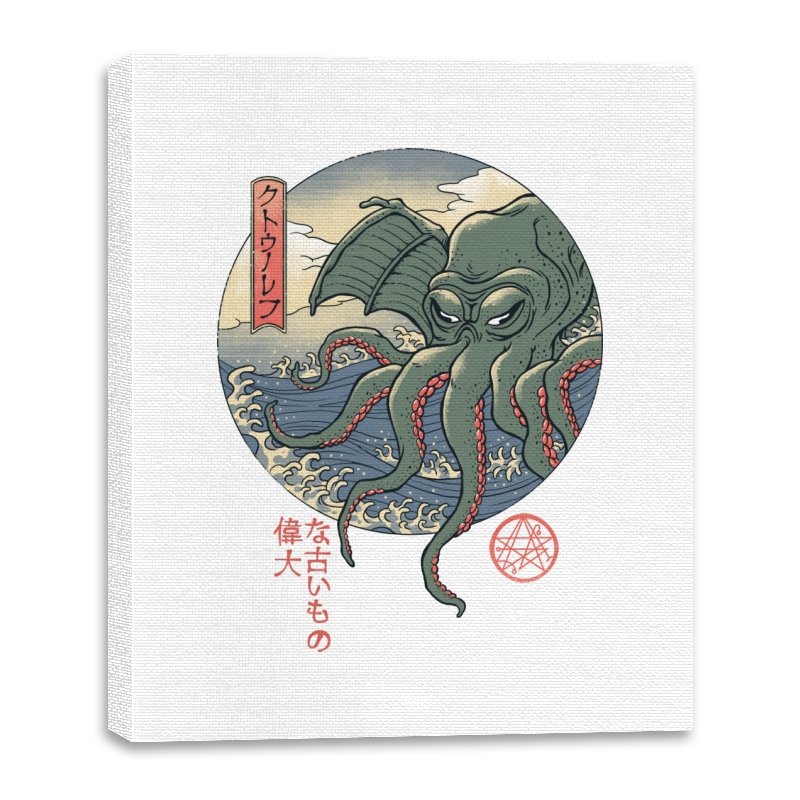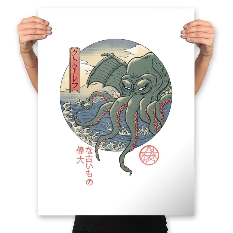 This print frames a certain eldritch sea titan inside a classic ukiyo-e circle composition. Tentacles spill forward as waves curl beneath, while muted greens and reds echo woodblock pigments. The creature’s stare feels ancient and mildly annoyed, like being summoned before coffee. Japanese text ornaments the margins and a small occult seal completes the homage, making the whole piece read like a lost page from some maritime bestiary.