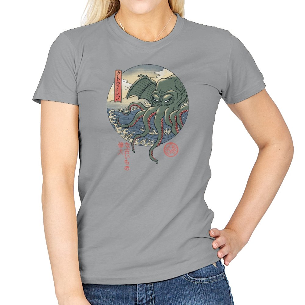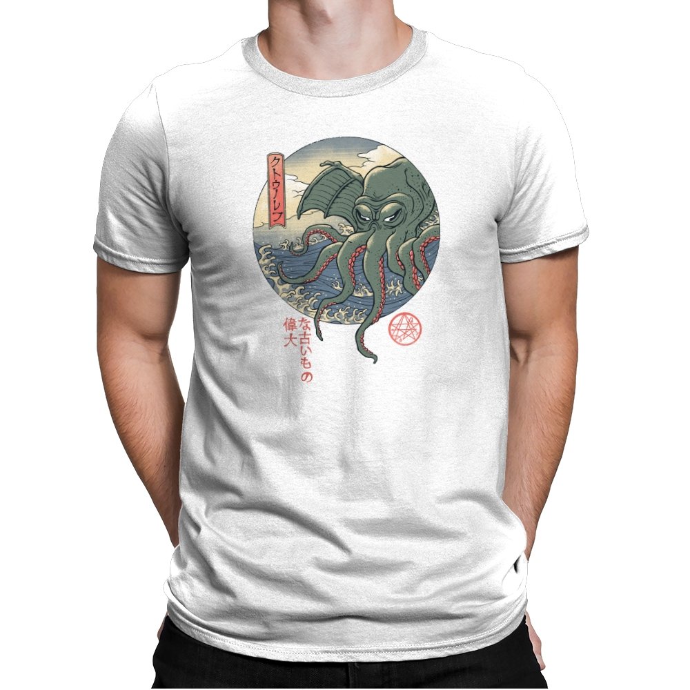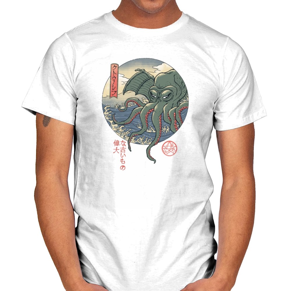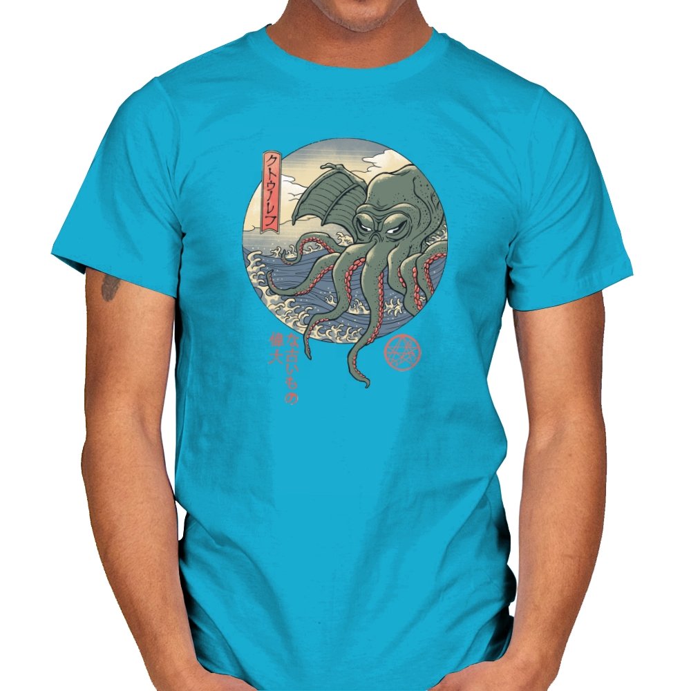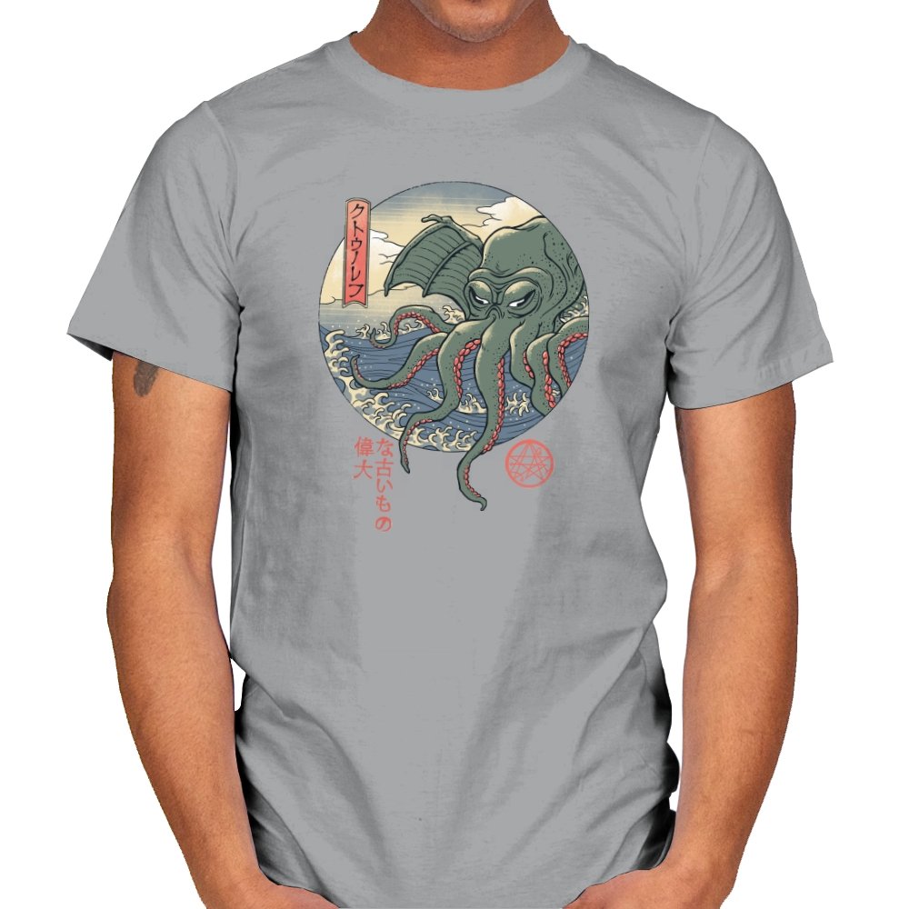 Fans who enjoy cosmic horror and old Japan imagery will spot the mashup instantly. It carries the dry sense of humor that comes from treating the unspeakable as just another sea monster, rendered with elegance instead of gore. Wearing it signals curiosity, deep lore awareness, and a taste for odd beauty.