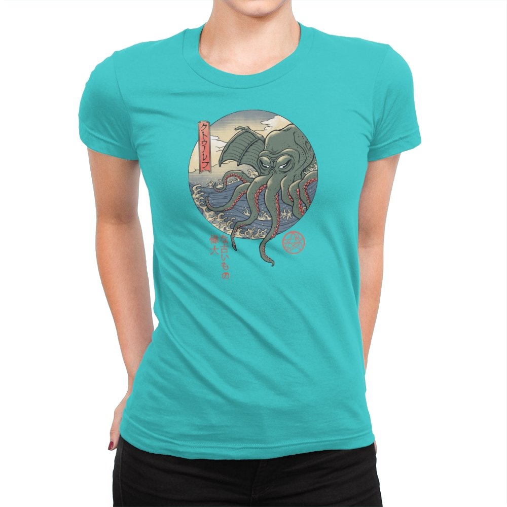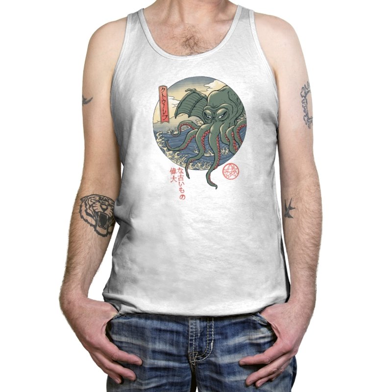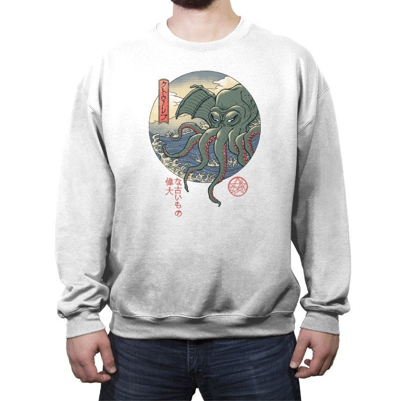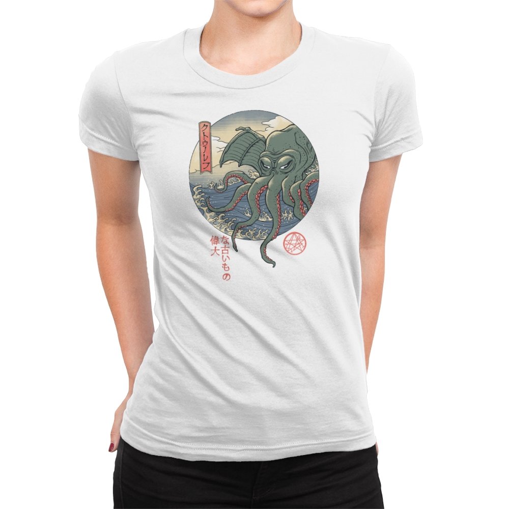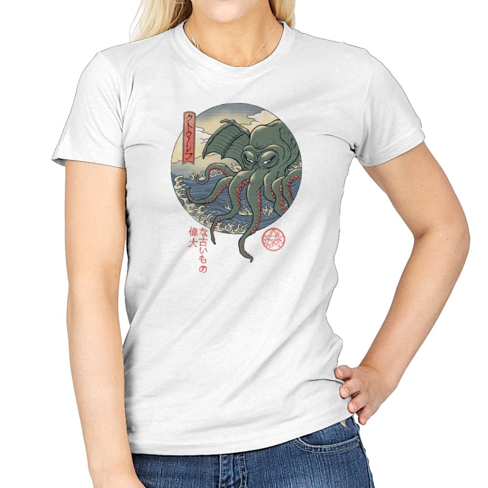 Fans who enjoy cosmic horror and old Japan imagery will spot the mashup instantly. It carries the dry sense of humor that comes from treating the unspeakable as just another sea monster, rendered with elegance instead of gore. Wearing it signals curiosity, deep lore awareness, and a taste for odd beauty.