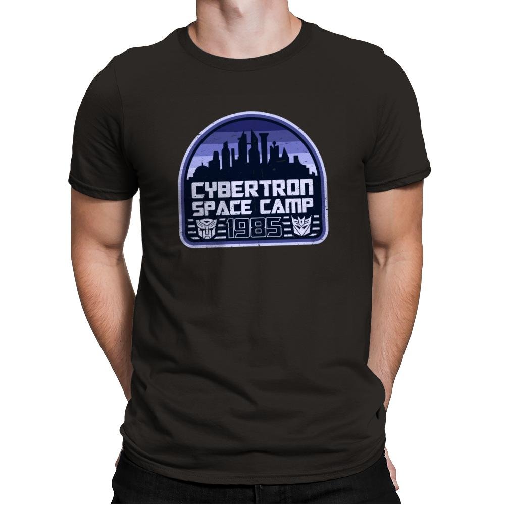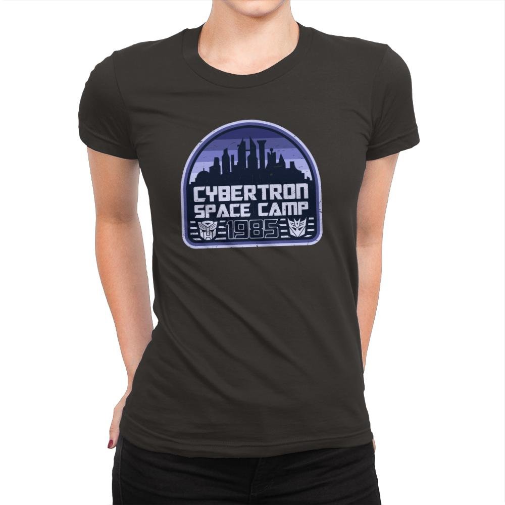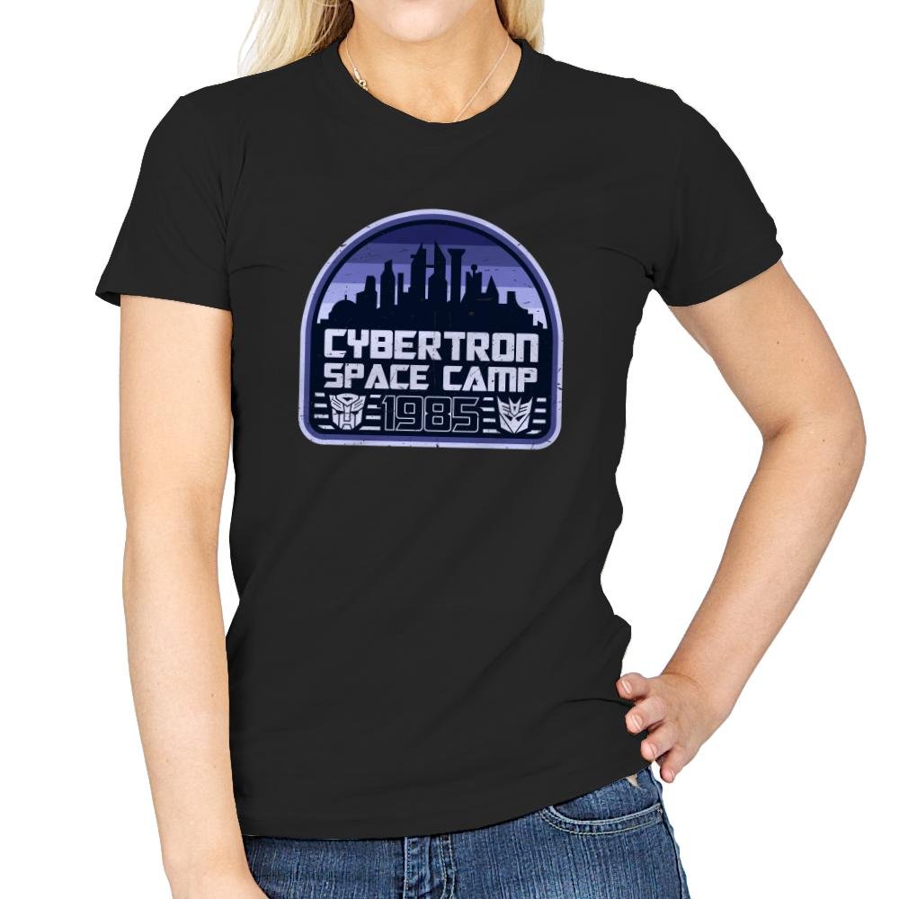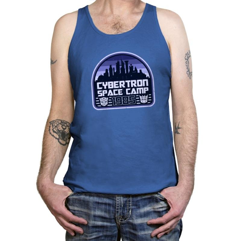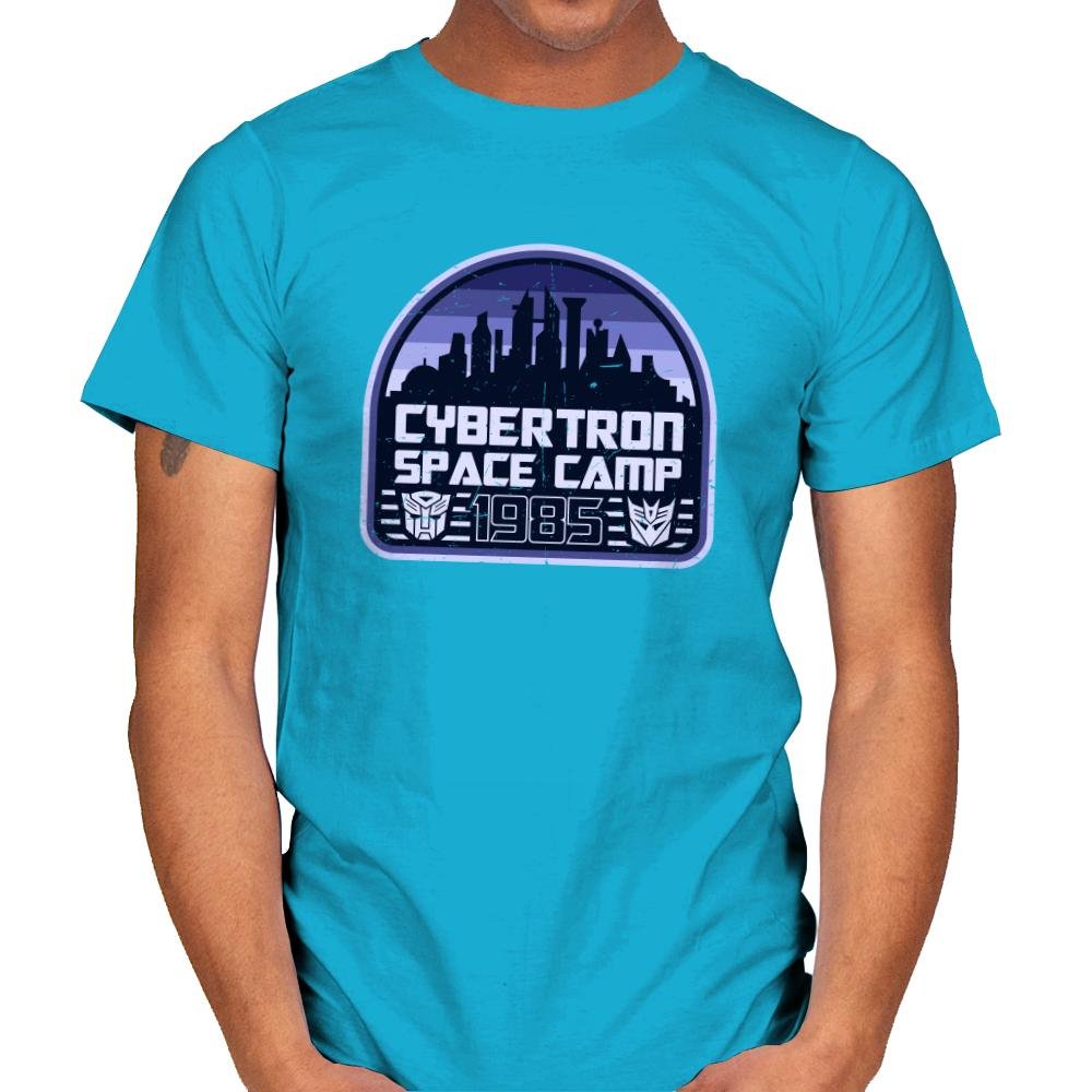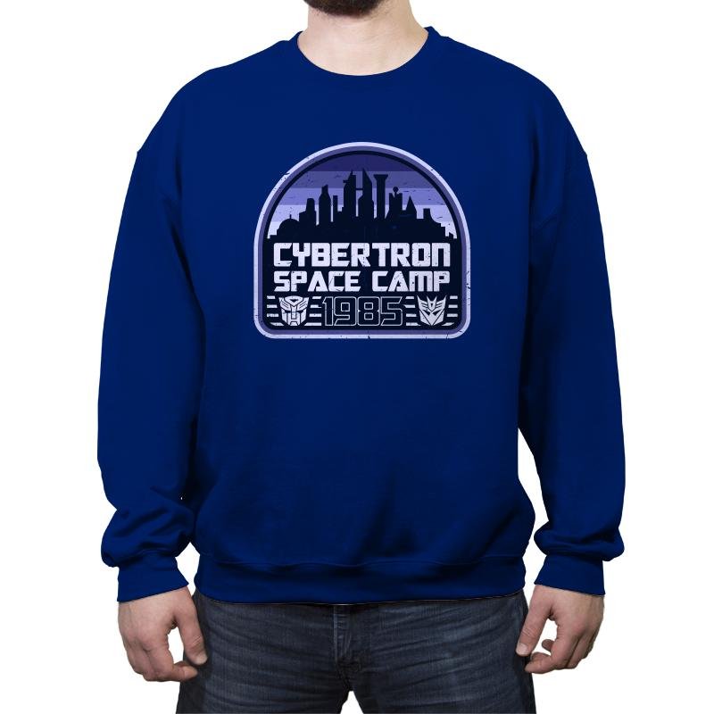 This design plays like a retro space camp badge from a robot ruled world. A futuristic city skyline sits inside a stitched patch shape, stamped with a bold year and mechanical faction icons. The layout feels like an old training program logo for off world recruits. Clean lines and muted tones give it that archived sci fi manual look.