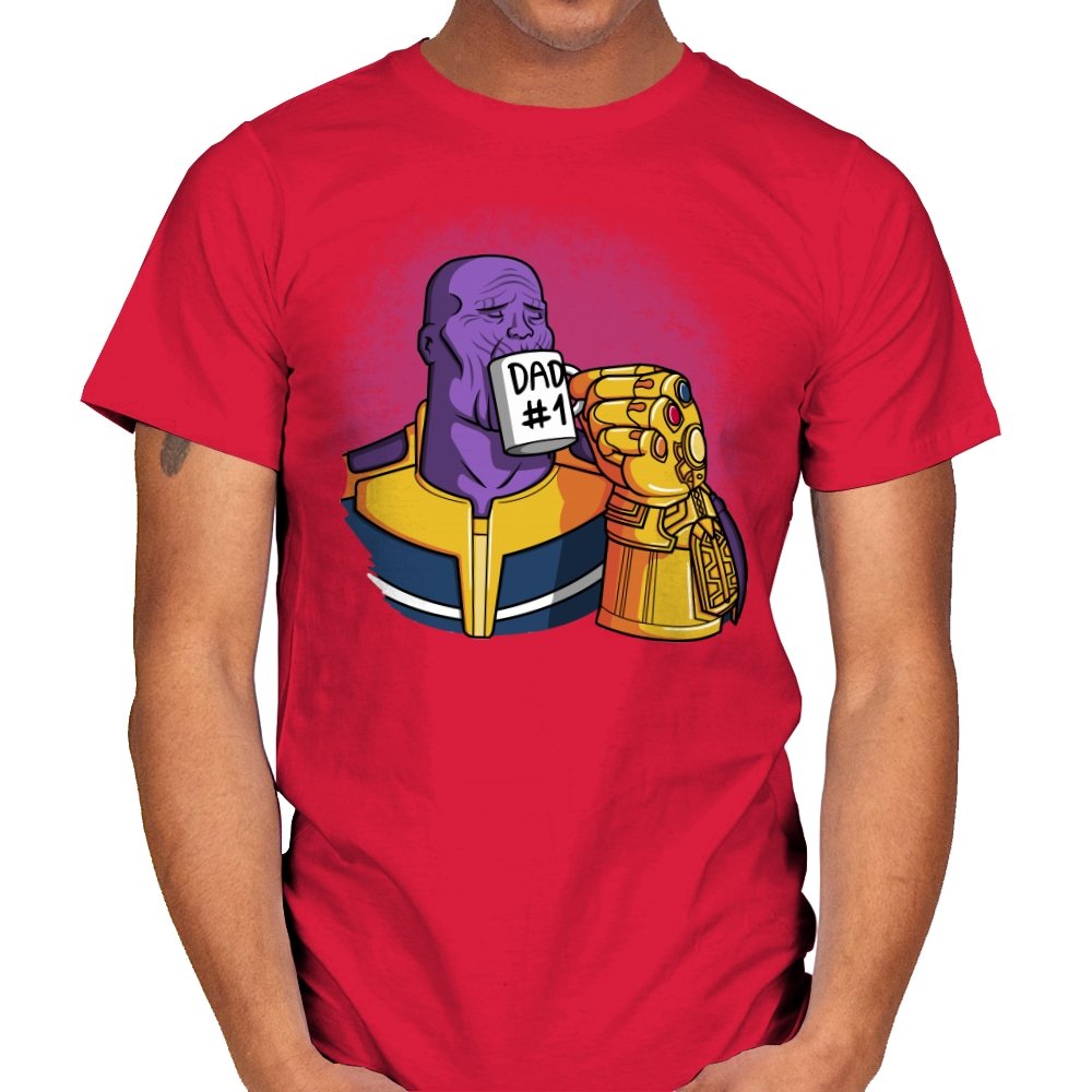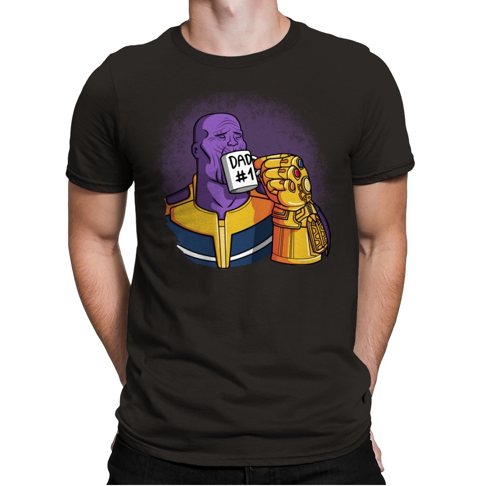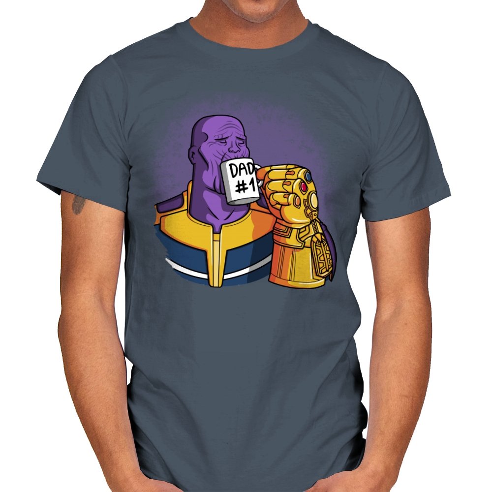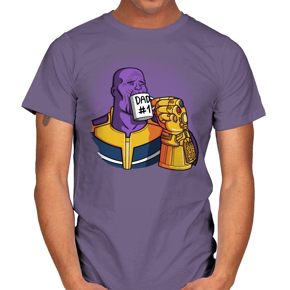 This design flips a cosmic villain archetype into a dry, domestic punchline. A broad-shouldered purple figure sits calmly, wrapped in bold armor tones, raising a mug labeled DAD #1 with a massive golden gauntlet. The contrast between universe-ending power and everyday dad energy is the entire joke. It lands cleanly for anyone who knows how seriously these stories usually take themselves.