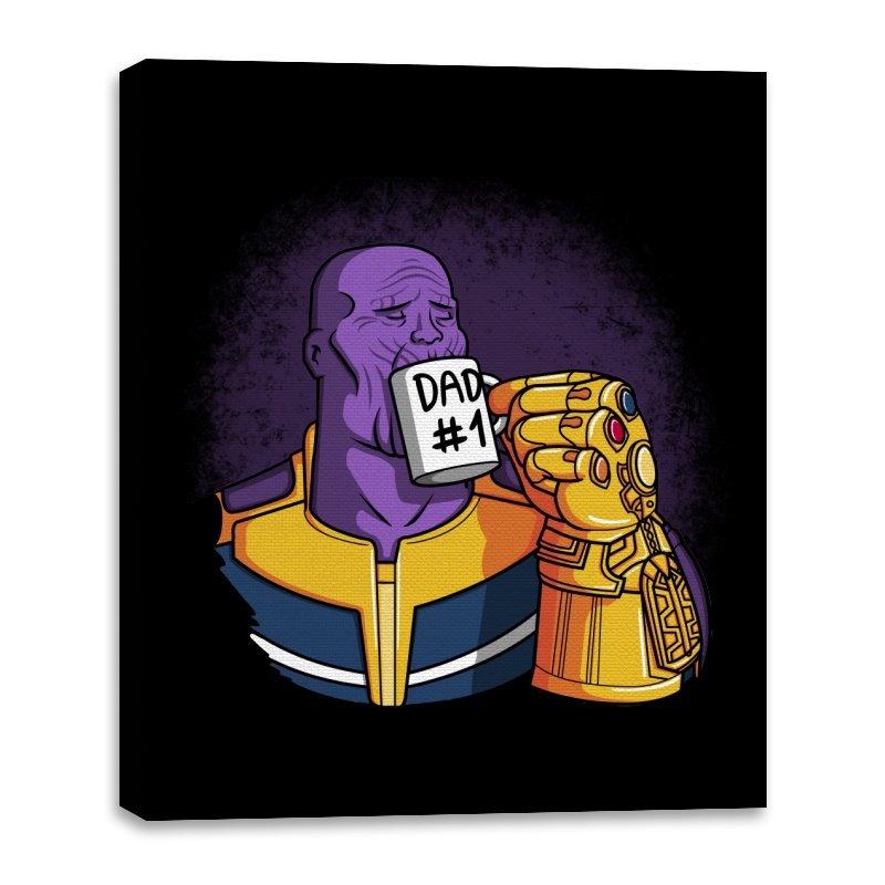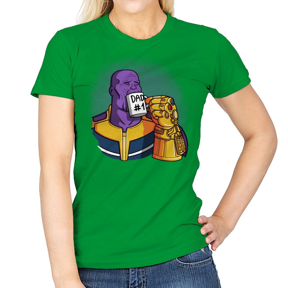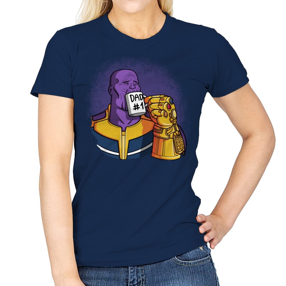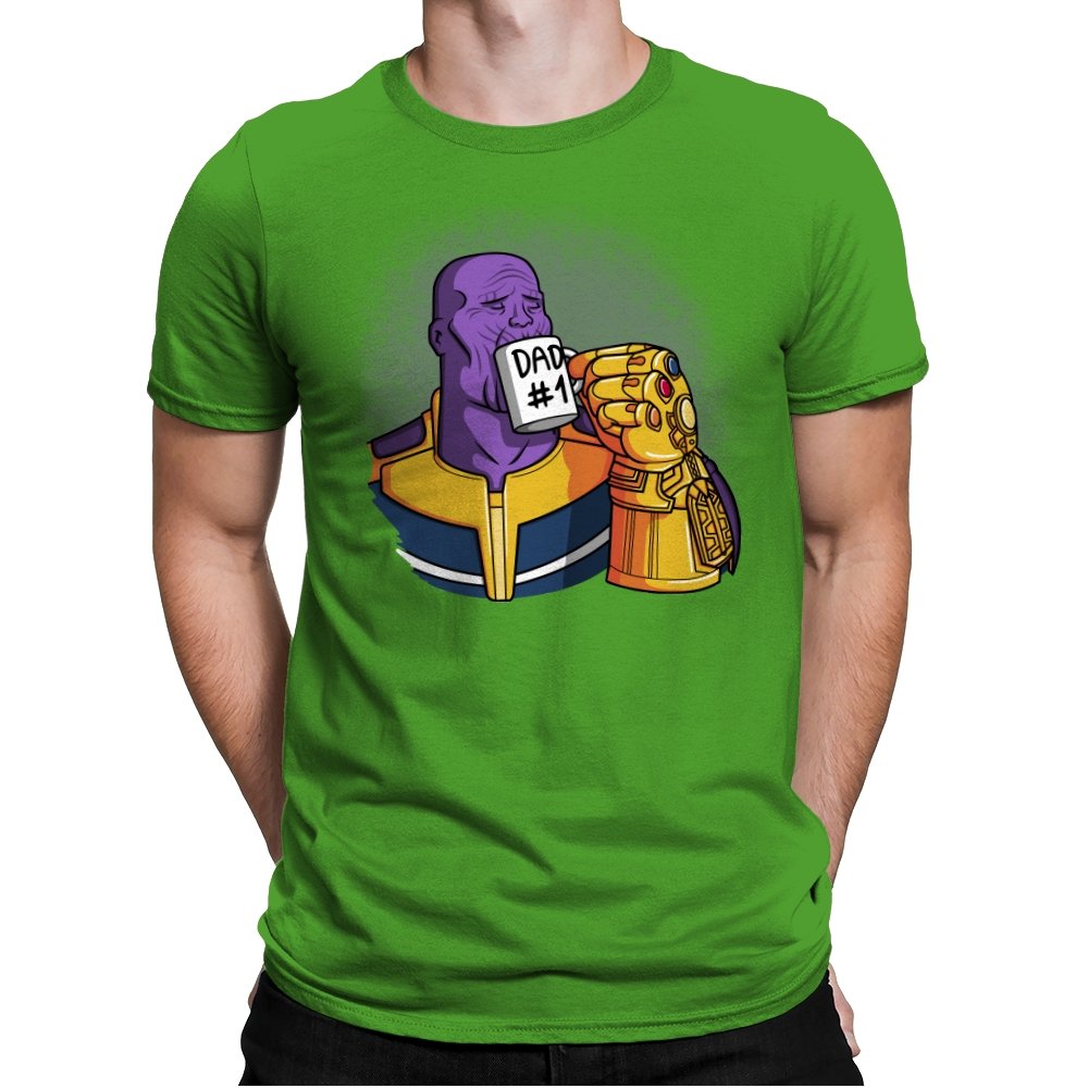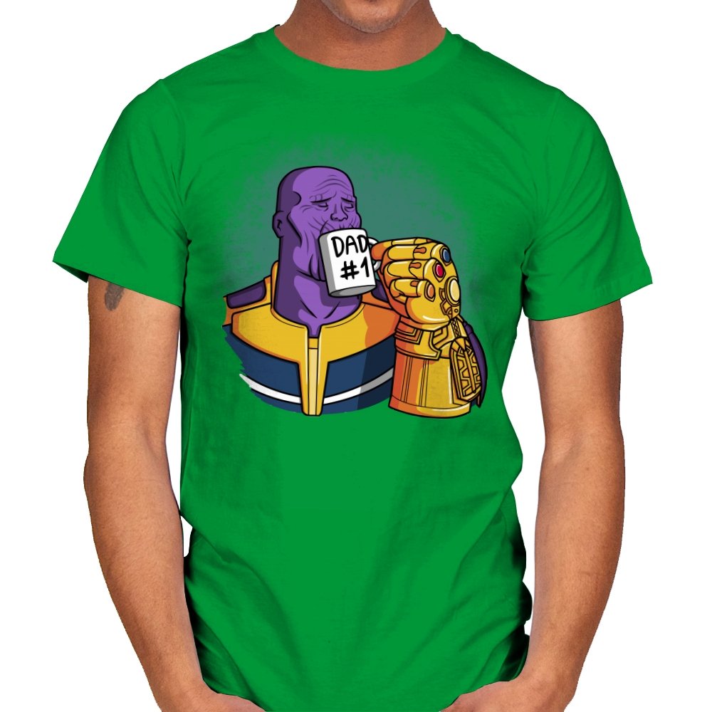 This design flips a cosmic villain archetype into a dry, domestic punchline. A broad-shouldered purple figure sits calmly, wrapped in bold armor tones, raising a mug labeled DAD #1 with a massive golden gauntlet. The contrast between universe-ending power and everyday dad energy is the entire joke. It lands cleanly for anyone who knows how seriously these stories usually take themselves.