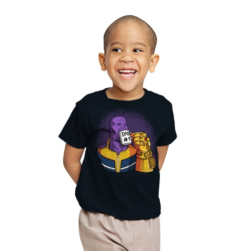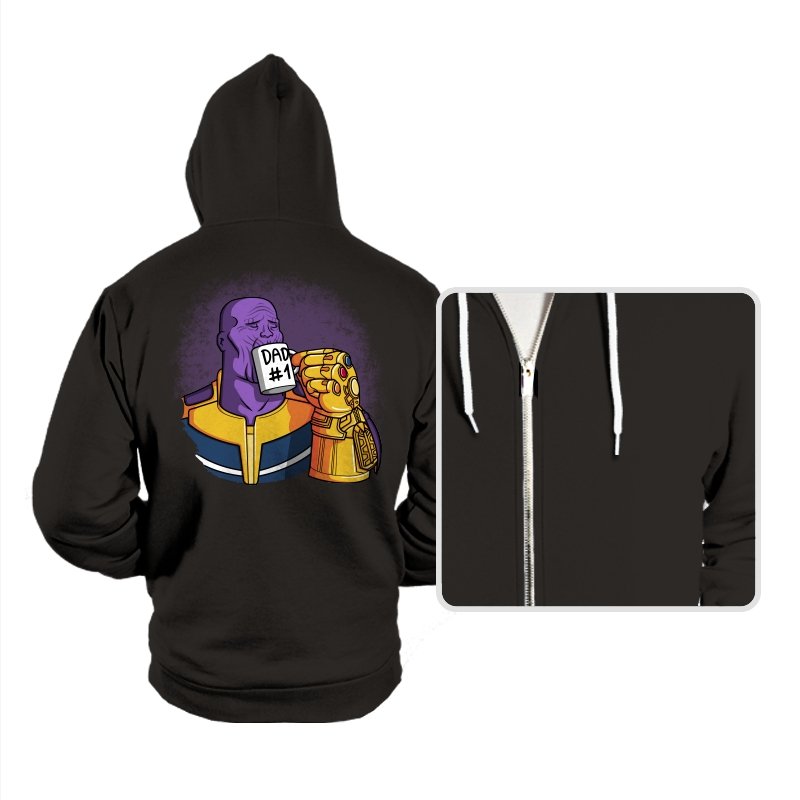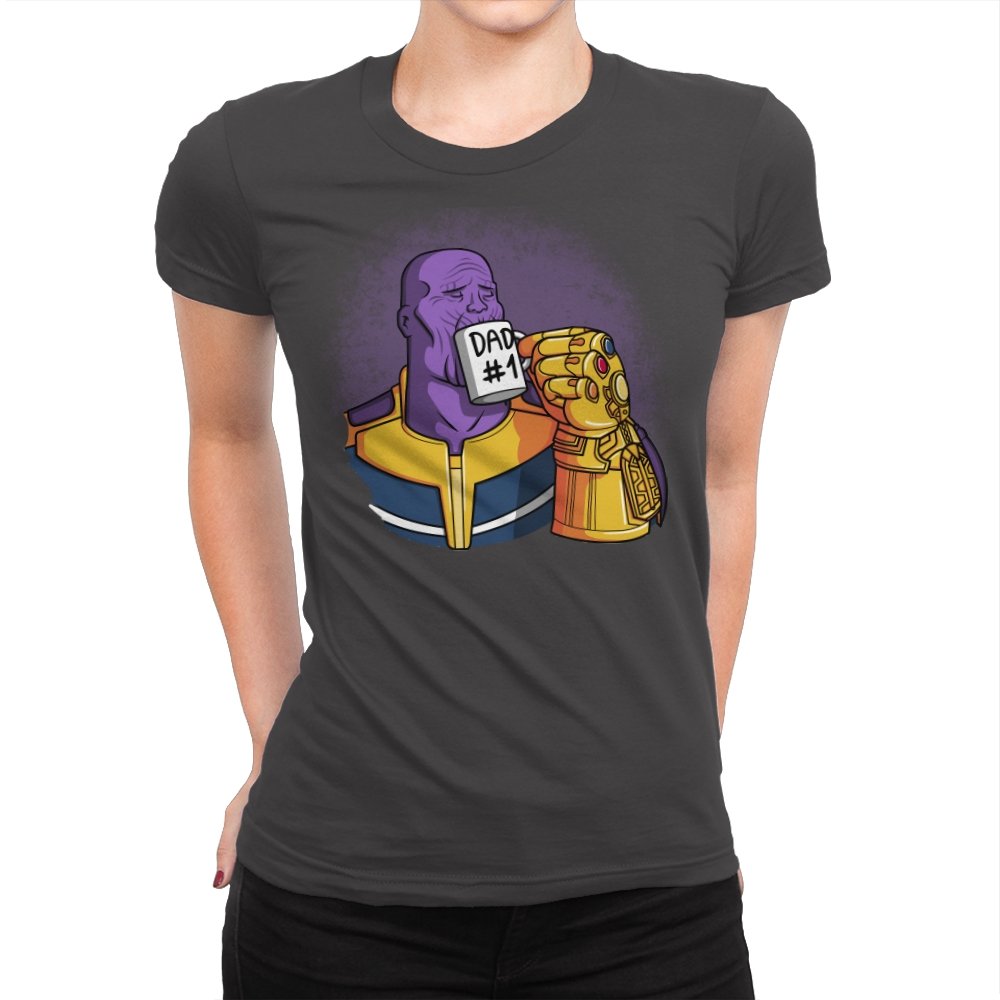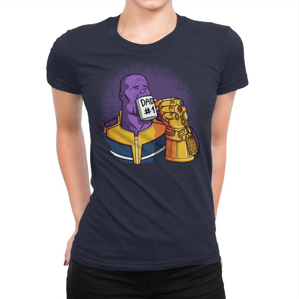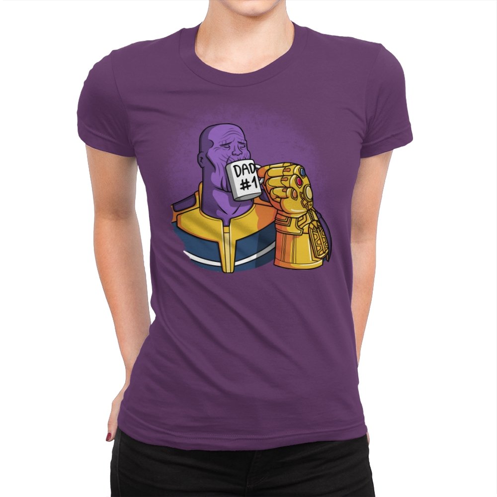 This design flips a cosmic villain archetype into a dry, domestic punchline. A broad-shouldered purple figure sits calmly, wrapped in bold armor tones, raising a mug labeled DAD #1 with a massive golden gauntlet. The contrast between universe-ending power and everyday dad energy is the entire joke. It lands cleanly for anyone who knows how seriously these stories usually take themselves.