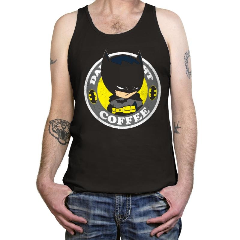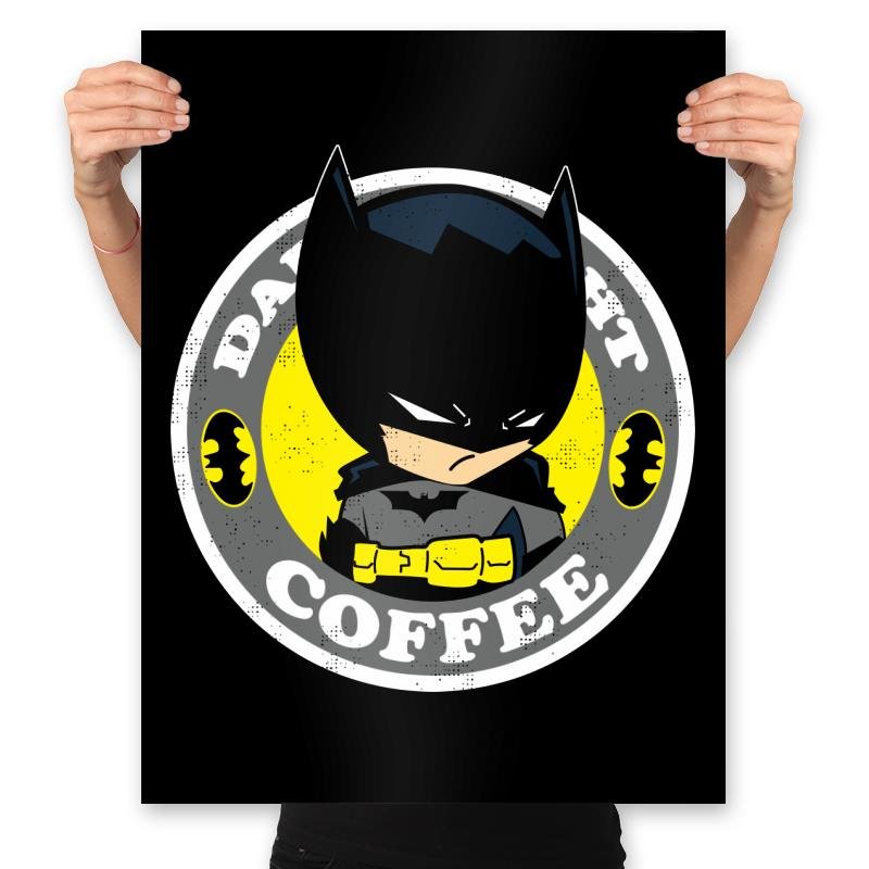 This design imagines the most brooding crime fighter as the unofficial mascot of a coffee shop brand built on grit instead of foam hearts. The circular badge layout echoes a well known cafe logo, but the center is ruled by a tiny, scowling vigilante who looks like he has already had too much caffeine. Yellow utility accents pop against the gray and black palette, and small bat symbols flank the mascot like corporate seals. Anyone fluent in comic book culture and coffee culture will catch the joke instantly.