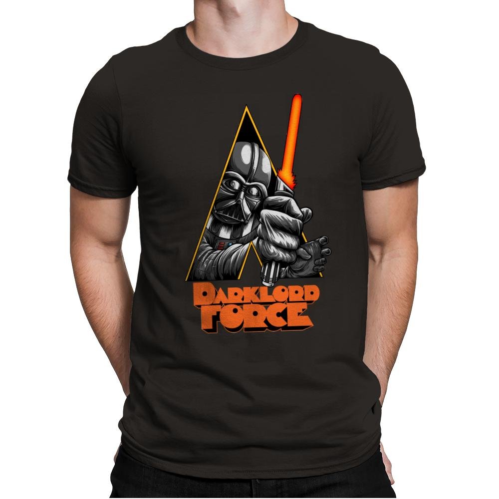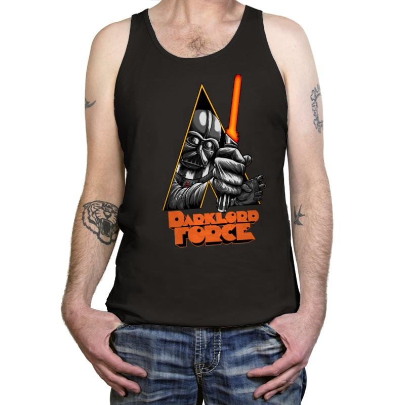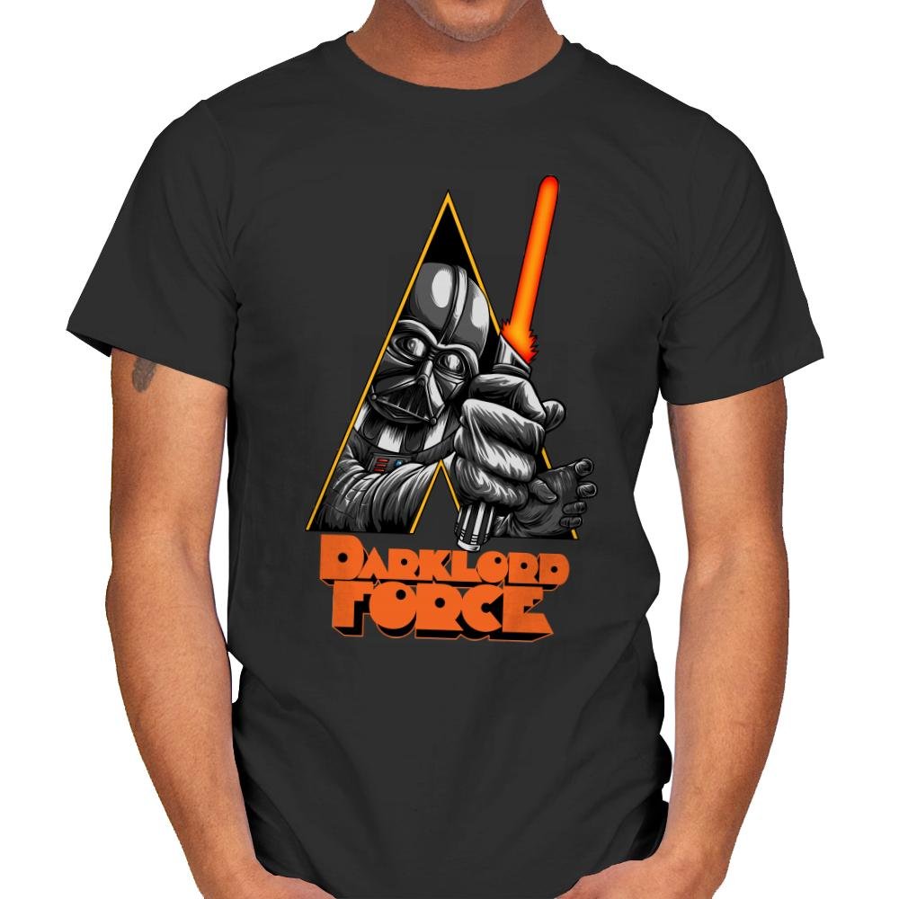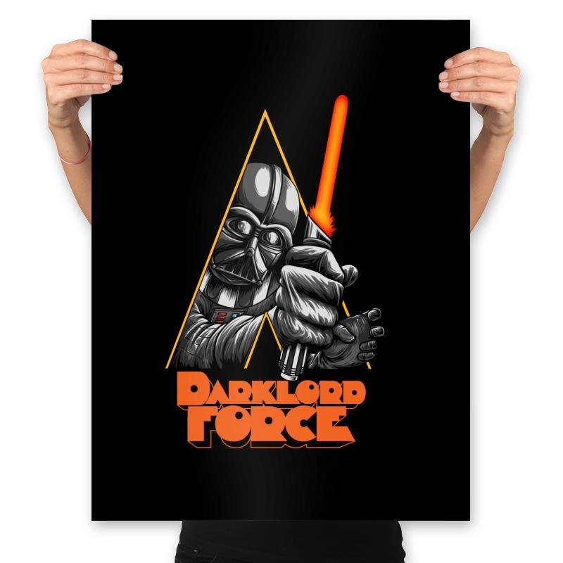 This design fuses space opera menace with the iconic triangle framing and heavy lettering of a notorious cult poster. The masked enforcer pushes forward from the composition, fist wrapped around a blazing energy blade that cuts straight through the negative space. The grayscale rendering gives his armor a cold industrial sheen, while the orange typography below leans into vintage exploitation movie aesthetics. Fans who know both worlds will catch the reference instantly.