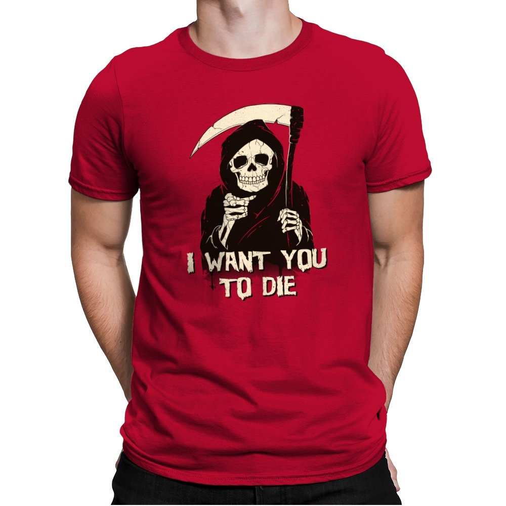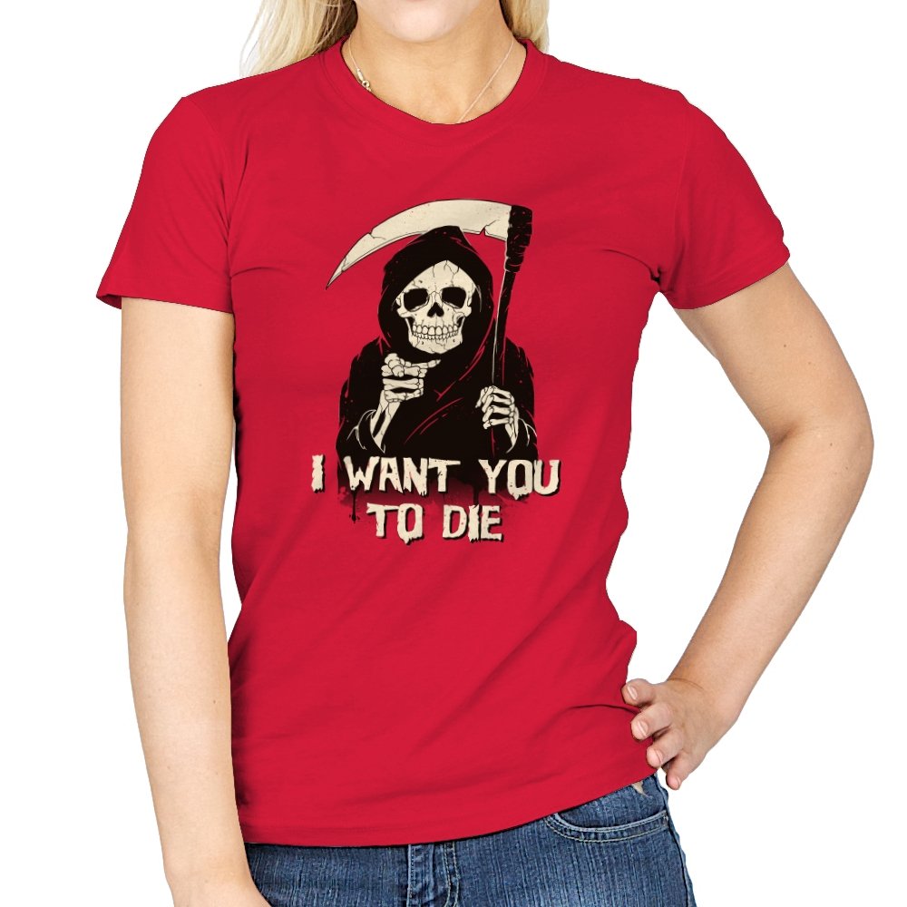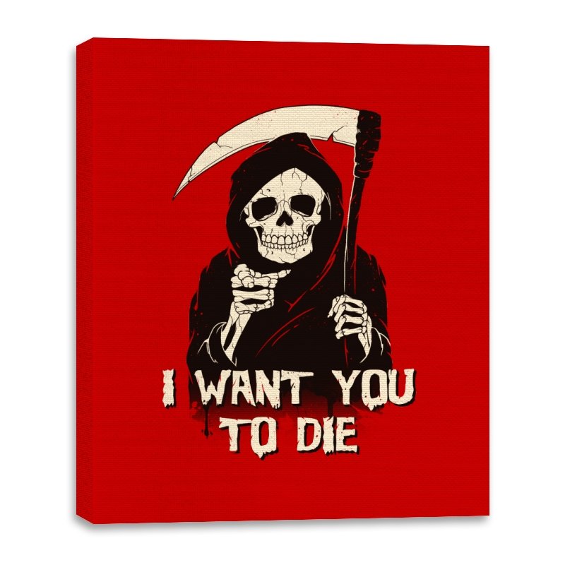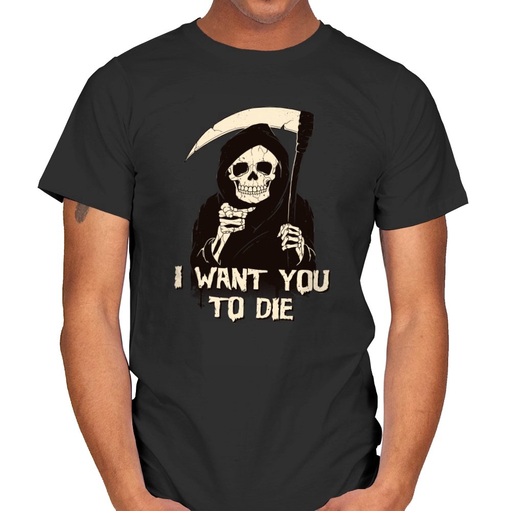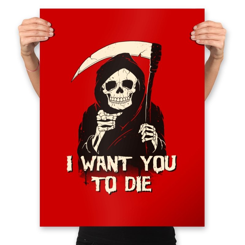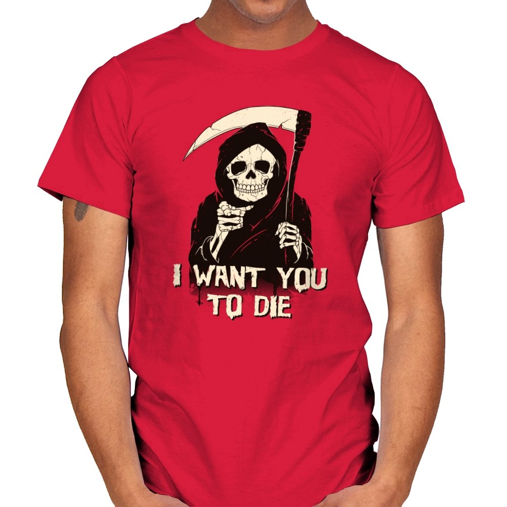 Death Chose You! riffs on the old enlistment poster by swapping the recruiter for the reaper. A grinning skull in a black hood points straight at the viewer while a scythe rises over one shoulder. The background is a flat, aggressive red that makes the bone and cloak pop without any fancy effects. Thick, distressed lettering beneath gives the message a pulp horror bite that feels more darkly funny than grim.