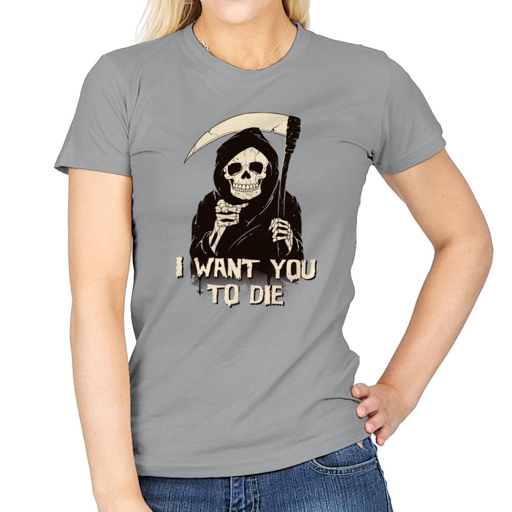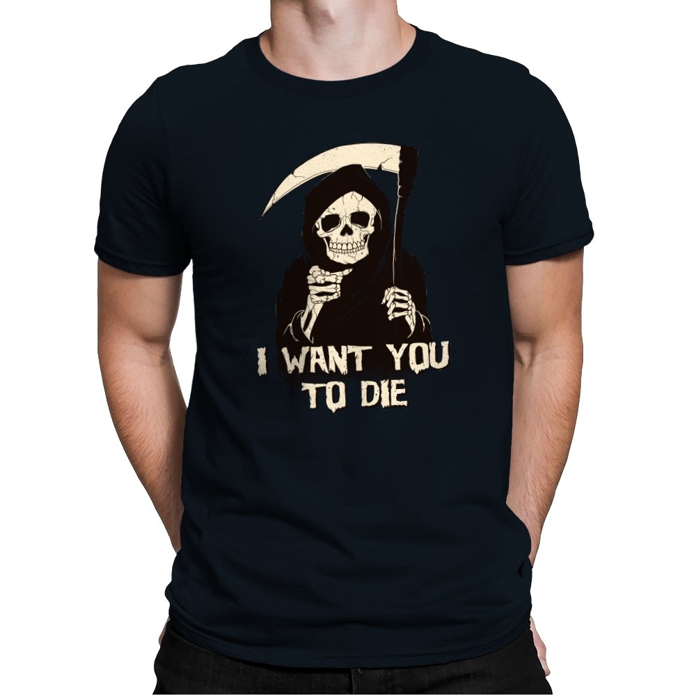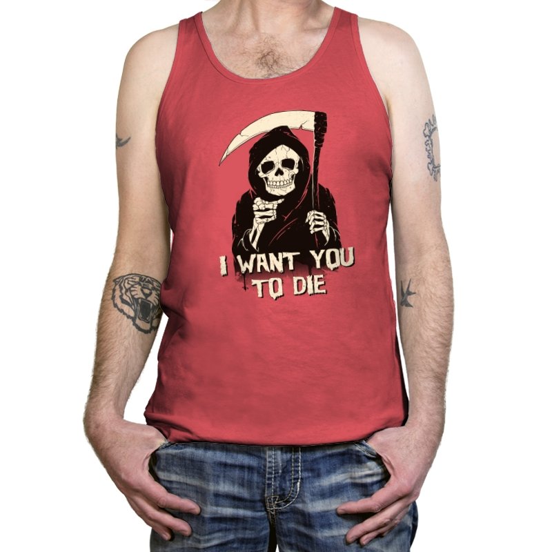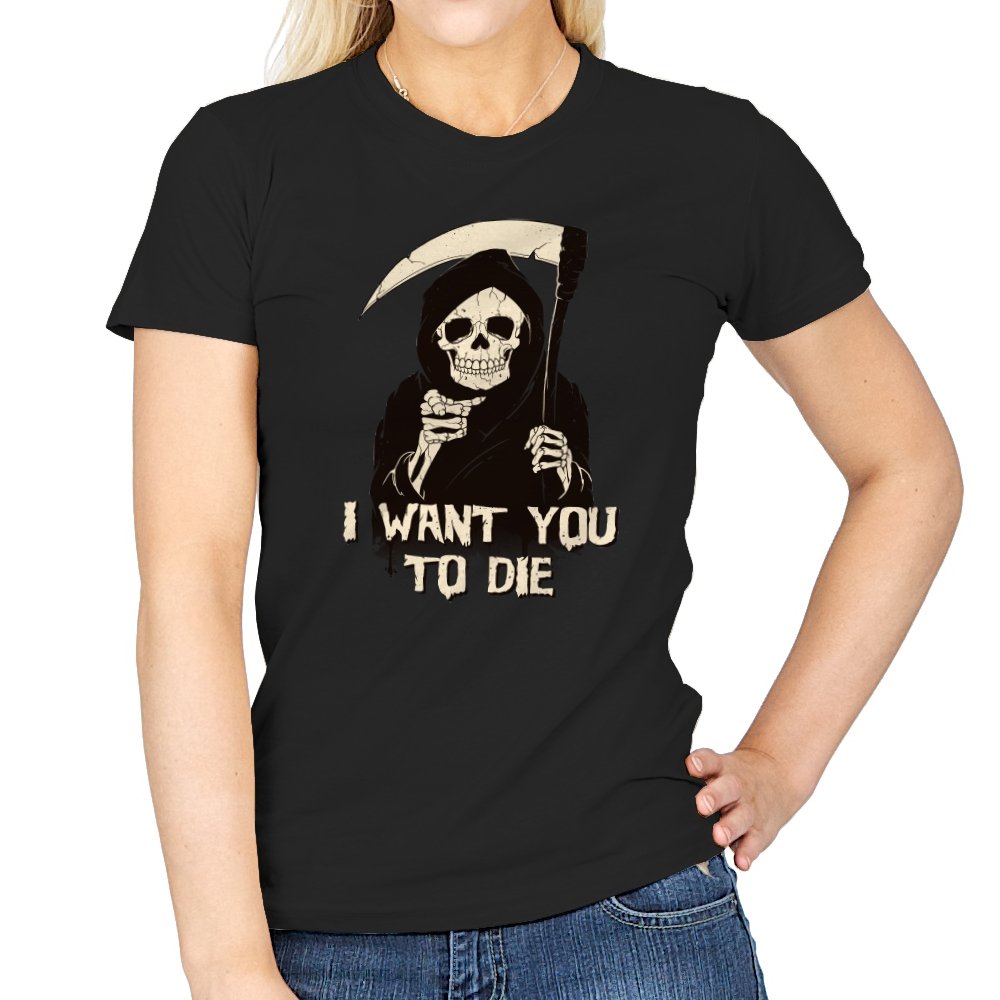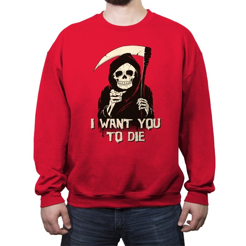 Death Chose You! riffs on the old enlistment poster by swapping the recruiter for the reaper. A grinning skull in a black hood points straight at the viewer while a scythe rises over one shoulder. The background is a flat, aggressive red that makes the bone and cloak pop without any fancy effects. Thick, distressed lettering beneath gives the message a pulp horror bite that feels more darkly funny than grim.