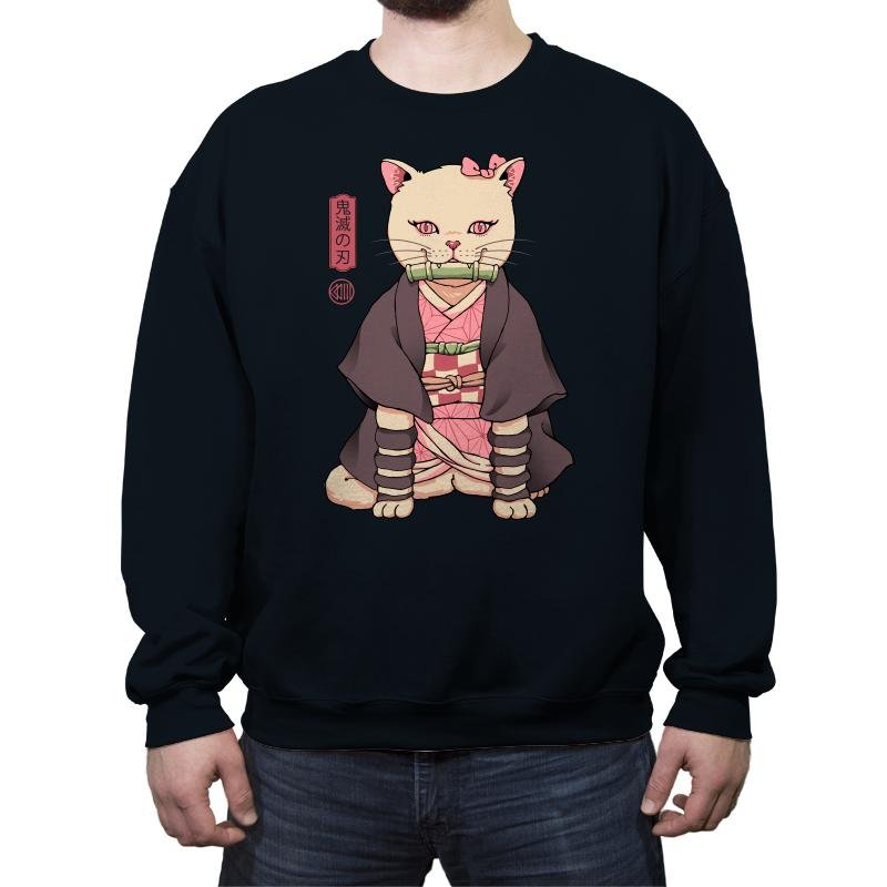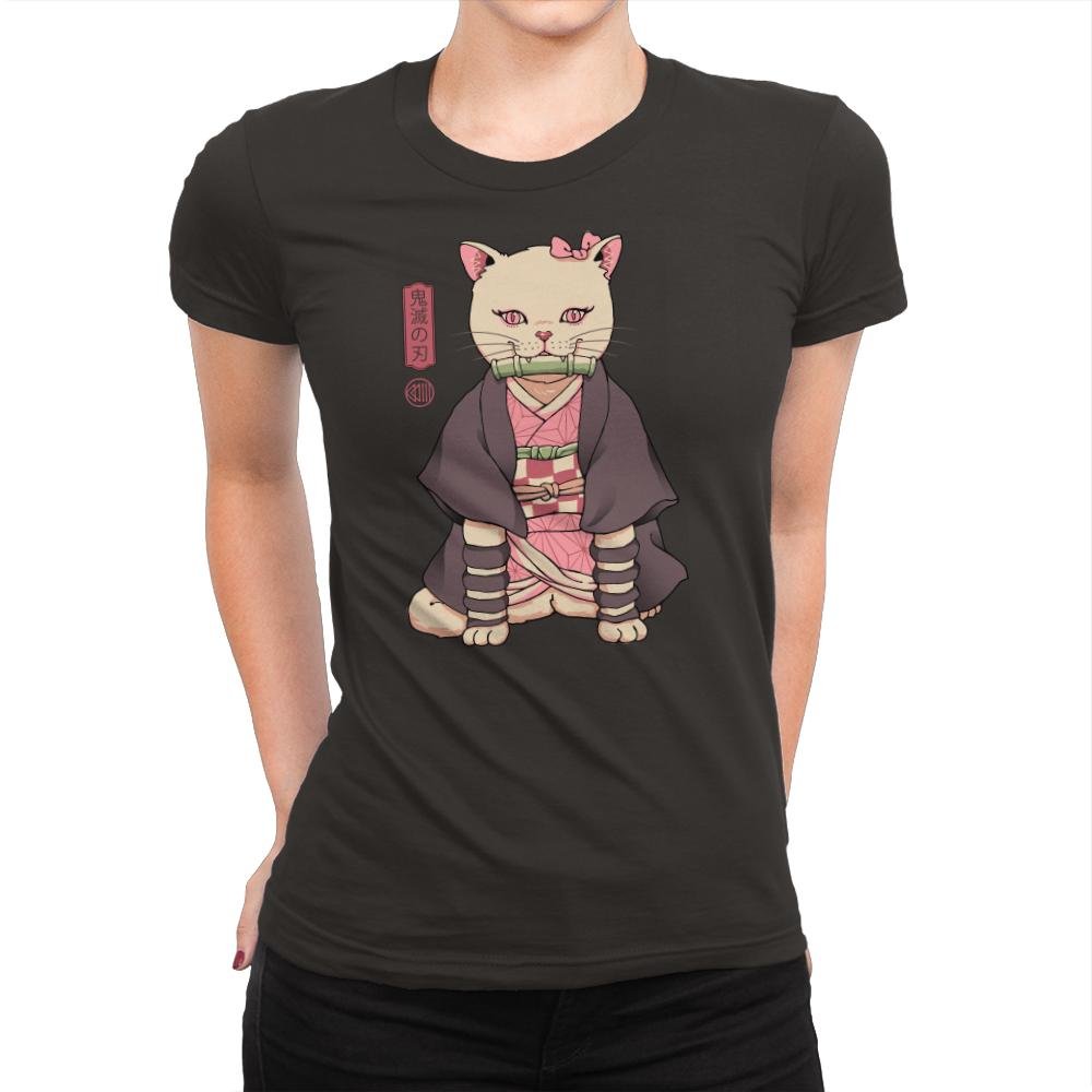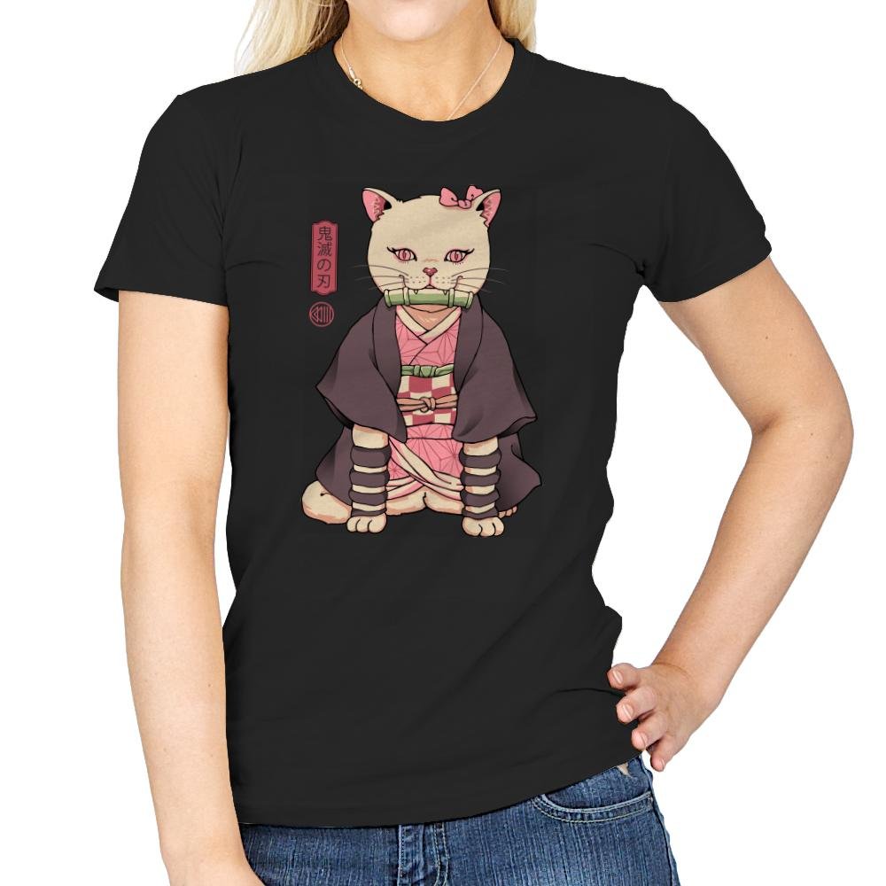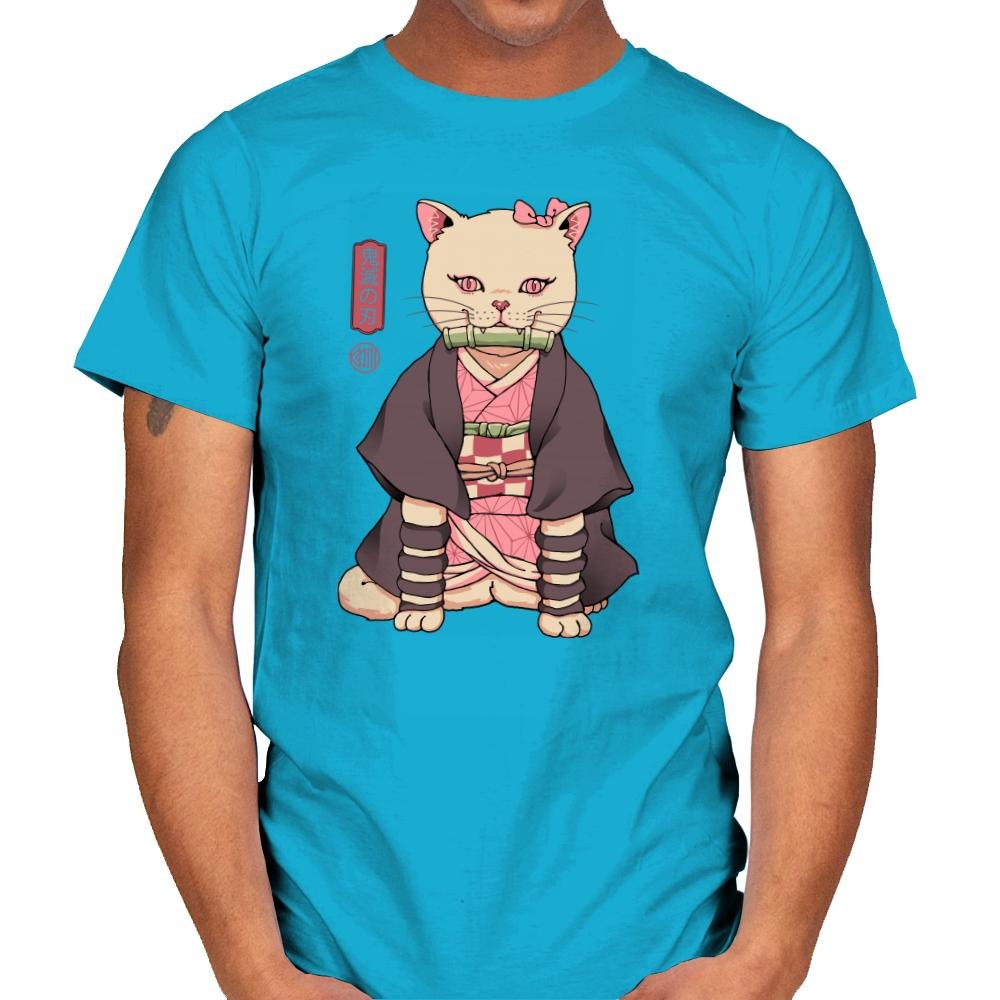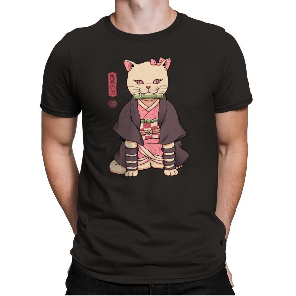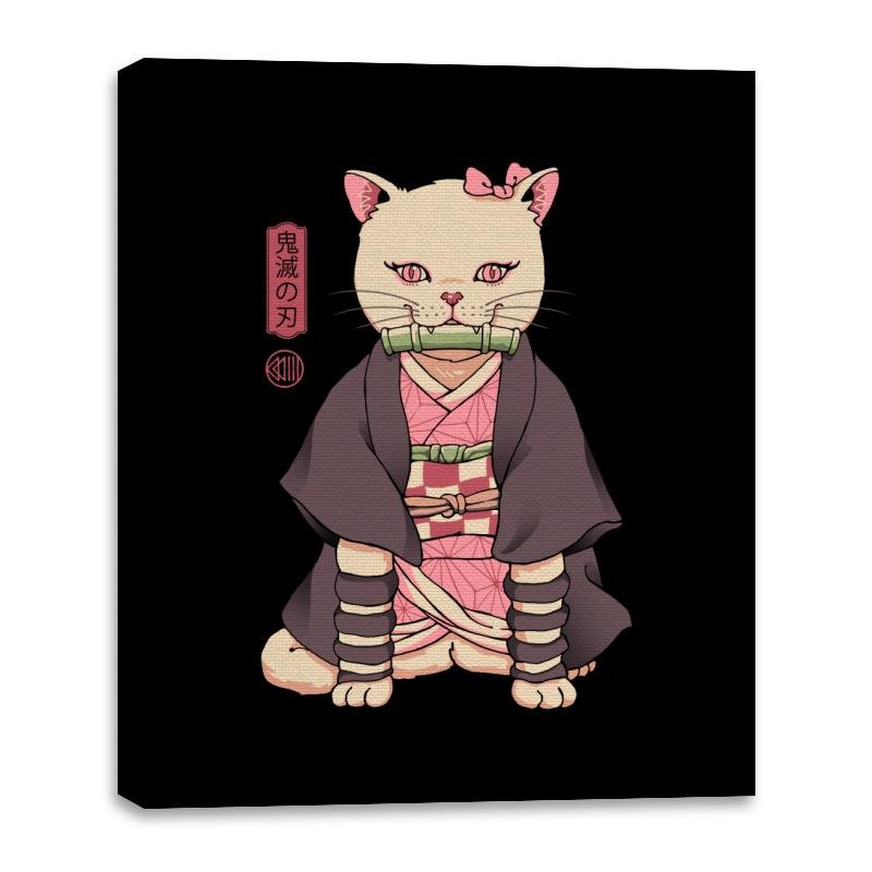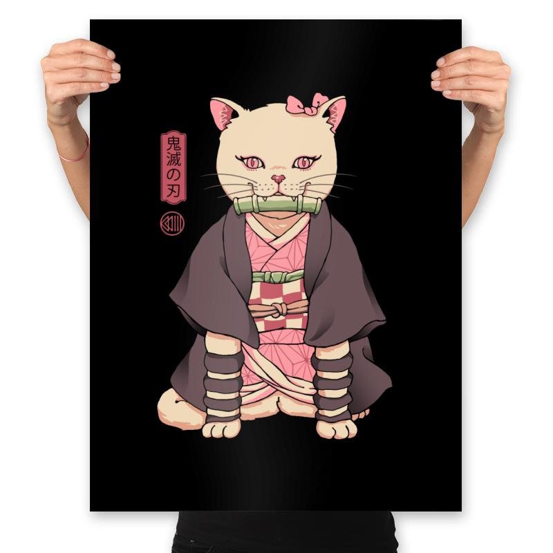 This design blends a familiar demon slayer archetype with a housecat’s unbothered posture. The cat sits perfectly still in layered robes, with a bamboo gag balanced between small fangs. Pink eyes and a matching bow nod to the character’s quiet intensity, while the kanji panel beside her reinforces the reference for anyone who reads it. The style treats the mashup seriously, as if this feline version always existed.