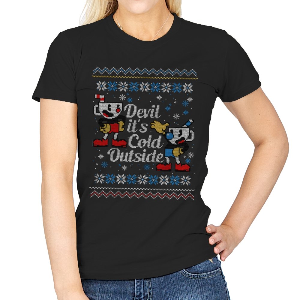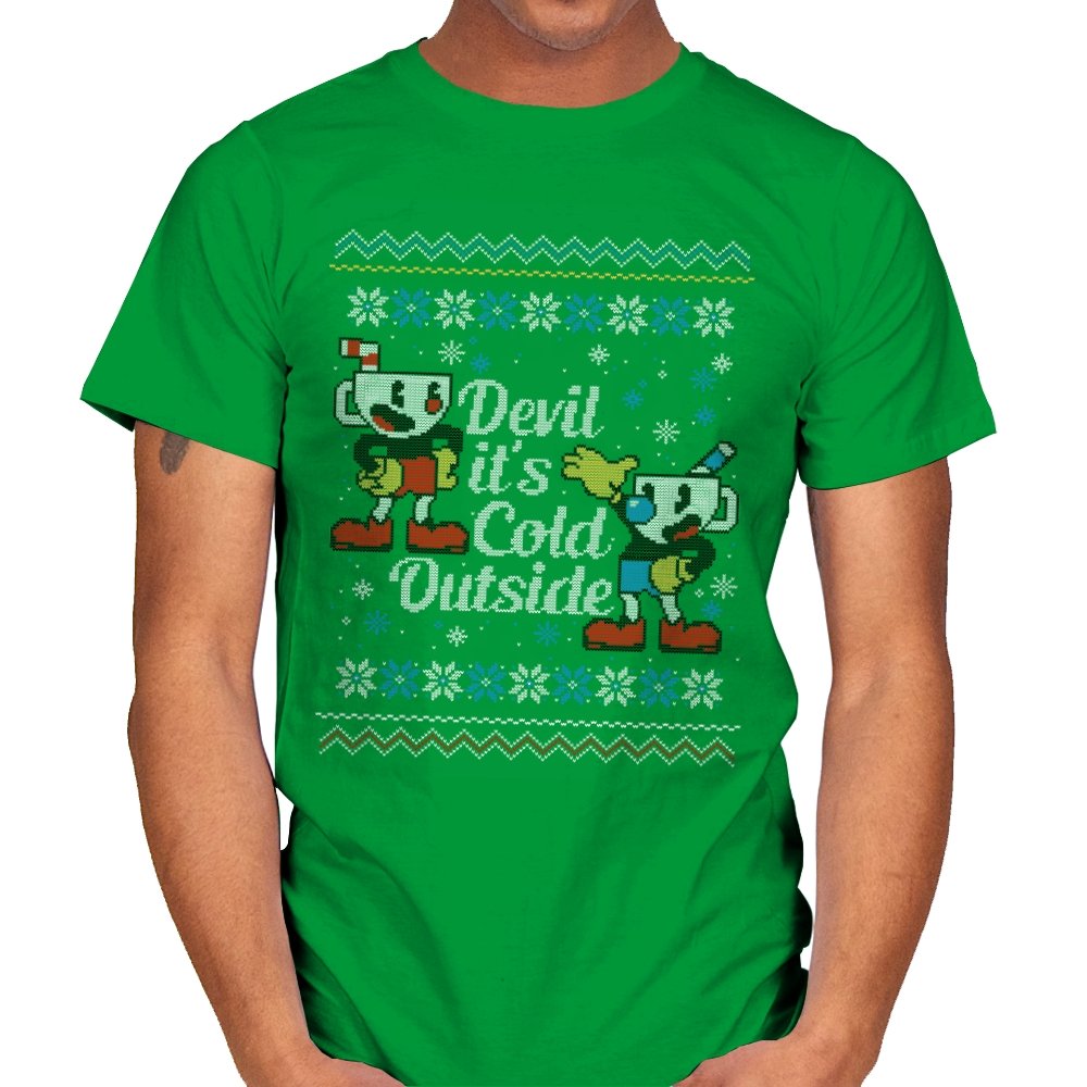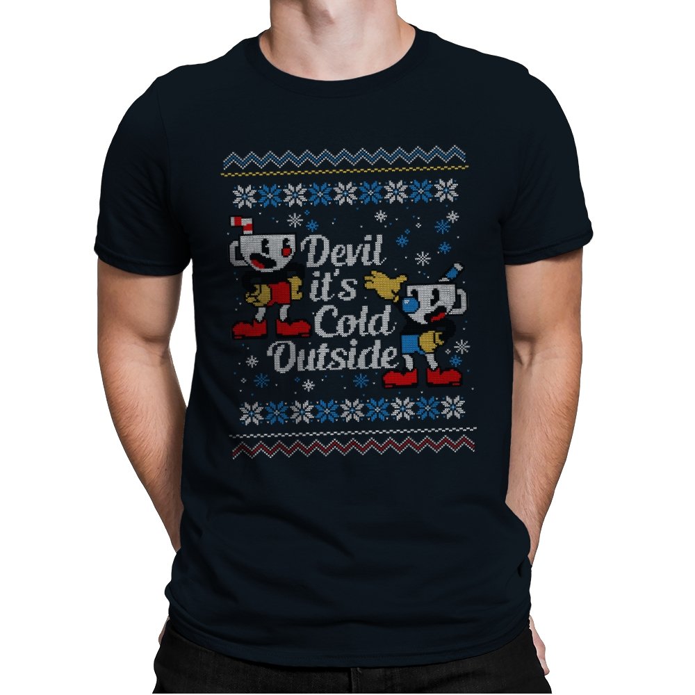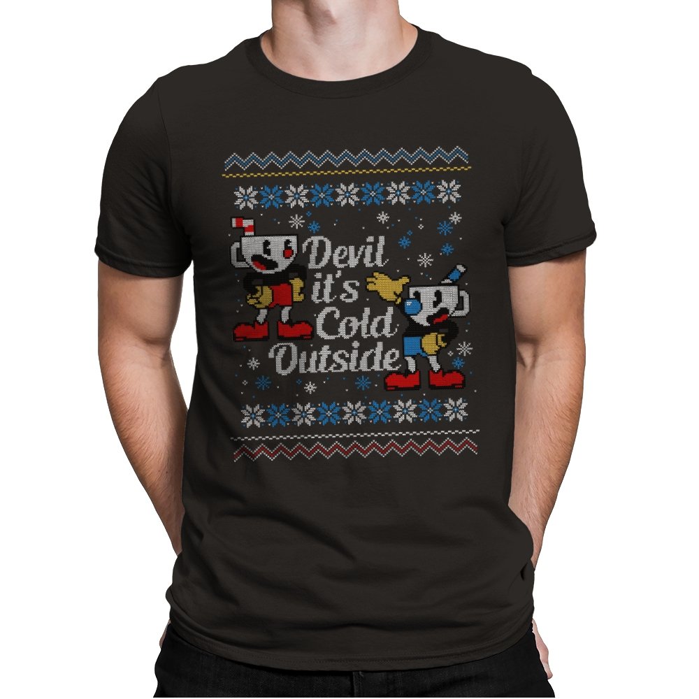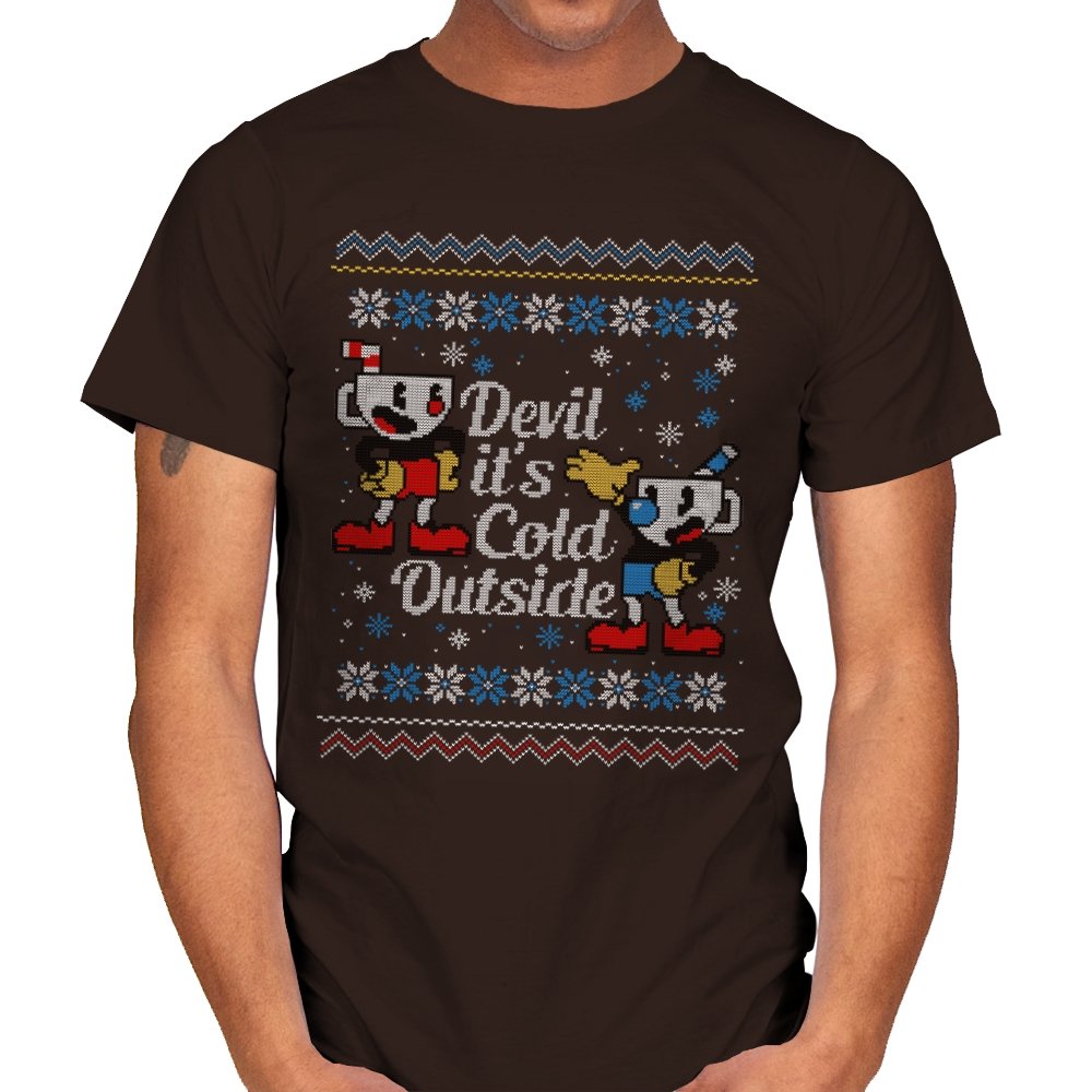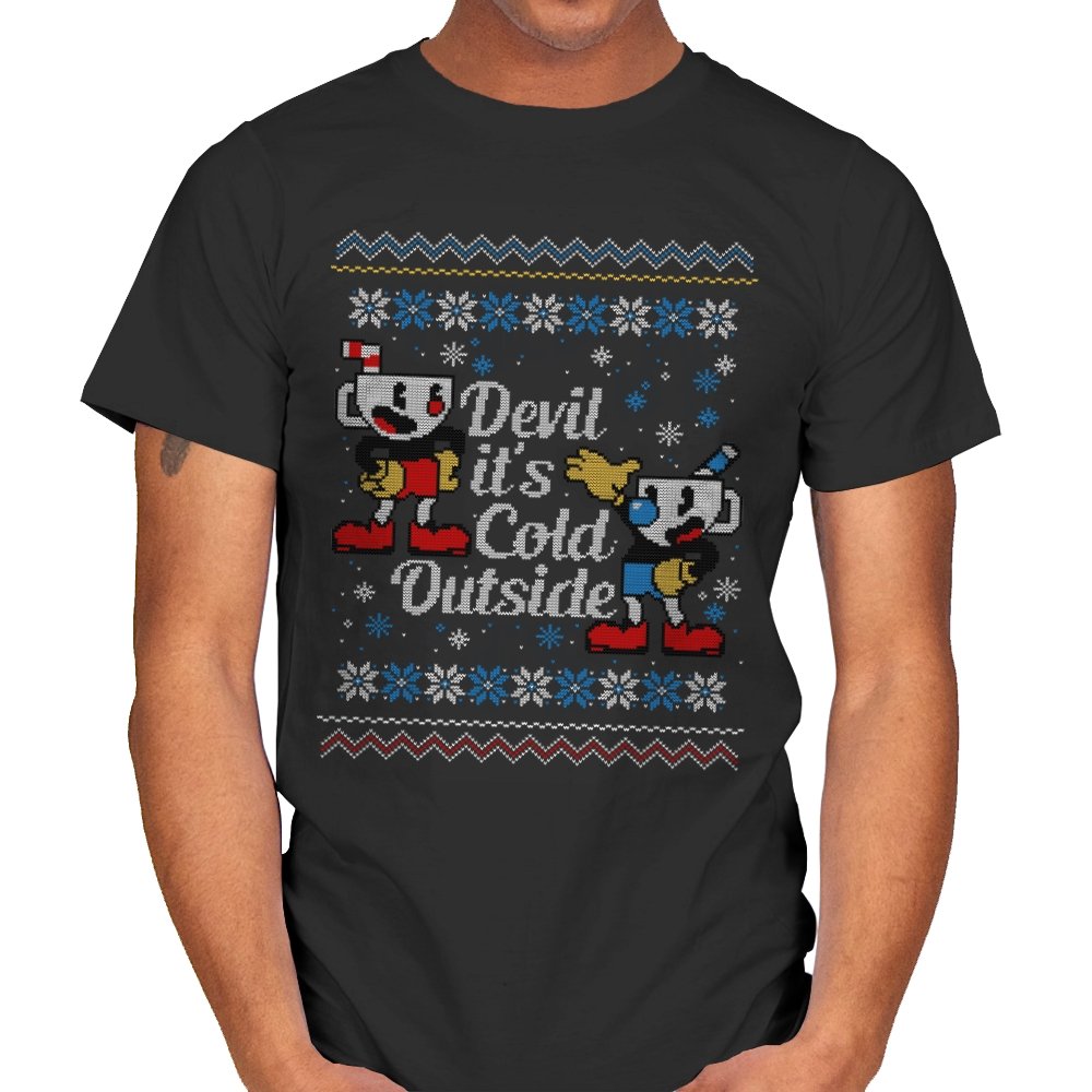 This design drops two vintage cartoon cup brothers into ugly holiday sweater style. Faux knit stitches outline their rubber hose limbs, bright gloves, and oversized boots as snowflakes scatter around them. The stitched line twists a classic winter lyric into something slightly more infernal which fans of the game will clock without hesitation. The whole scene feels like a 1930s short film that wandered into December.