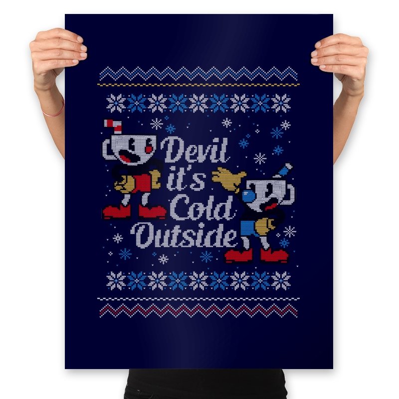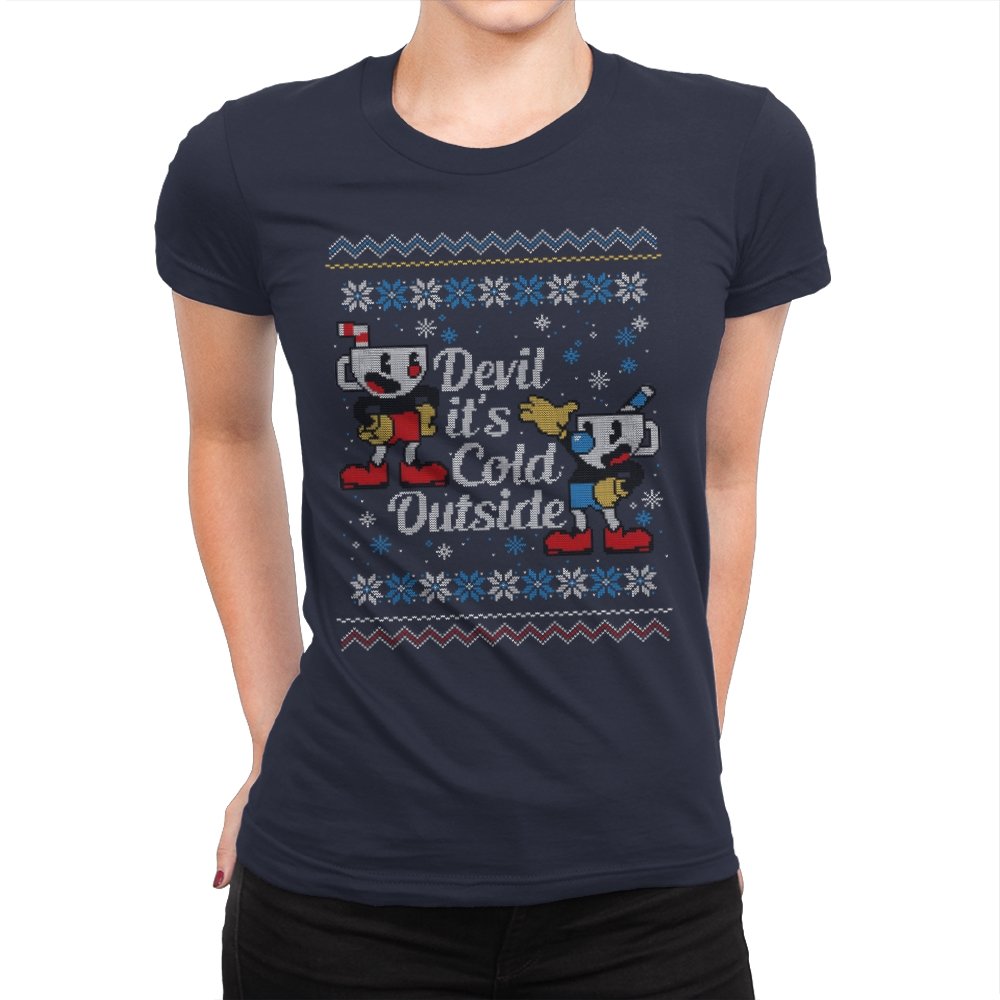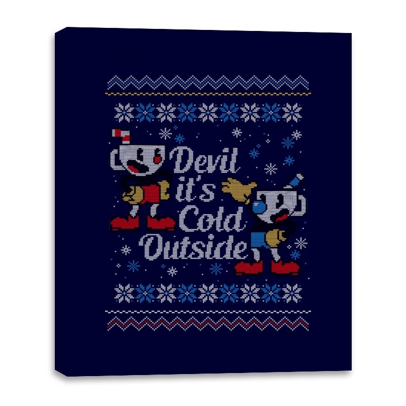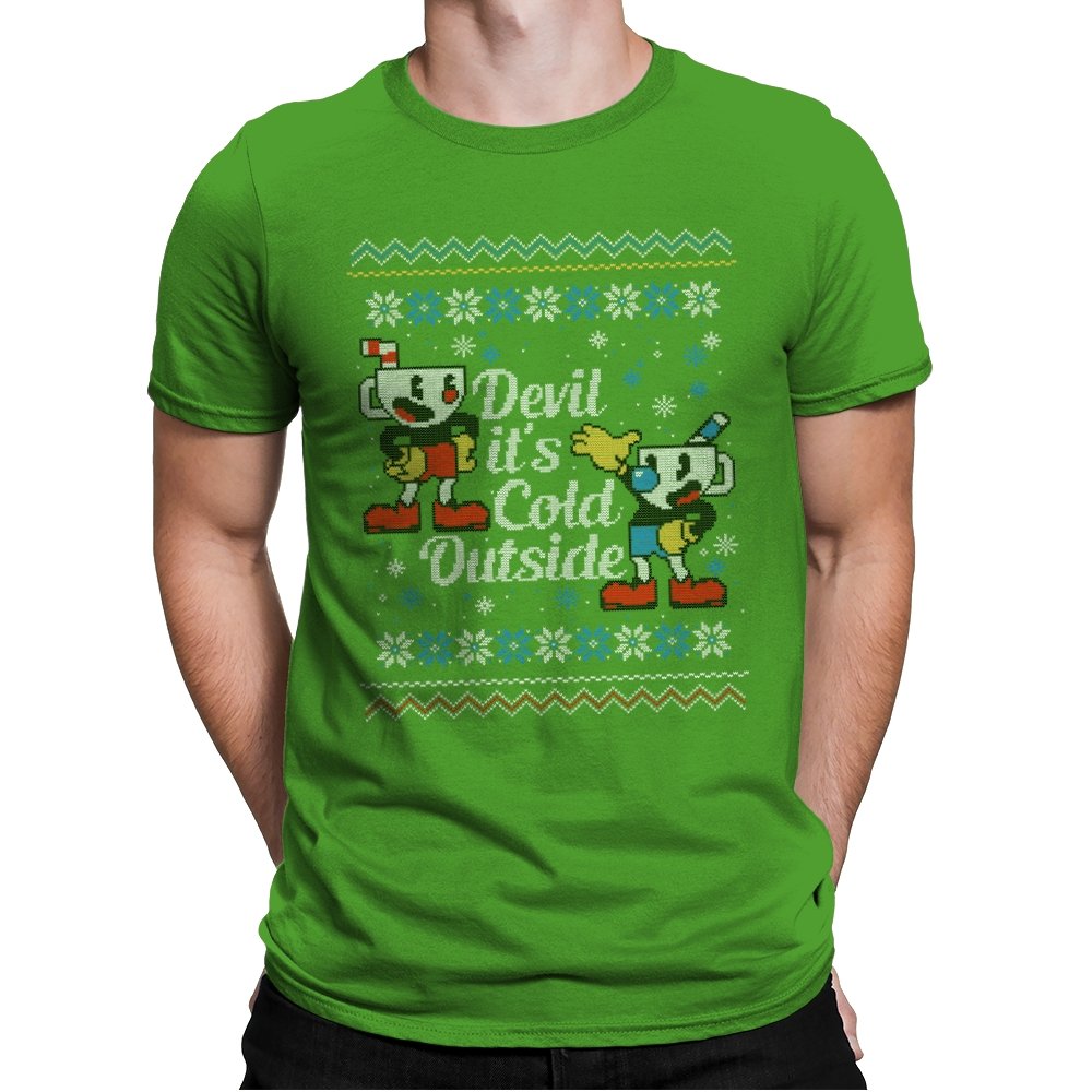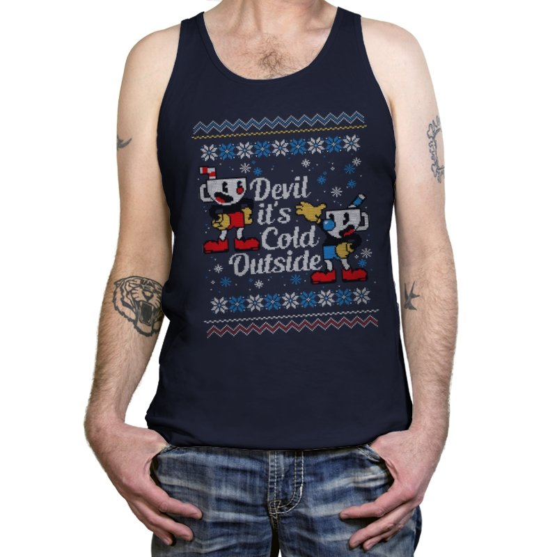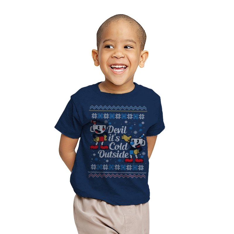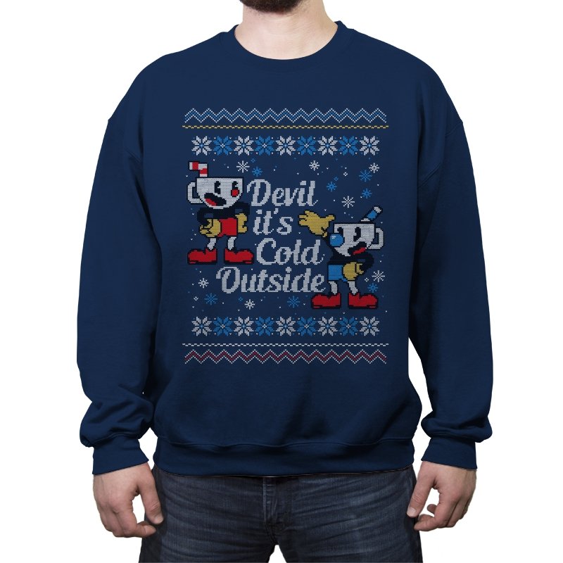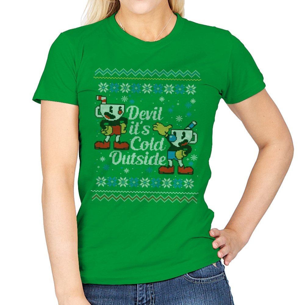 This design drops two vintage cartoon cup brothers into ugly holiday sweater style. Faux knit stitches outline their rubber hose limbs, bright gloves, and oversized boots as snowflakes scatter around them. The stitched line twists a classic winter lyric into something slightly more infernal which fans of the game will clock without hesitation. The whole scene feels like a 1930s short film that wandered into December.