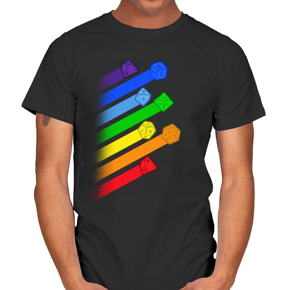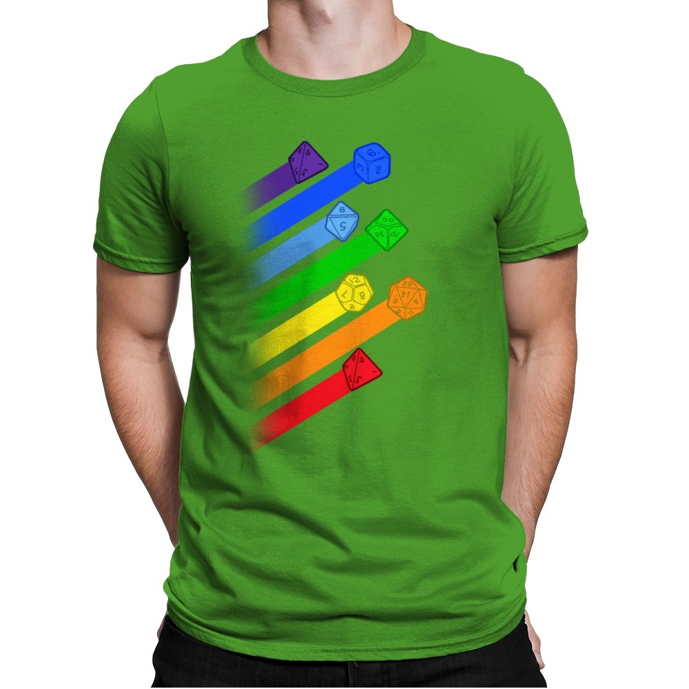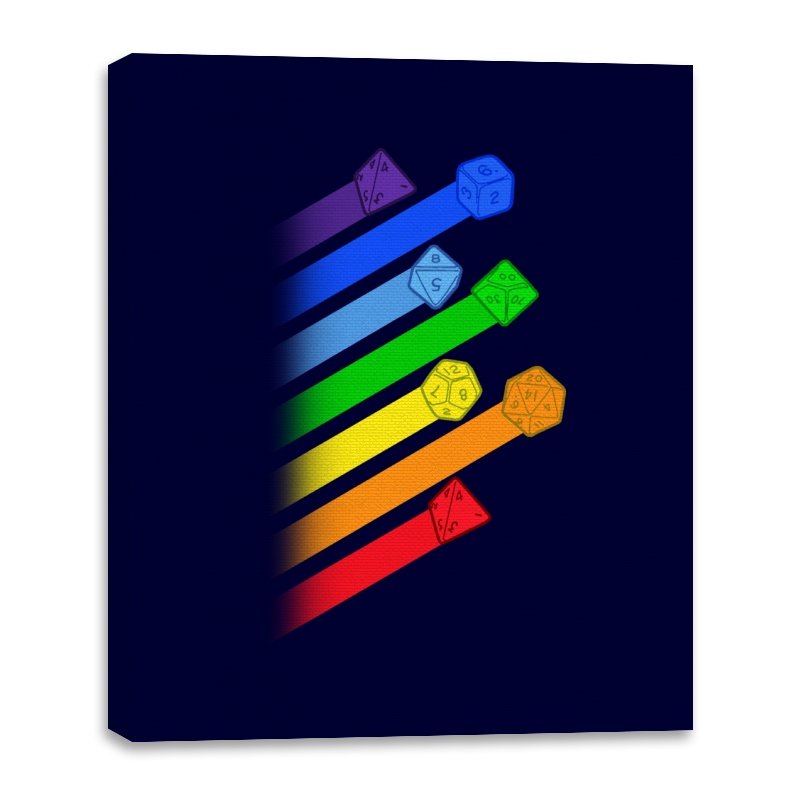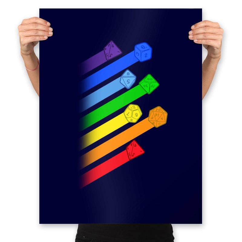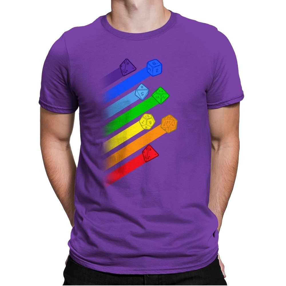 This design lines up a whole spectrum of polyhedral dice, each trailing a ribbon of matching color. From deep violet all the way to red, every shape gets its own spotlight, like a pride flag for tabletop players. The clean gradients and angled layout make it feel in motion, as if the dice were tossed and left streaks across the page. Fans do not need the reference explained because the geometry speaks for itself.