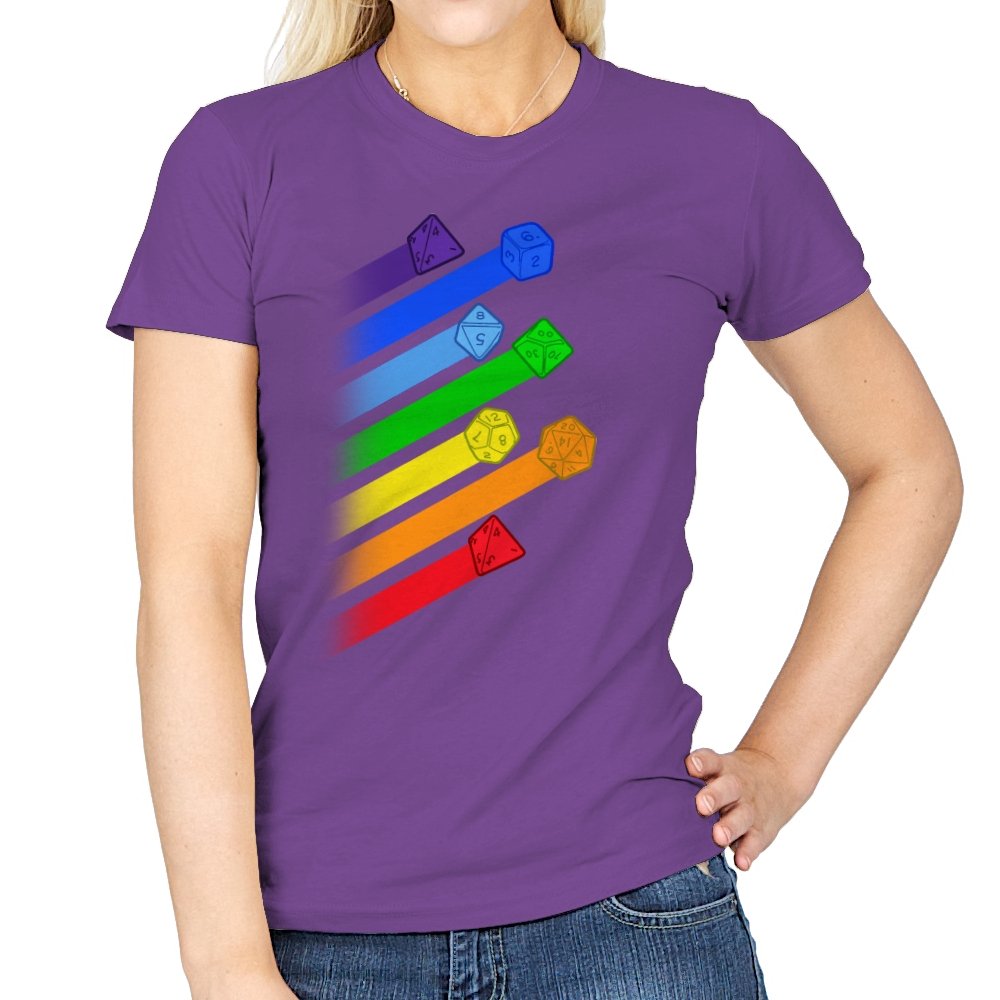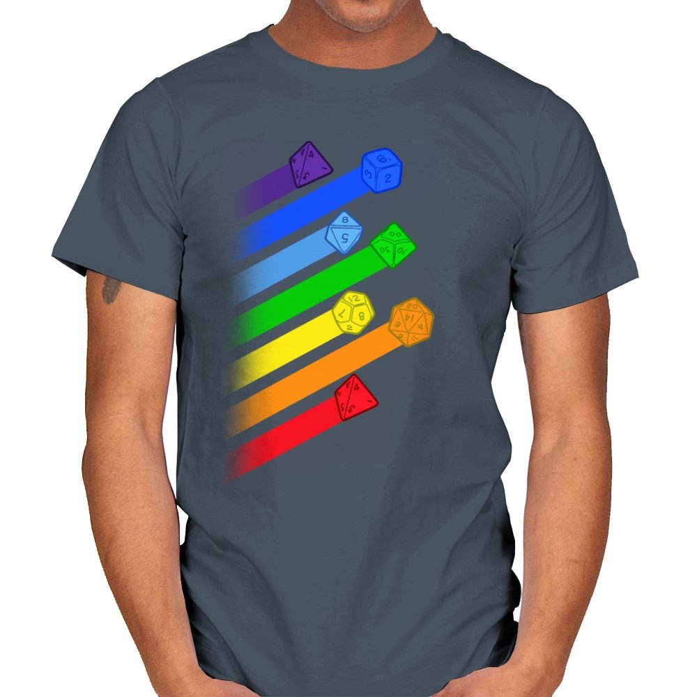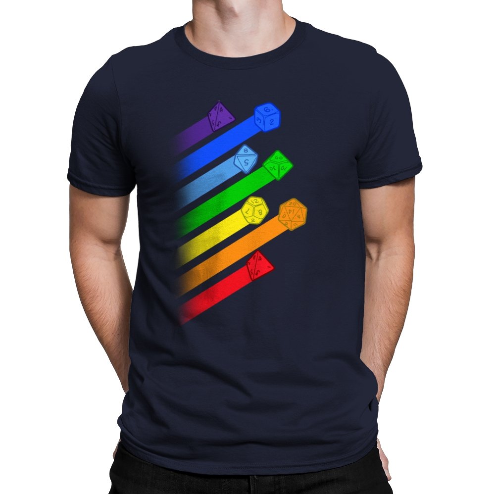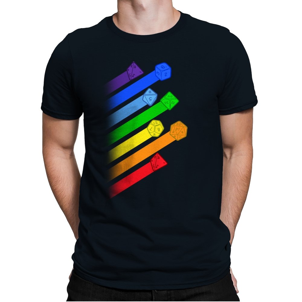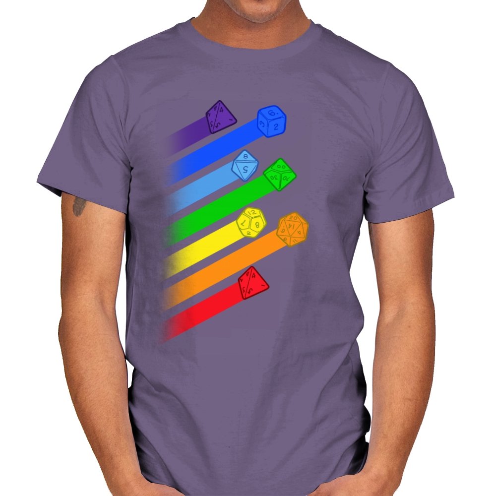 This design lines up a whole spectrum of polyhedral dice, each trailing a ribbon of matching color. From deep violet all the way to red, every shape gets its own spotlight, like a pride flag for tabletop players. The clean gradients and angled layout make it feel in motion, as if the dice were tossed and left streaks across the page. Fans do not need the reference explained because the geometry speaks for itself.