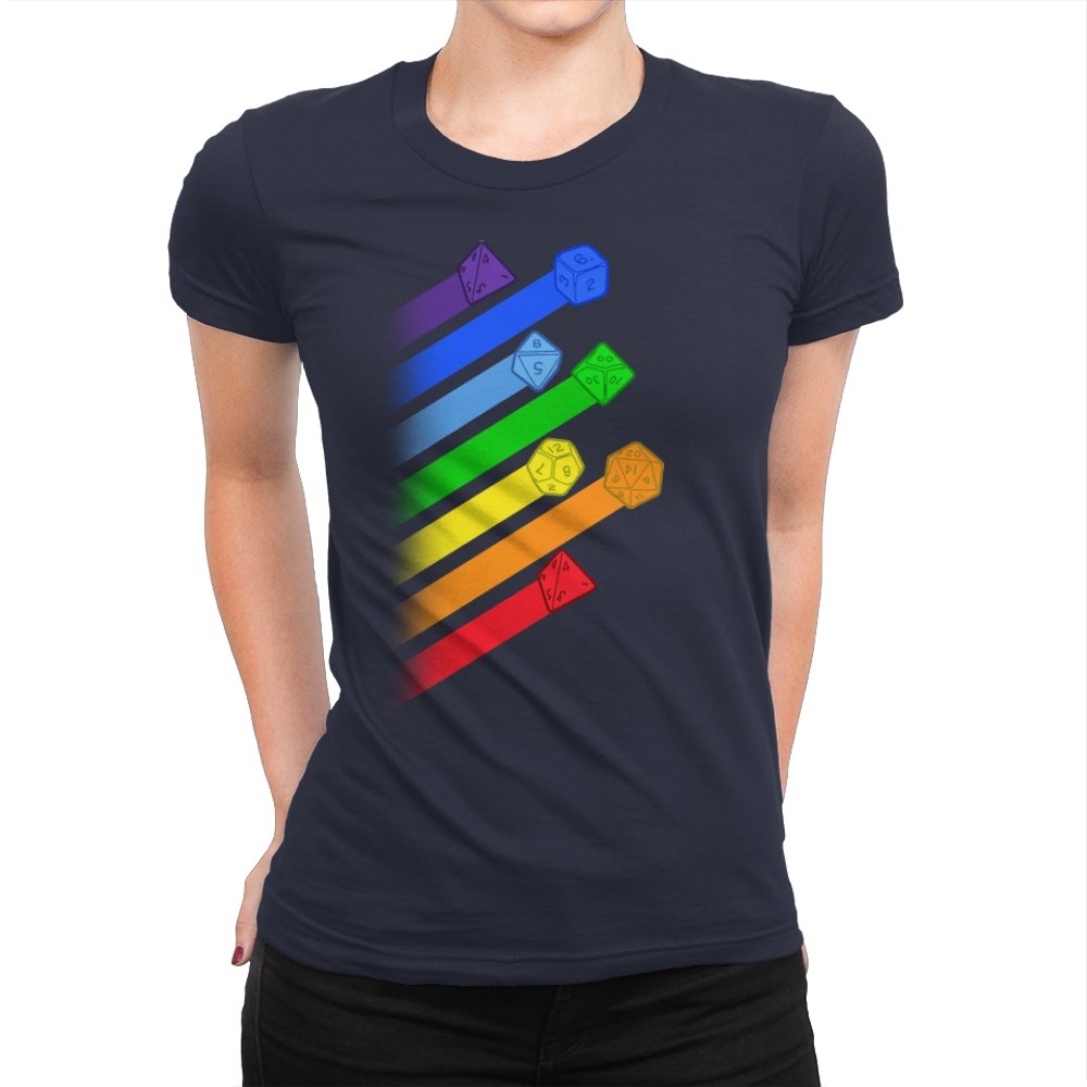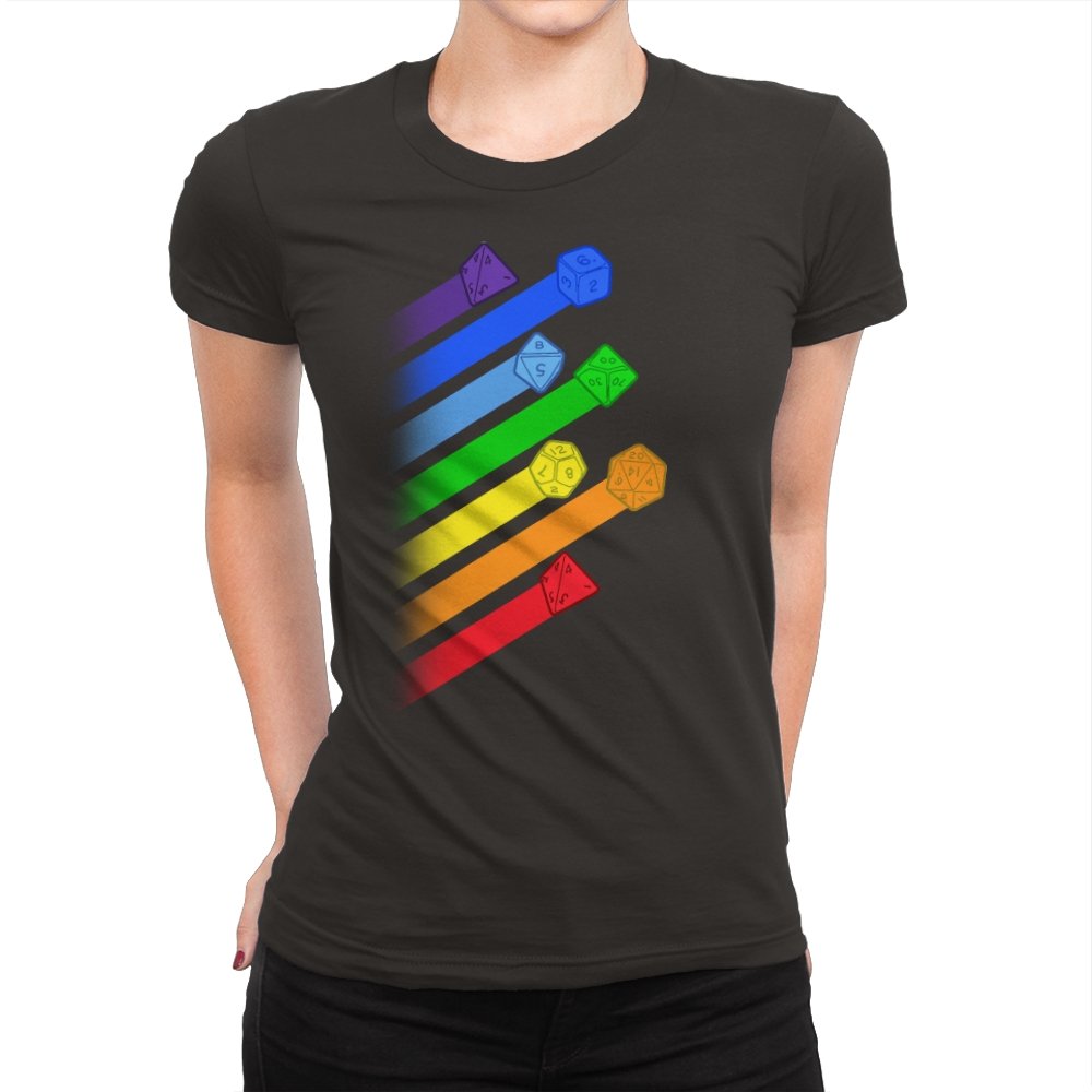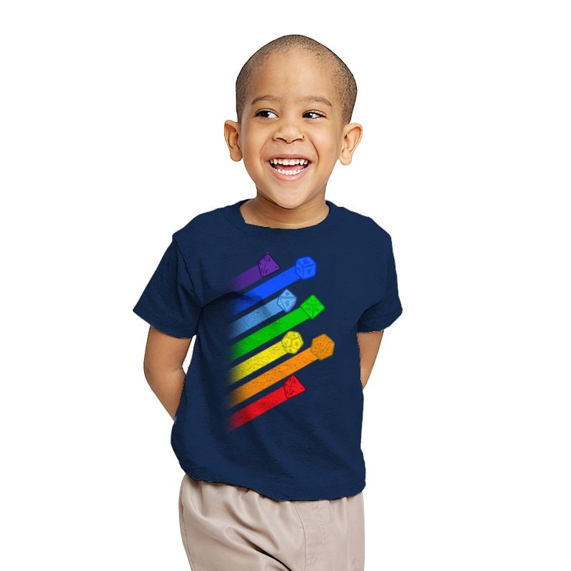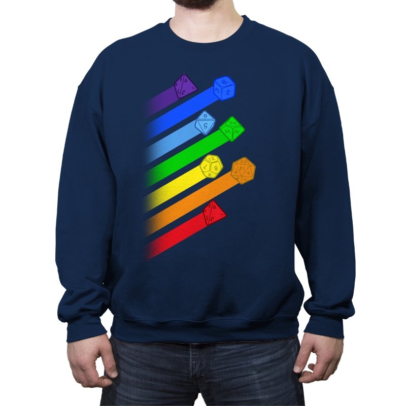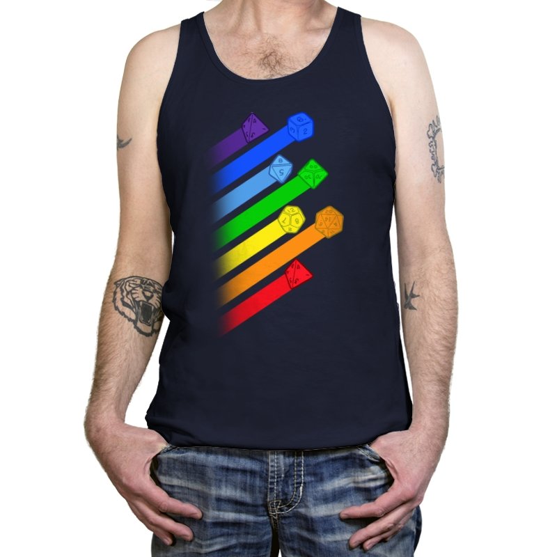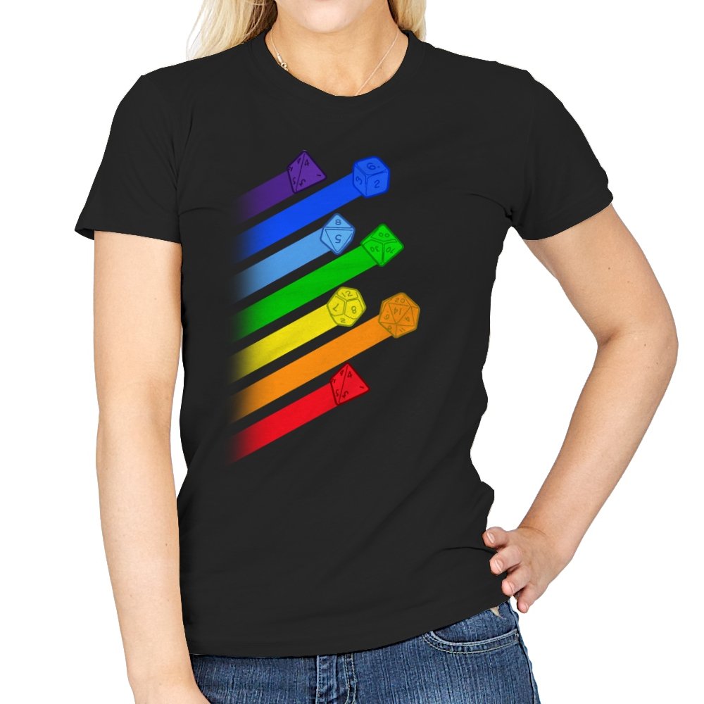 This design lines up a whole spectrum of polyhedral dice, each trailing a ribbon of matching color. From deep violet all the way to red, every shape gets its own spotlight, like a pride flag for tabletop players. The clean gradients and angled layout make it feel in motion, as if the dice were tossed and left streaks across the page. Fans do not need the reference explained because the geometry speaks for itself.