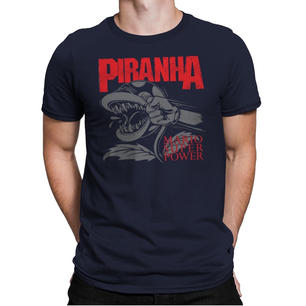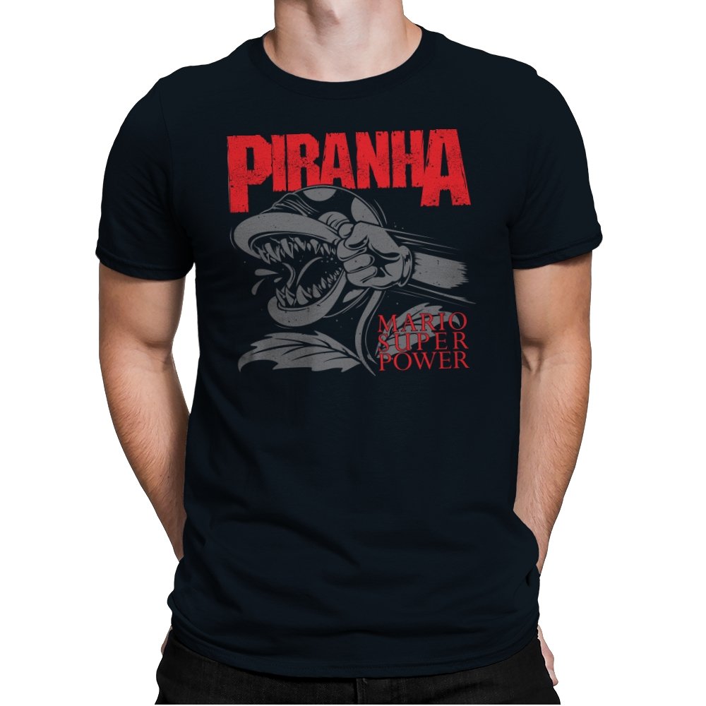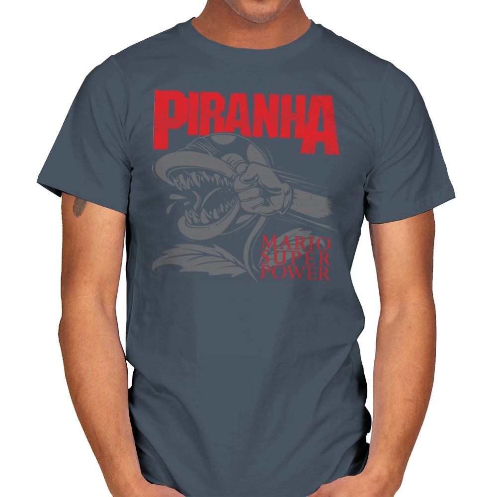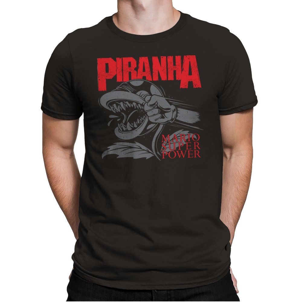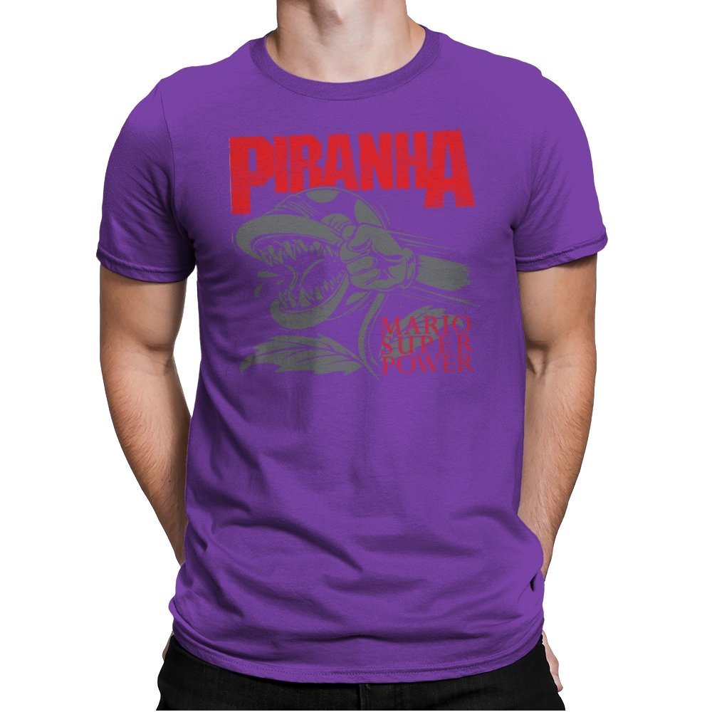 This design features a fierce, snarling piranha in full display, its teeth bared and ready to strike. With its powerful, aggressive expression, the creature is surrounded by bold lettering that captures the intensity of the moment. The dynamic composition speaks to those who appreciate a mix of nostalgia and edge, with a reference to the ever-popular Mario universe. The monochrome design with pops of red amplifies the visual impact, making it a statement piece for fans who get the vibe.