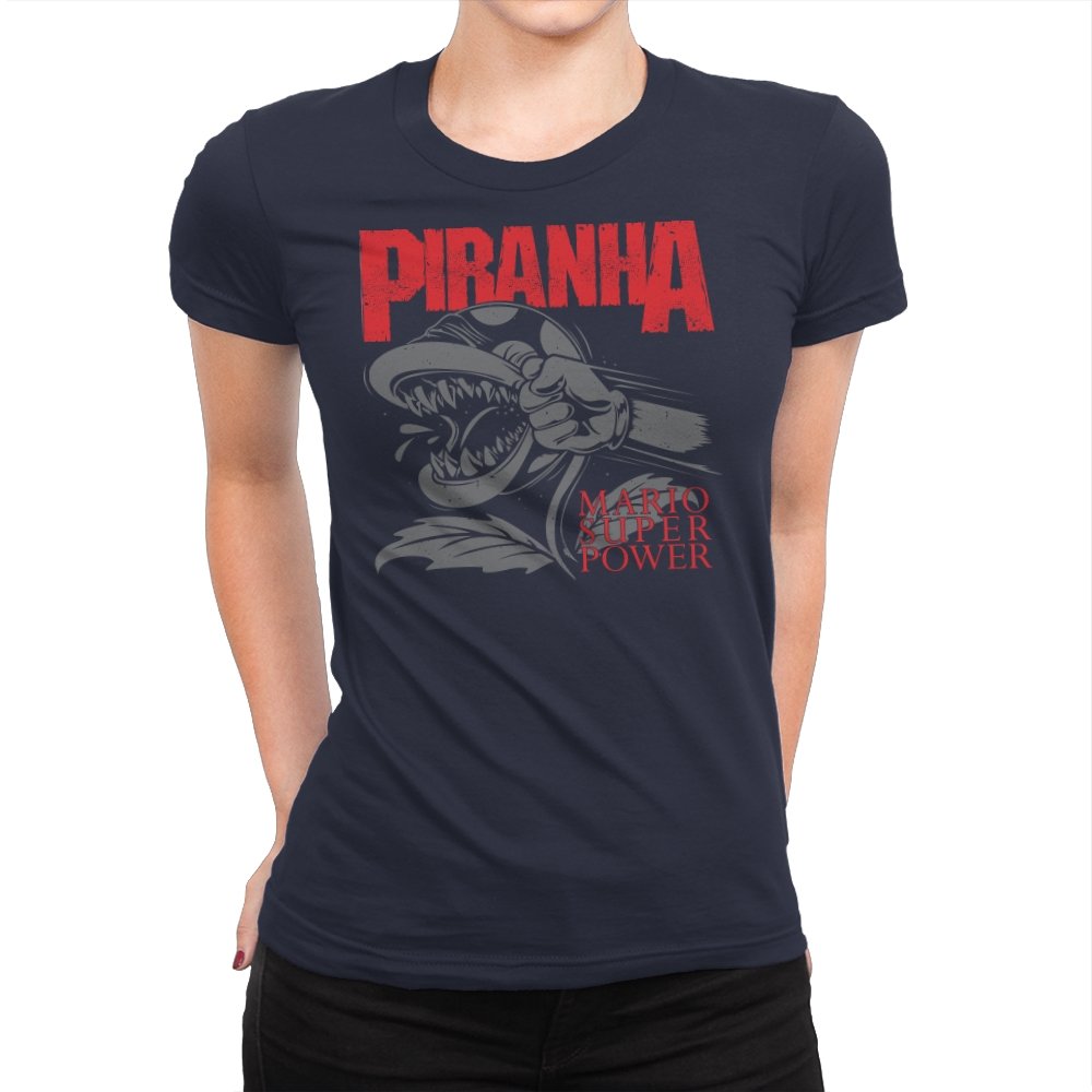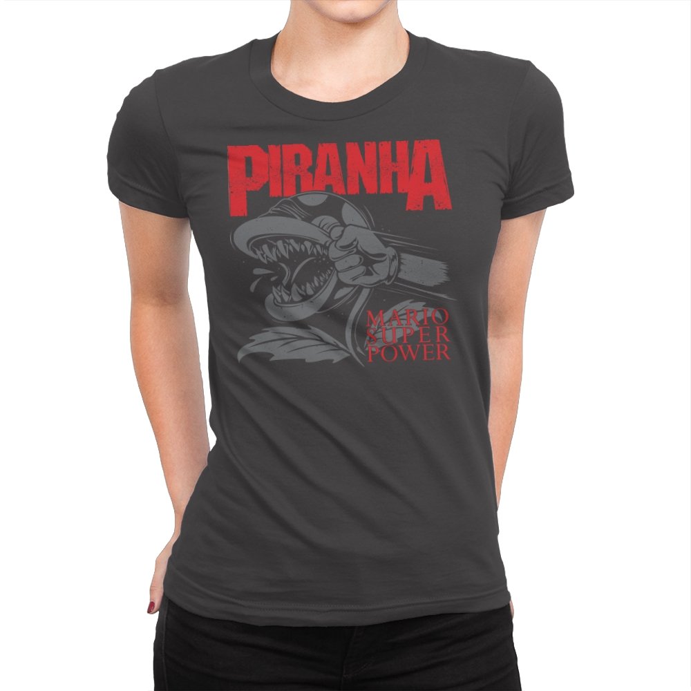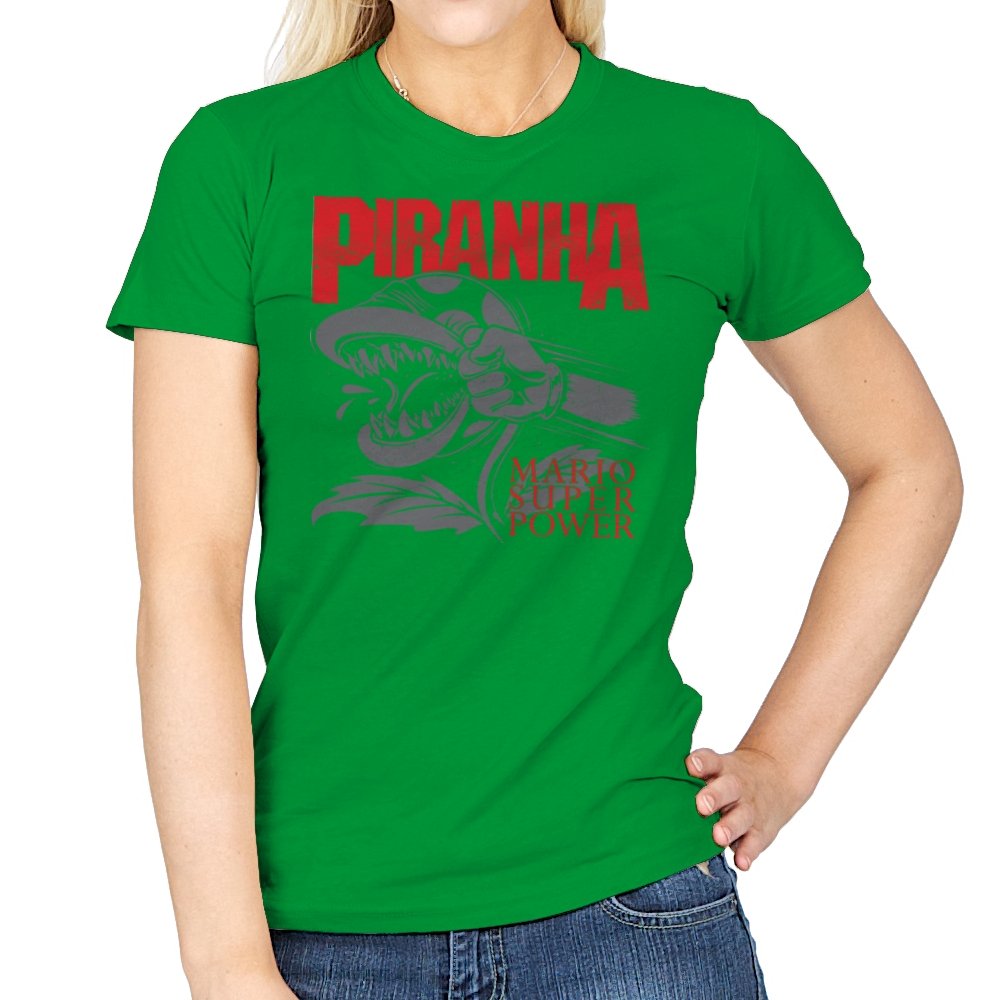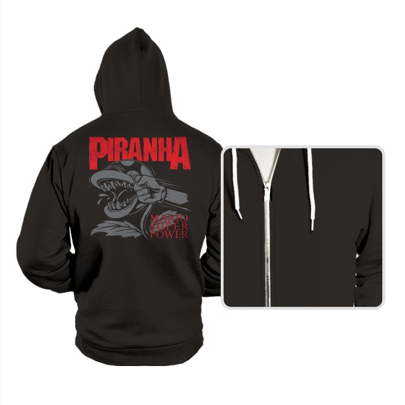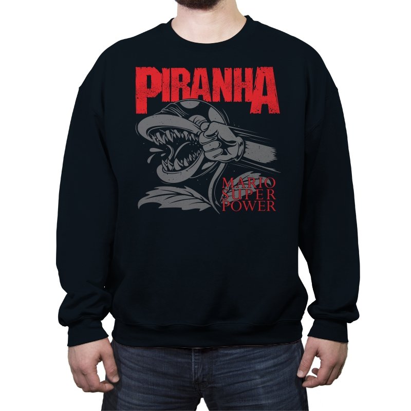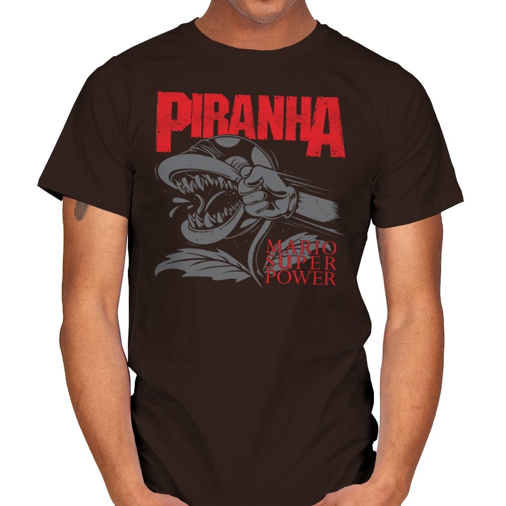 This design features a fierce, snarling piranha in full display, its teeth bared and ready to strike. With its powerful, aggressive expression, the creature is surrounded by bold lettering that captures the intensity of the moment. The dynamic composition speaks to those who appreciate a mix of nostalgia and edge, with a reference to the ever-popular Mario universe. The monochrome design with pops of red amplifies the visual impact, making it a statement piece for fans who get the vibe.