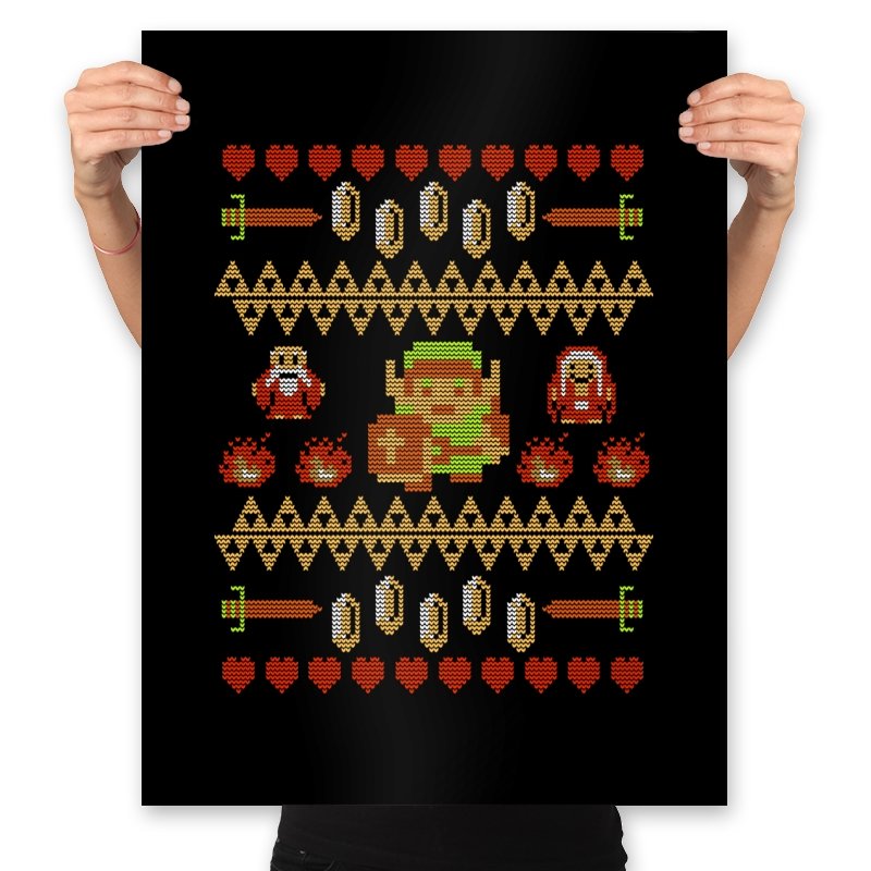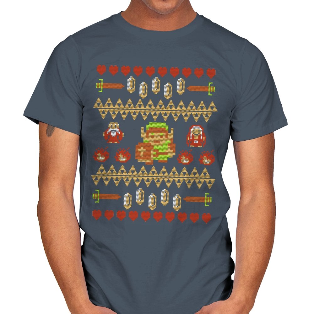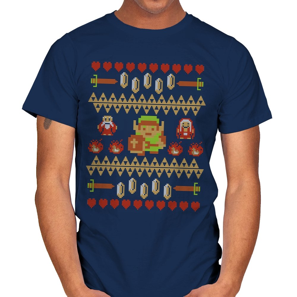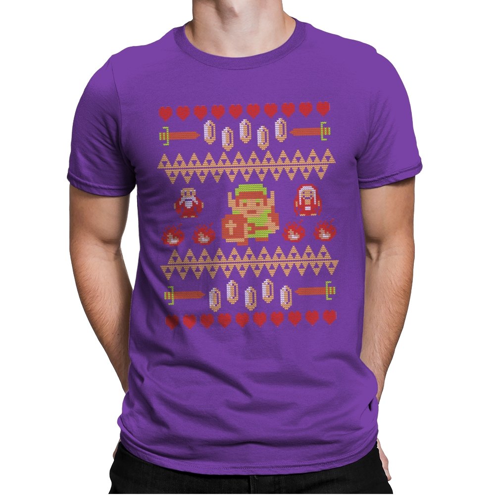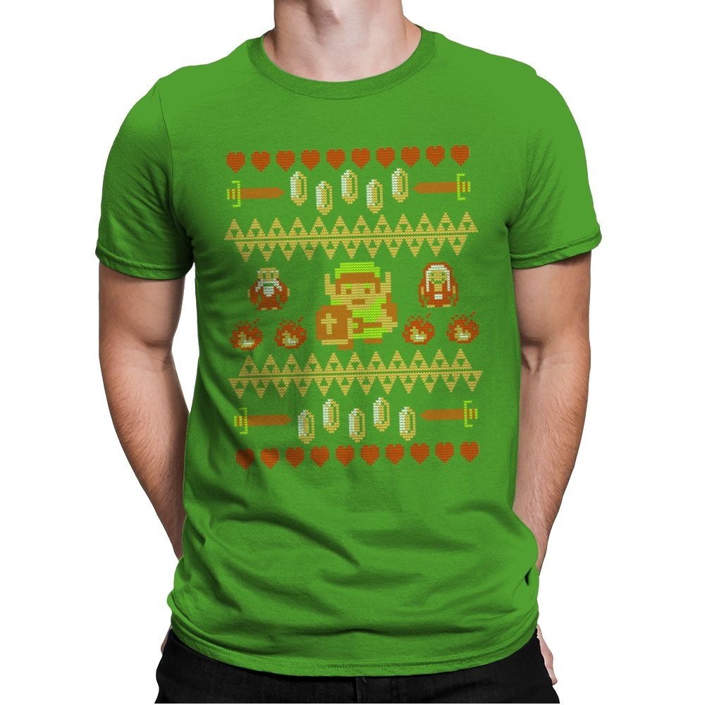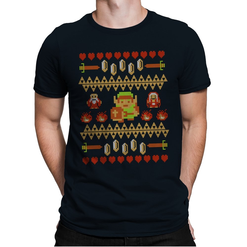 This design arranges familiar dungeon symbols into a dense holiday knit pattern that feels both festive and dangerous. Hearts, rupees, blades, and enemies repeat in careful rows, with a lone green-clad hero standing at the center. Everything is rendered in chunky pixels, like a winter sweater stitched from old cartridge memory. The title makes sense once you notice how exposed that center figure really is.