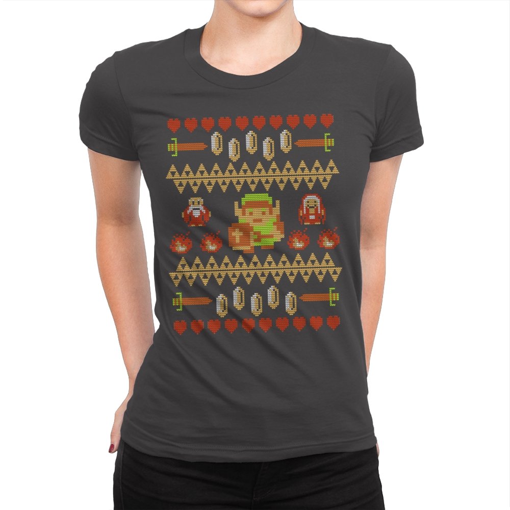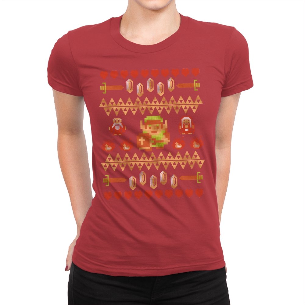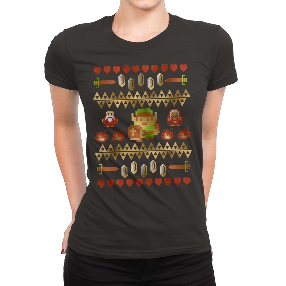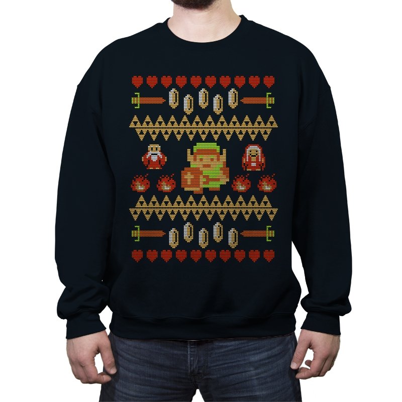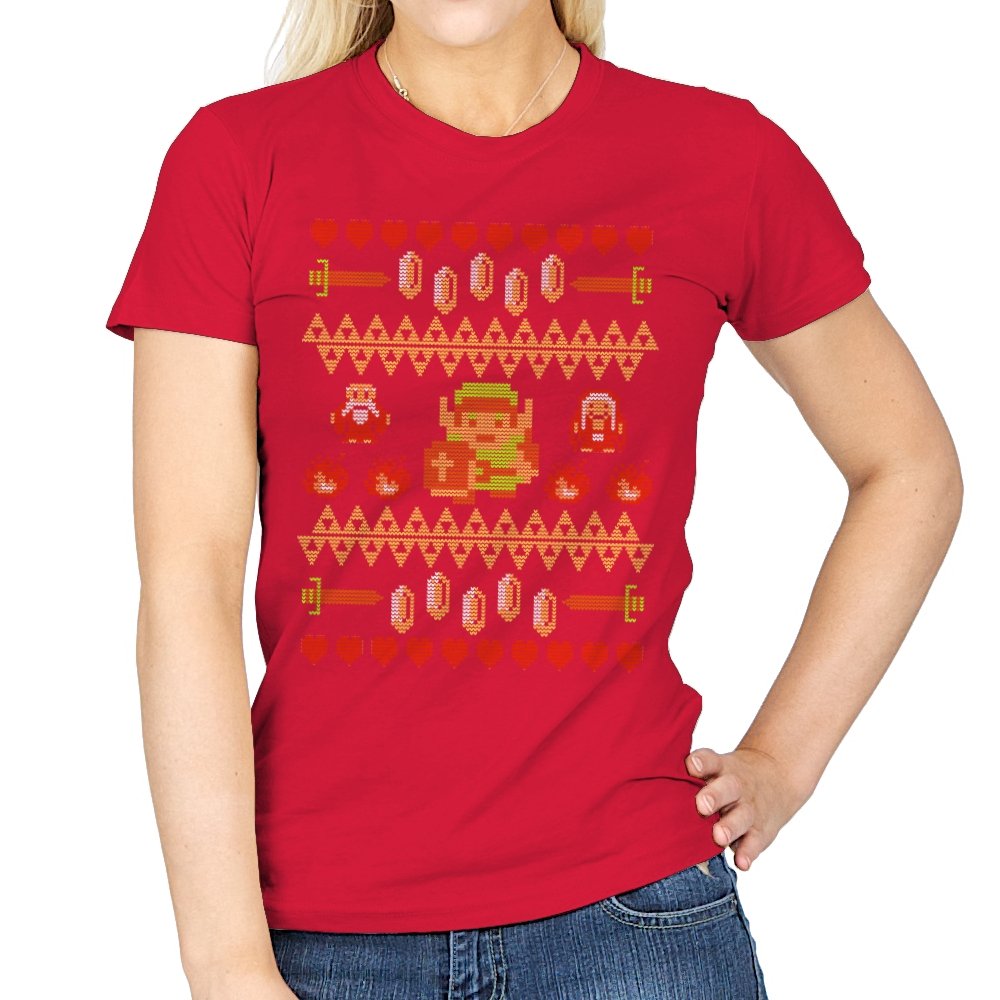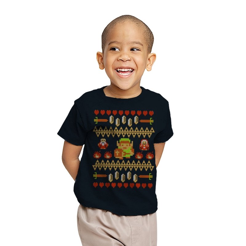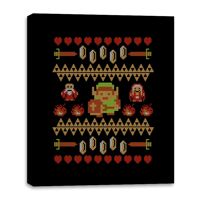 This design arranges familiar dungeon symbols into a dense holiday knit pattern that feels both festive and dangerous. Hearts, rupees, blades, and enemies repeat in careful rows, with a lone green-clad hero standing at the center. Everything is rendered in chunky pixels, like a winter sweater stitched from old cartridge memory. The title makes sense once you notice how exposed that center figure really is.