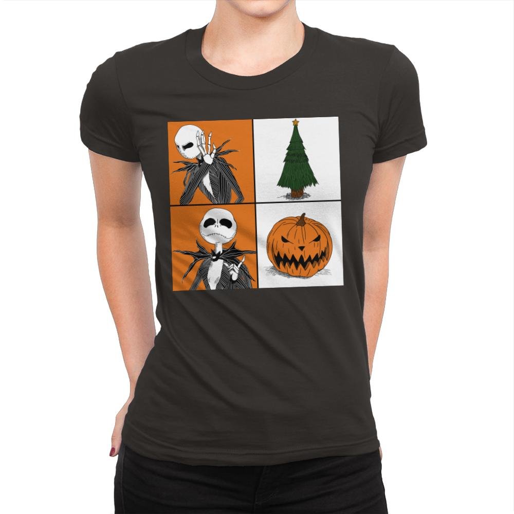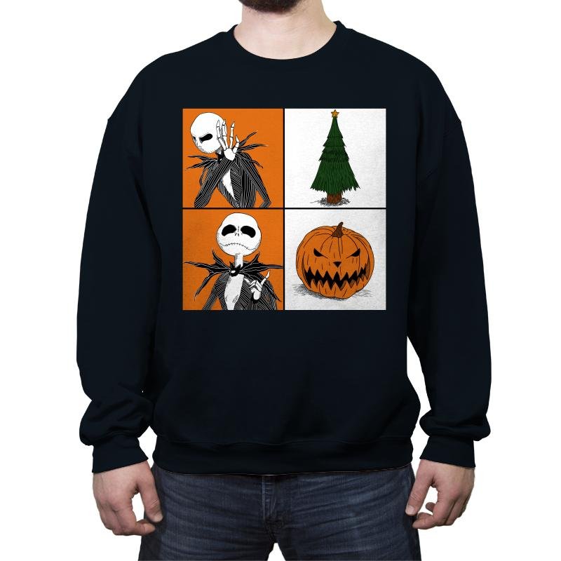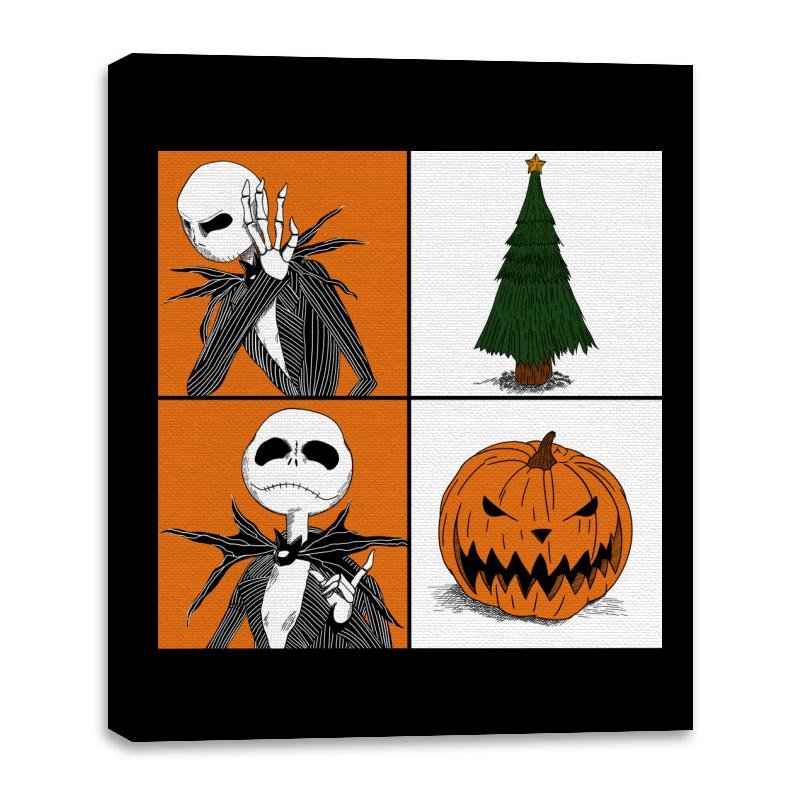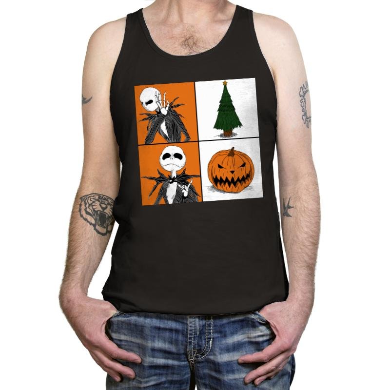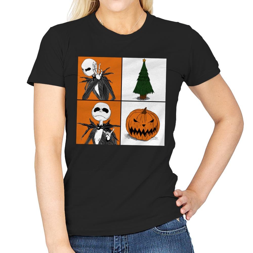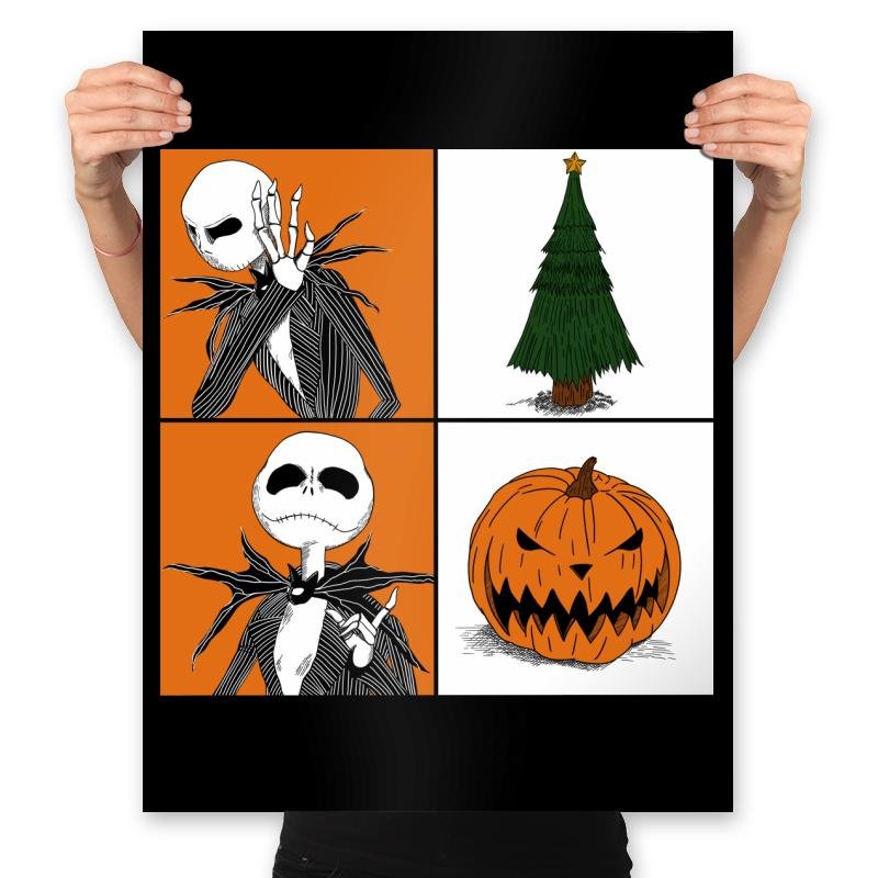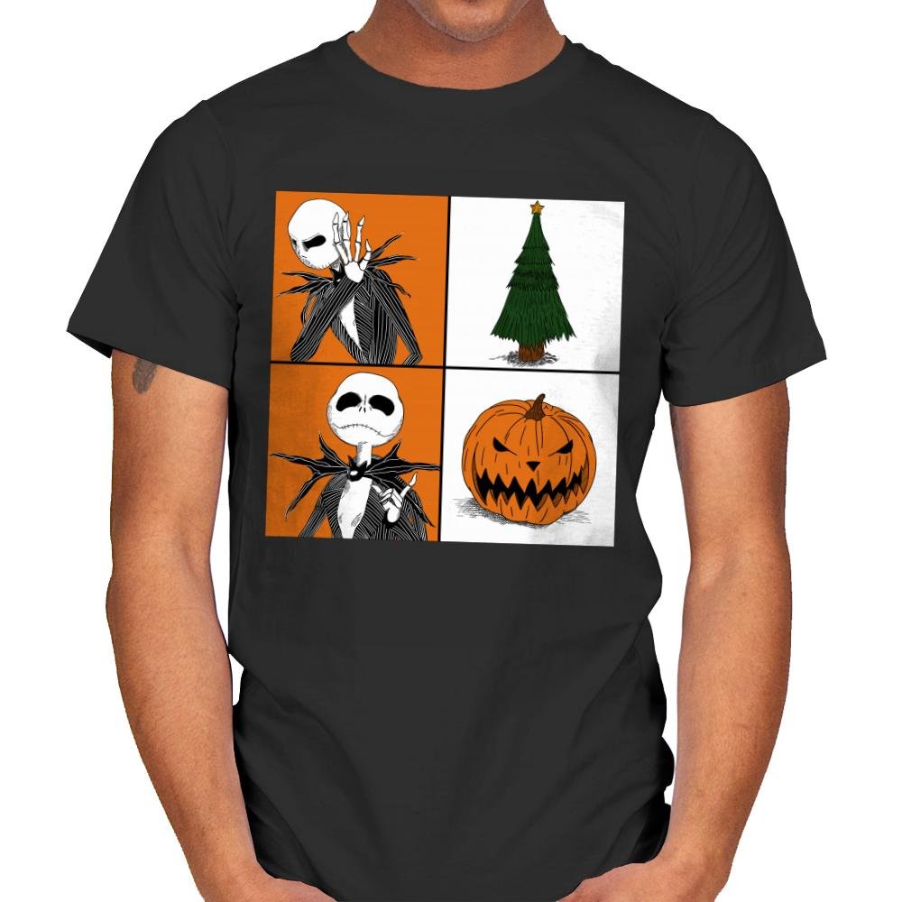 This design plays with seasonal duality using a clean four-panel layout. On one side, a familiar skeletal figure reacts with theatrical disbelief. On the other hand, the symbols of two holidays sit quietly, a decorated tree and a grinning pumpkin. The contrast is simple and visual, letting the joke land without explanation. Fans who know the crossover immediately read the tension between spooky and festive.