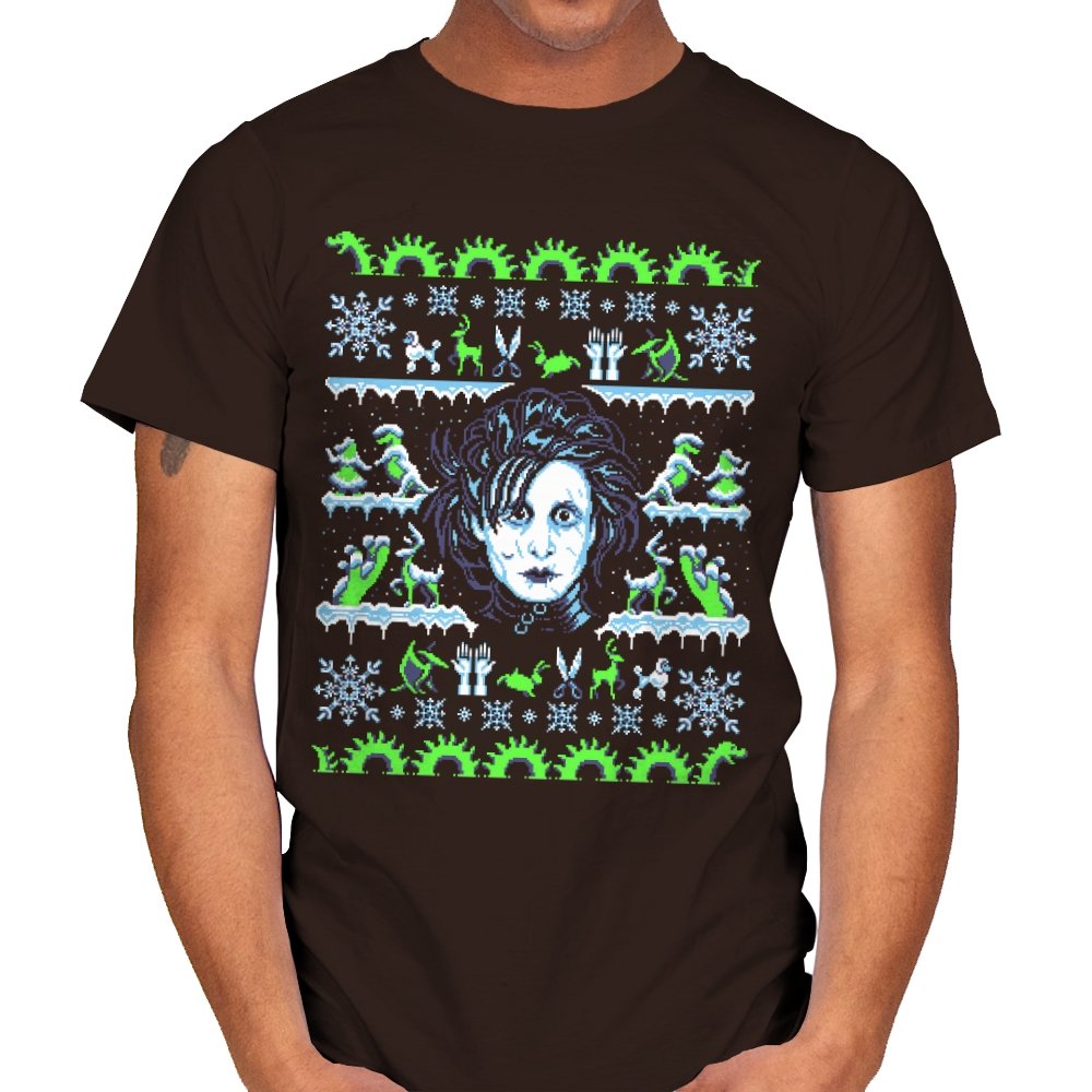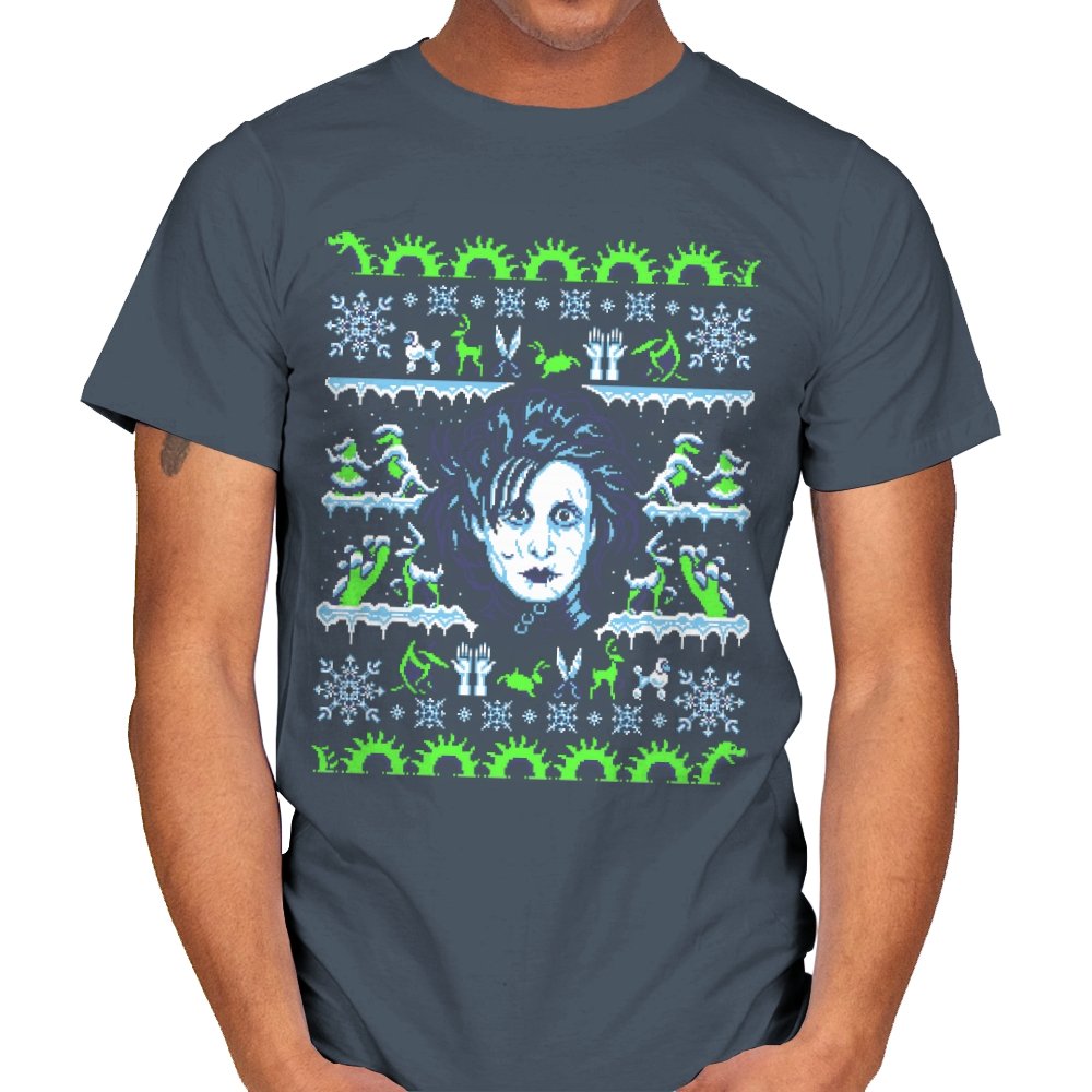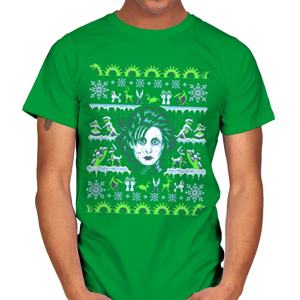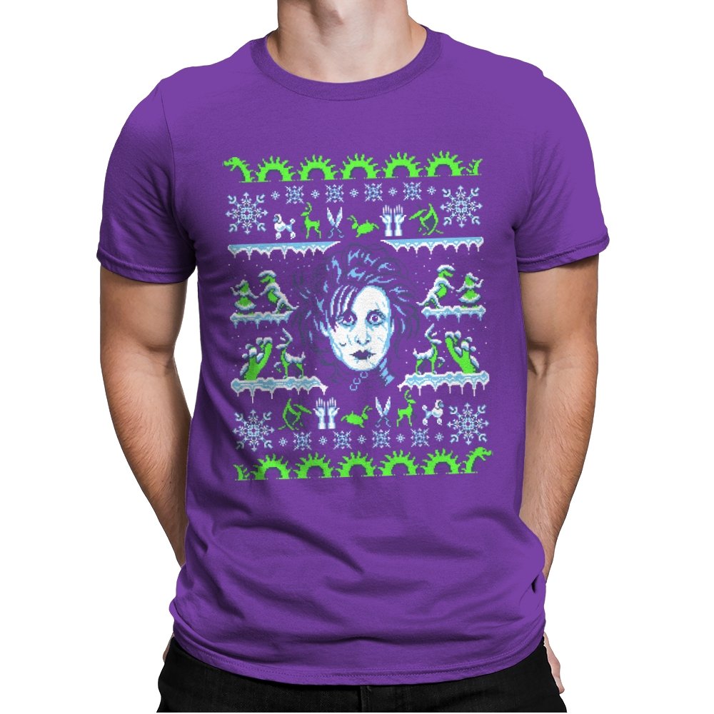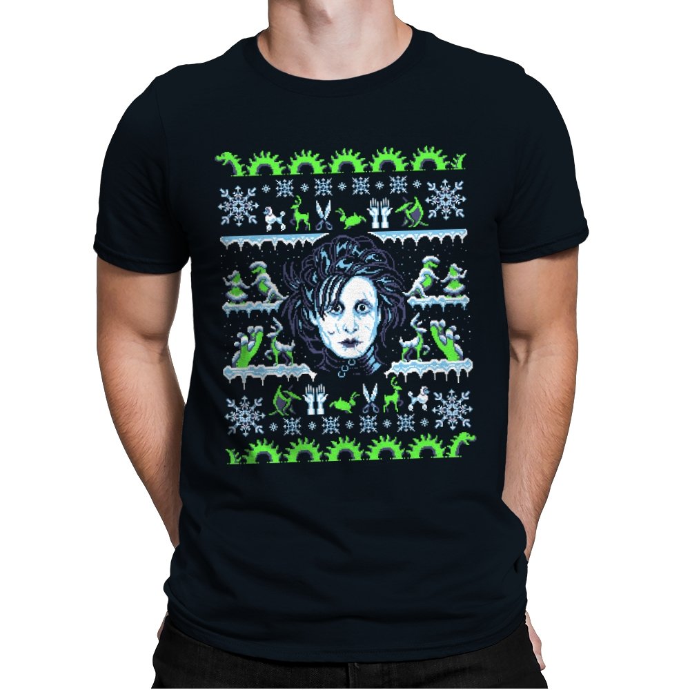 This design pulls a gothic suburban fairy tale into ugly holiday sweater territory. Faux knit stitches frame the pale, wild haired outsider at the center, with shears in place of hands and a quietly stunned expression. Around him, stitched snowflakes, hedge sculptures, and swirling gears recreate the film’s strange blend of winter magic and industrial melancholy. Fans will recognize the contrast of icy blues and neon greens that define the character’s world.