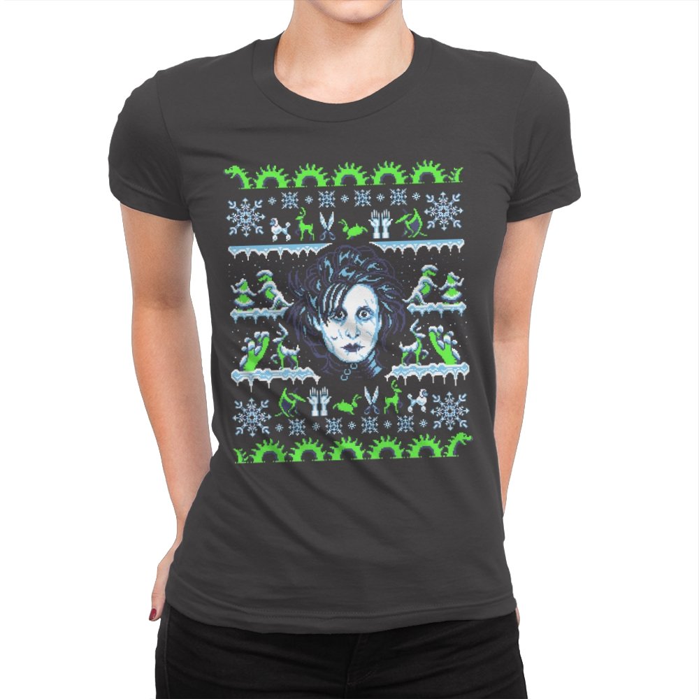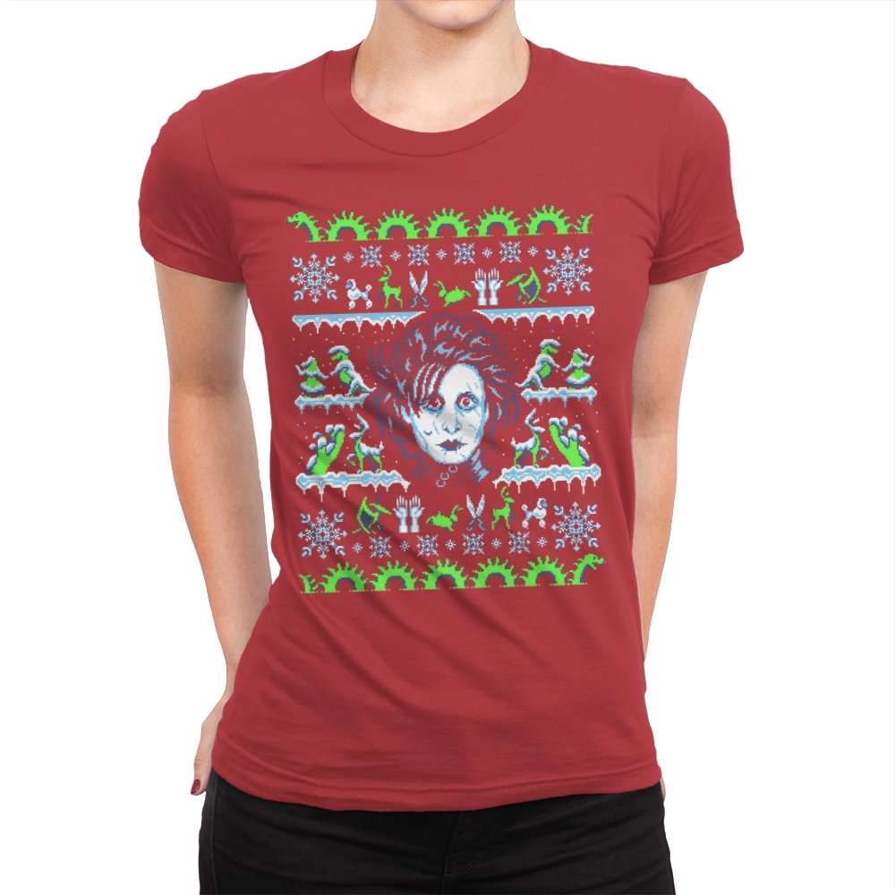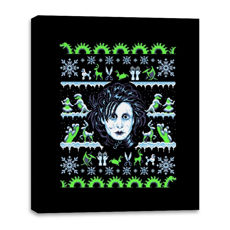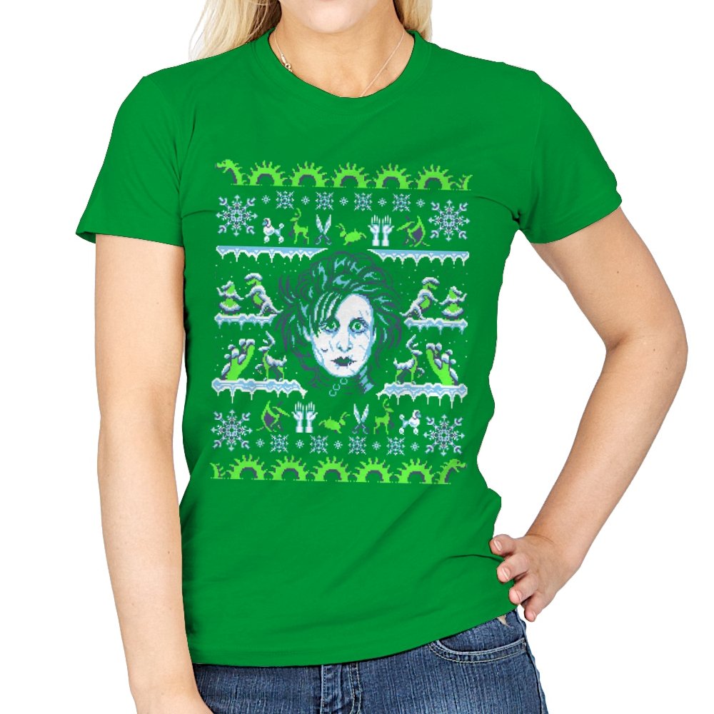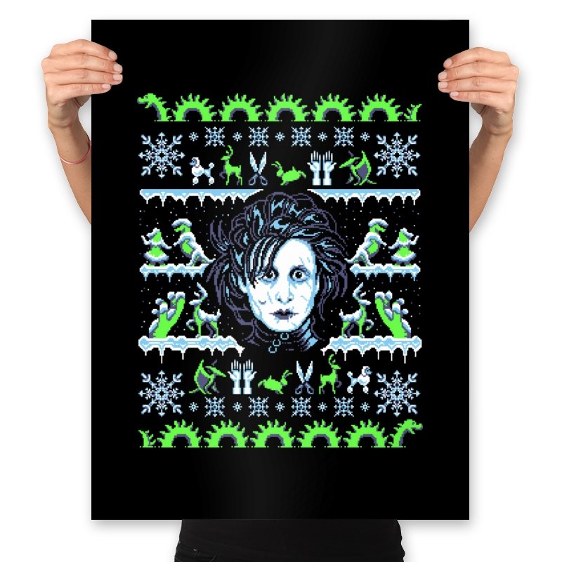 This design pulls a gothic suburban fairy tale into ugly holiday sweater territory. Faux knit stitches frame the pale, wild haired outsider at the center, with shears in place of hands and a quietly stunned expression. Around him, stitched snowflakes, hedge sculptures, and swirling gears recreate the film’s strange blend of winter magic and industrial melancholy. Fans will recognize the contrast of icy blues and neon greens that define the character’s world.
