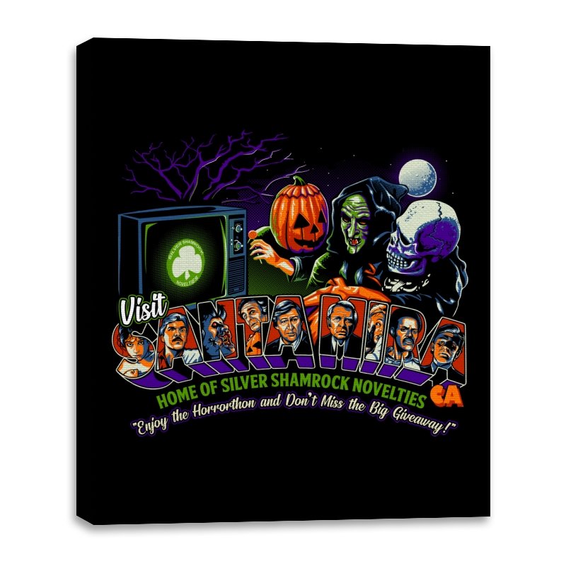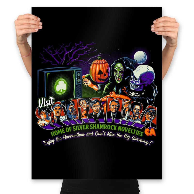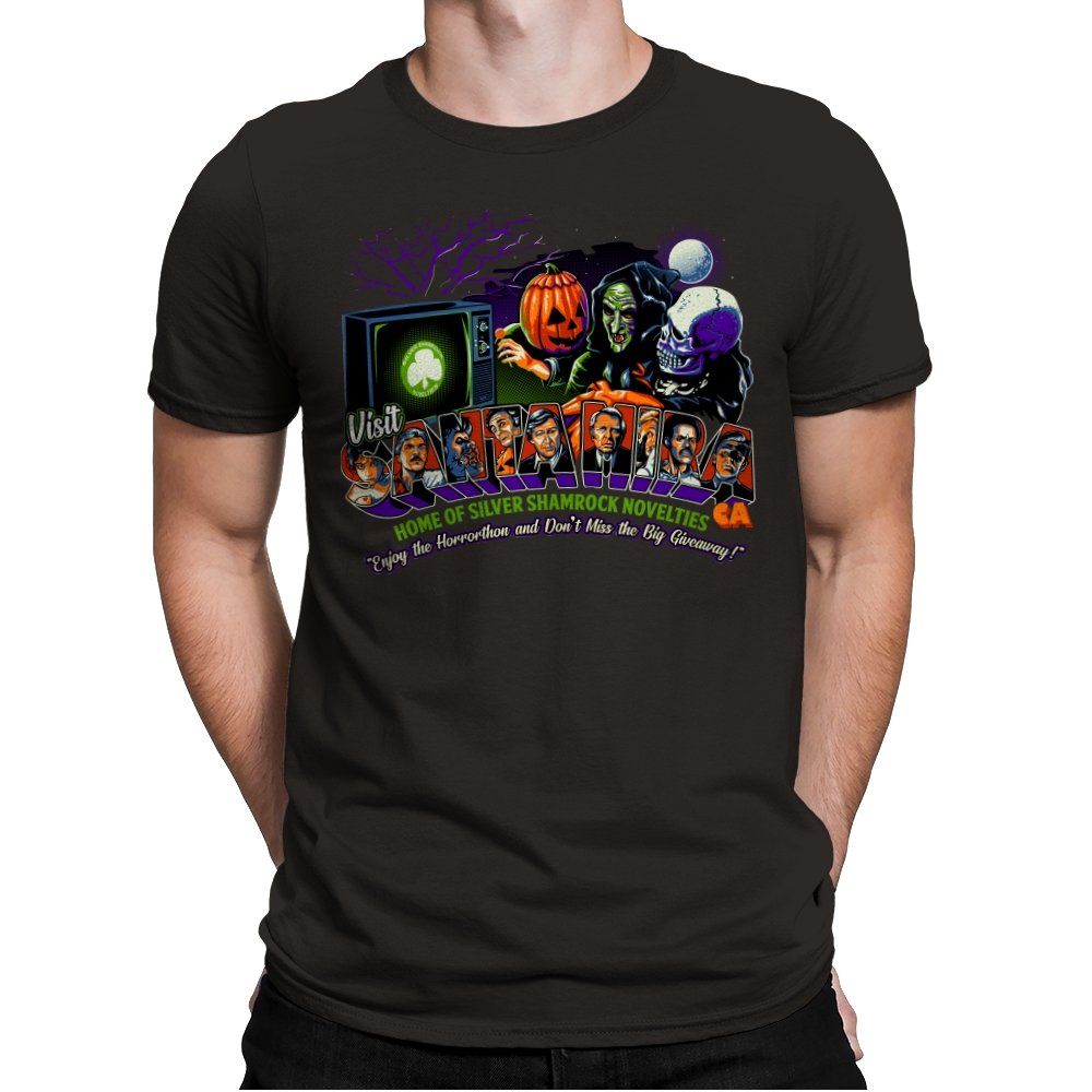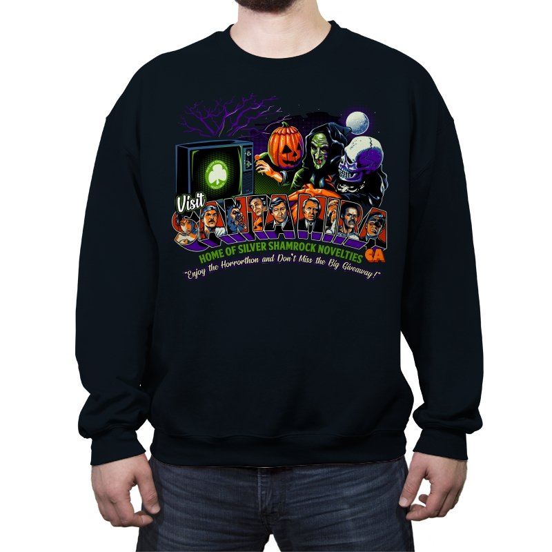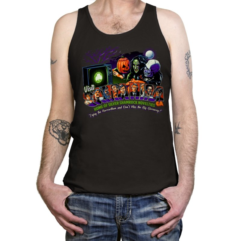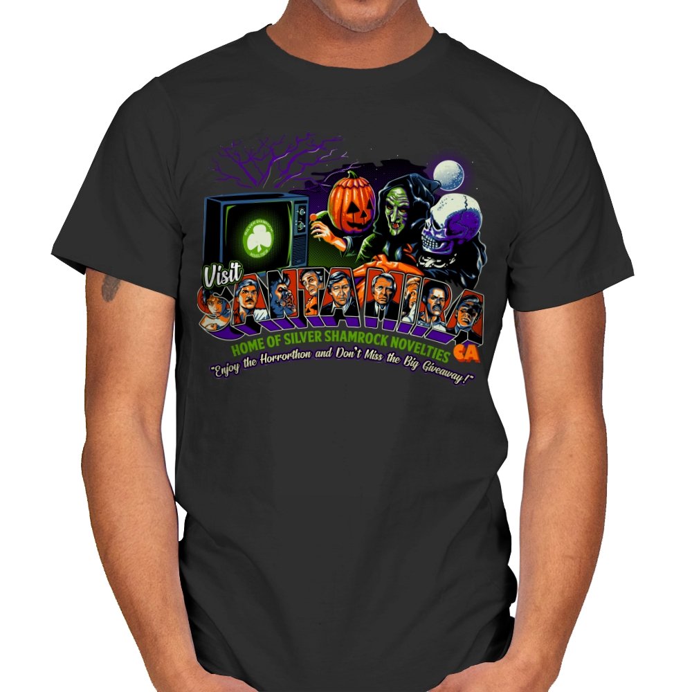 This design plays like a travel postcard from a cursed factory town that only horror buffs would dare visit. The screen glows with a familiar clover signal while masked figures lurk under a harvest moon, each mask hinting at that infamous seasonal broadcast. The typography is loud in the way vintage tourism merch used to be, and the faces tucked into the letters remind you exactly why the Horrorthon was unforgettable. No one here needs the plot explained, because the countdown tune is already stuck in their head.
