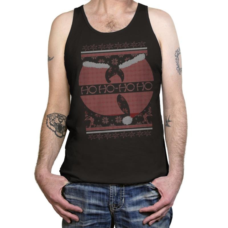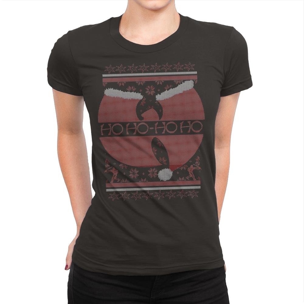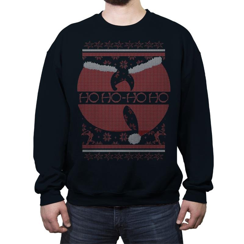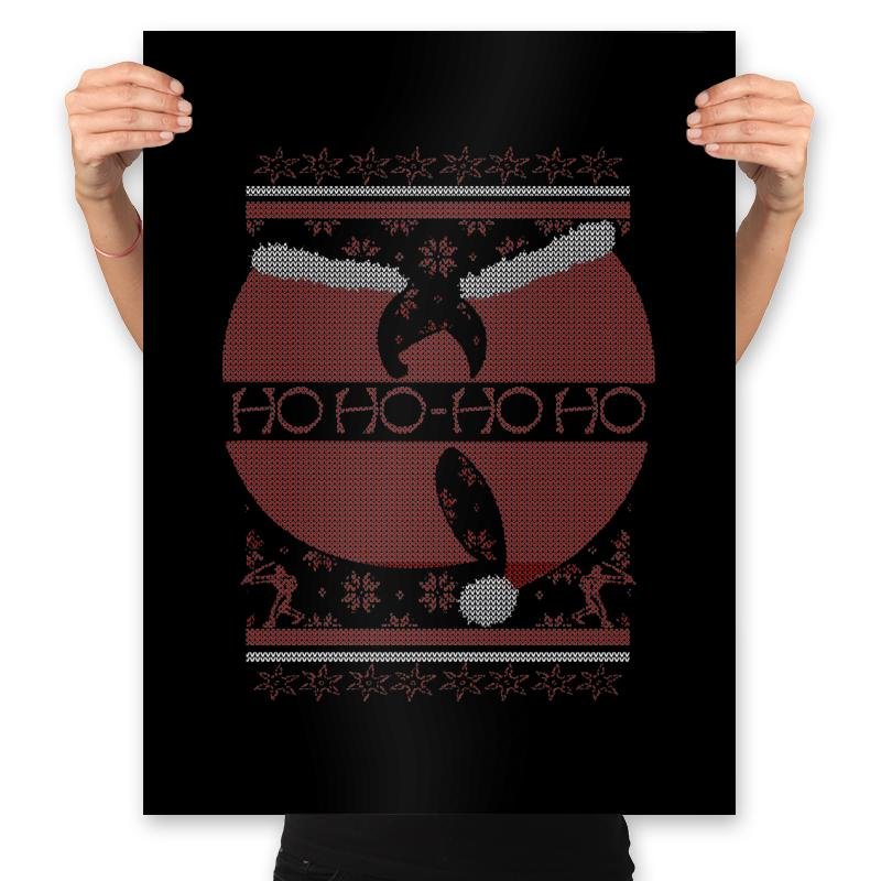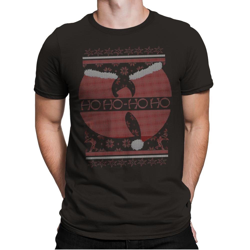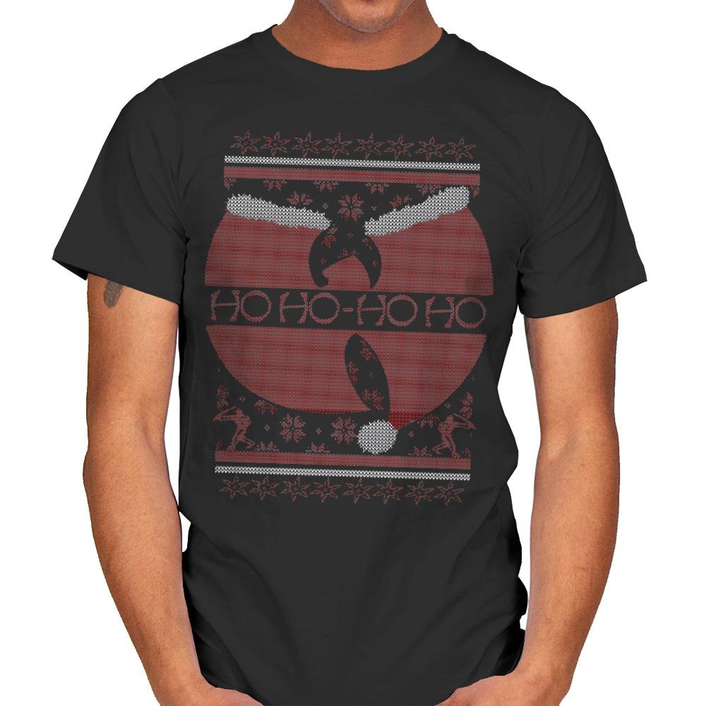 This design riffs on a legendary martial arts movie poster and converts it into ugly holiday sweater form. The red circular motif becomes a festive backdrop for a silhouette mid flying kick, while stitched snowflakes, reindeer, and borders fill out the parody. Ho Ho Ho replaces the original tagline with the same cadence but a much sillier threat. Fans of vintage action cinema will clock the reference in seconds.