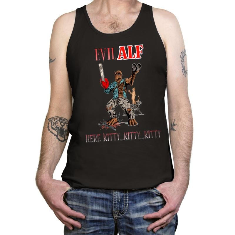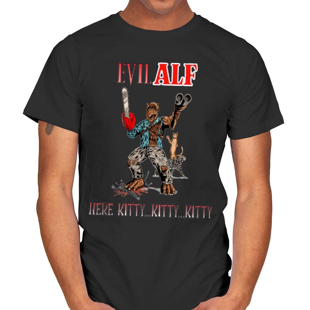 This design takes a once harmless sitcom presence and drags it straight into grindhouse territory. The figure stands center frame with wild eyes, improvised weapons, torn clothes, and a cat that looks more complicit than concerned. The typography leans into horror parody, while the pose feels frozen mid threat. It reads like a late night movie poster you probably should not have been watching as a kid.