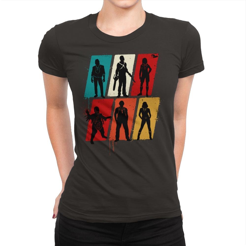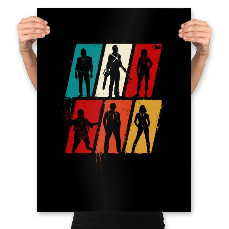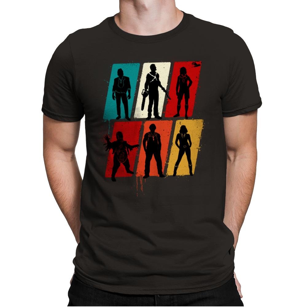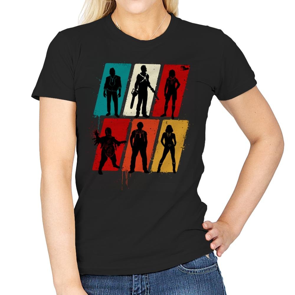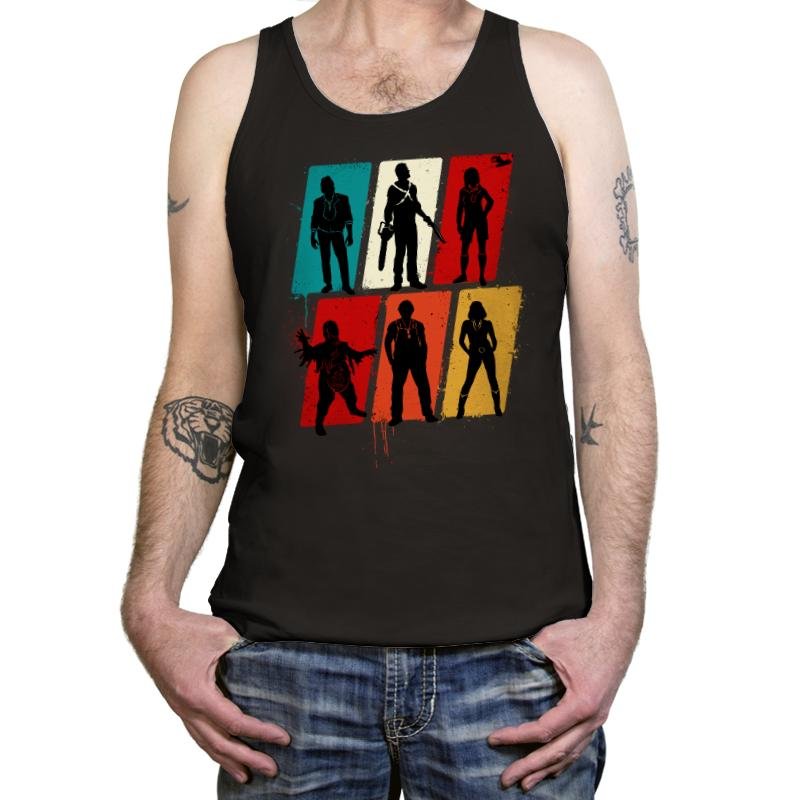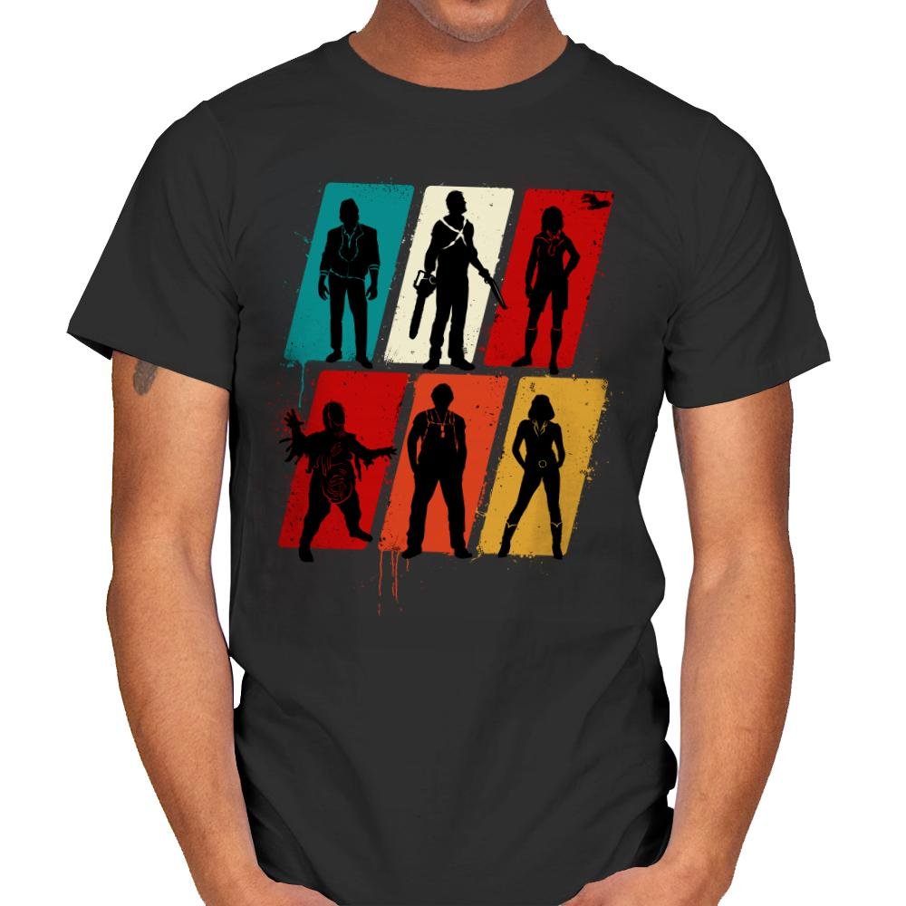 Evil Dead II Souls presents an explosive design inspired by the iconic horror series. The design showcases five key figures in bold silhouettes, each representing a different soul caught in the chaos and terror of the franchise. With striking color blocks in red, yellow, blue, and green, the artwork delivers a visually dynamic tribute to the characters we know and love, offering a mix of nostalgia and intensity. Fans will immediately connect to the visual cues from the films, capturing the essence of the horror and the eerie world of the Evil Dead series.