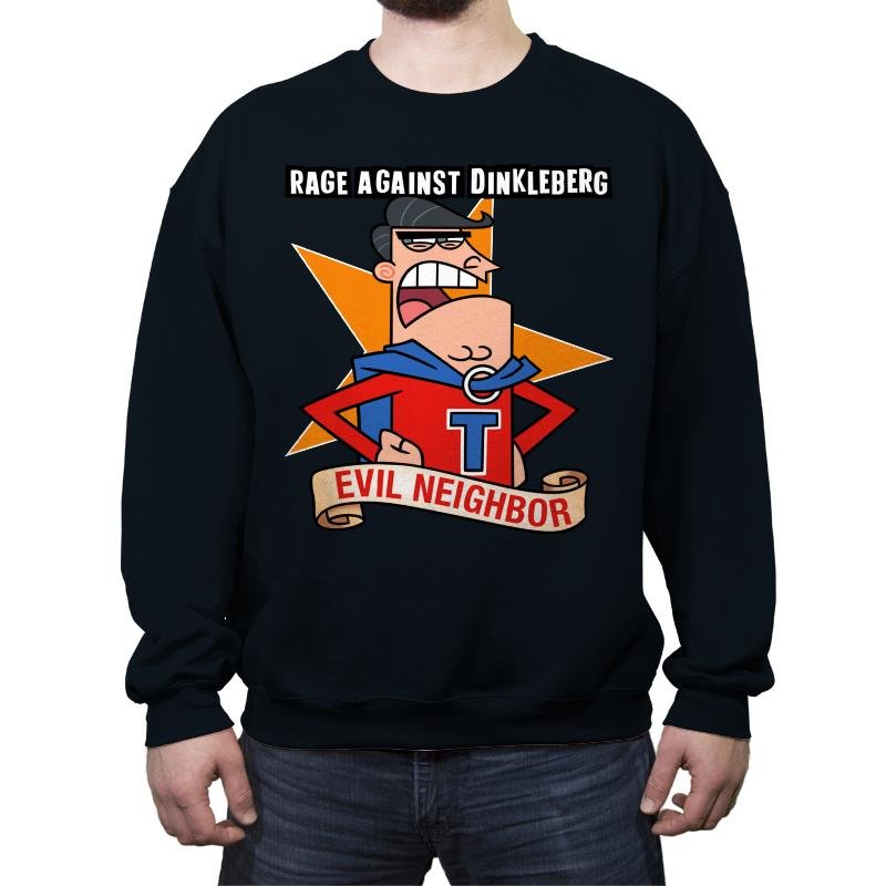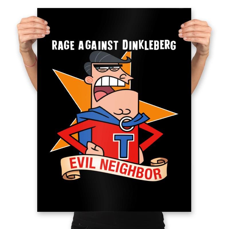 A scowling suburban super villain stands front and center, chest out, fists tight, and ego fully powered. The bright badge, bold letter, and banner label frame him like a self declared hero of the block. The joke lands fast if you know the rivalry and the constant neighbor meltdown energy behind it. It feels like a cartoon grudge turned into a fake comic cover.