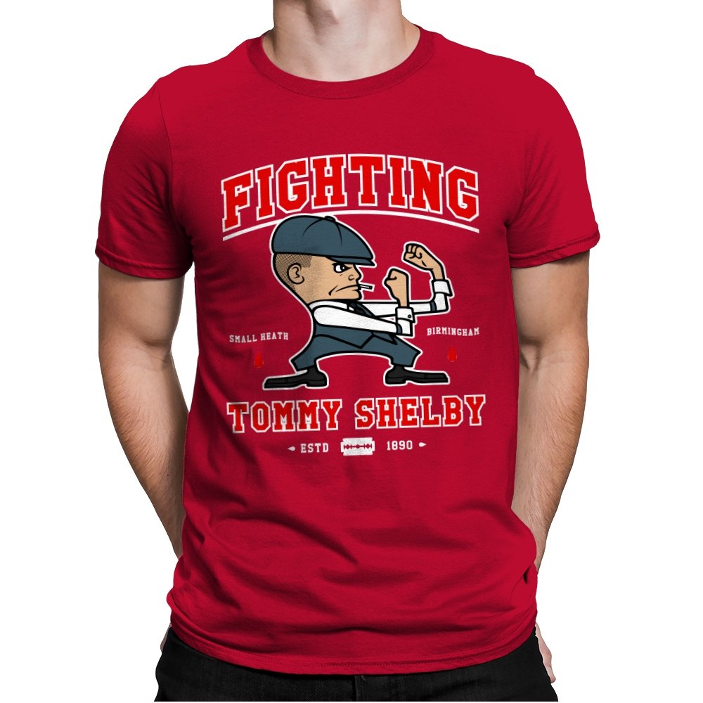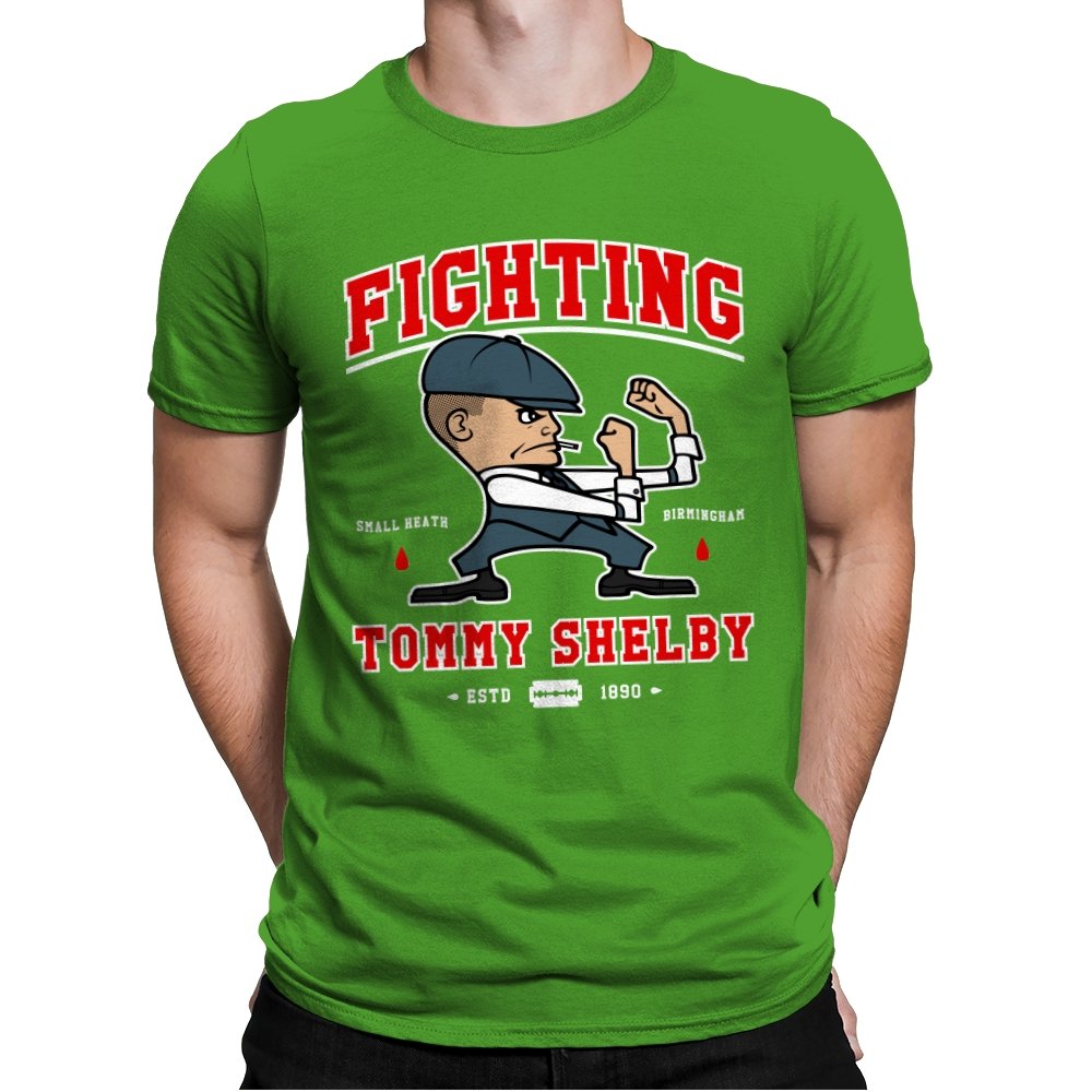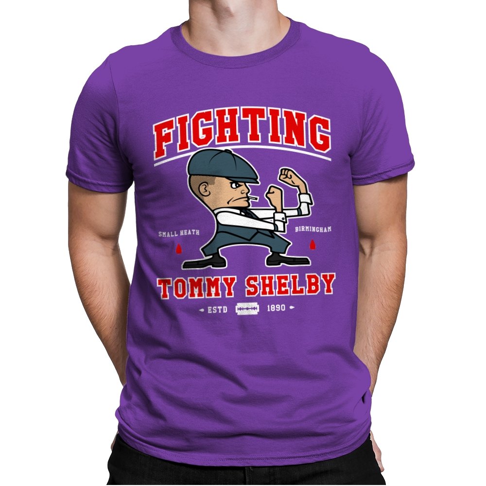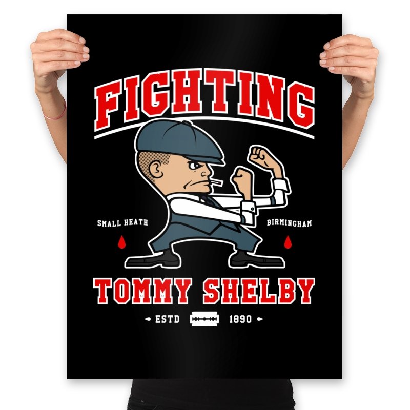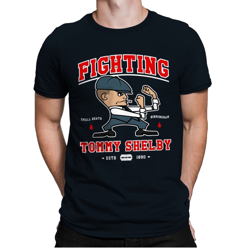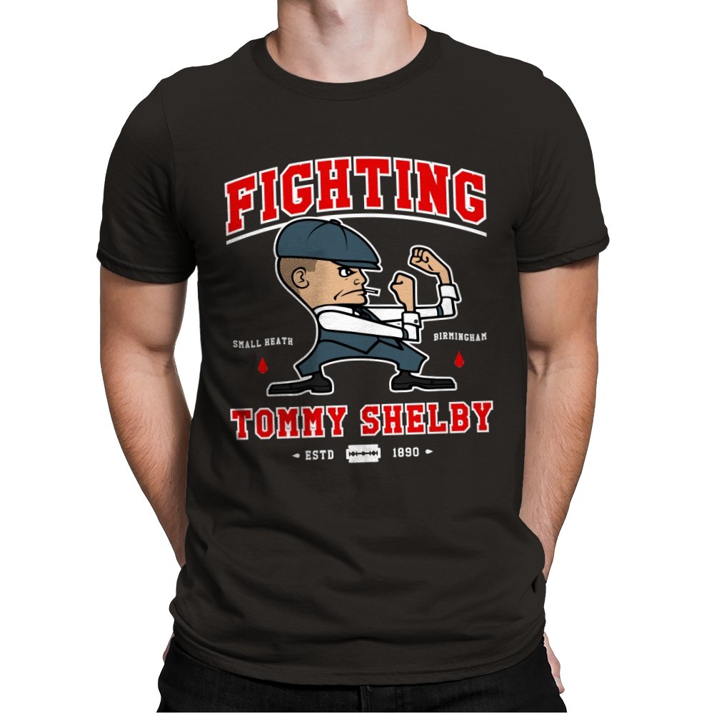 This design reimagines a certain razor sharp Birmingham strategist as a cartoon prizefighter. The flat cap stays on while he squares up in a classic boxing stance, fists tight and jaw set. The typography around him borrows from sports logos and vintage fight posters, complete with city names, dates, and tiny blood drops as punctuation. Fans immediately understand how the graphic winks at both crime saga drama and hometown pride.