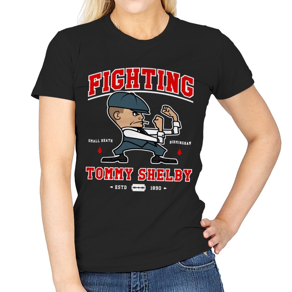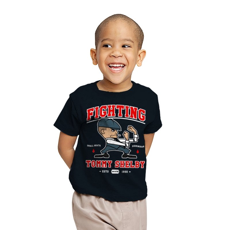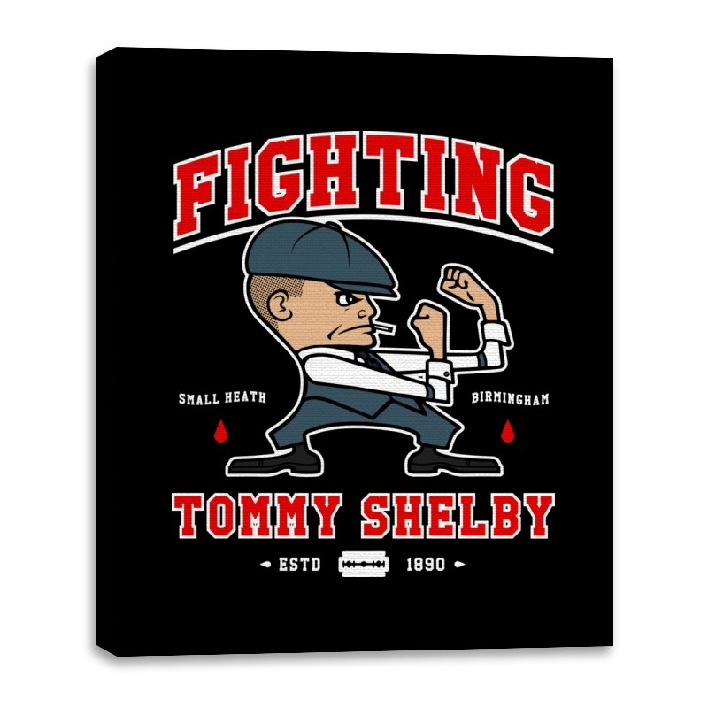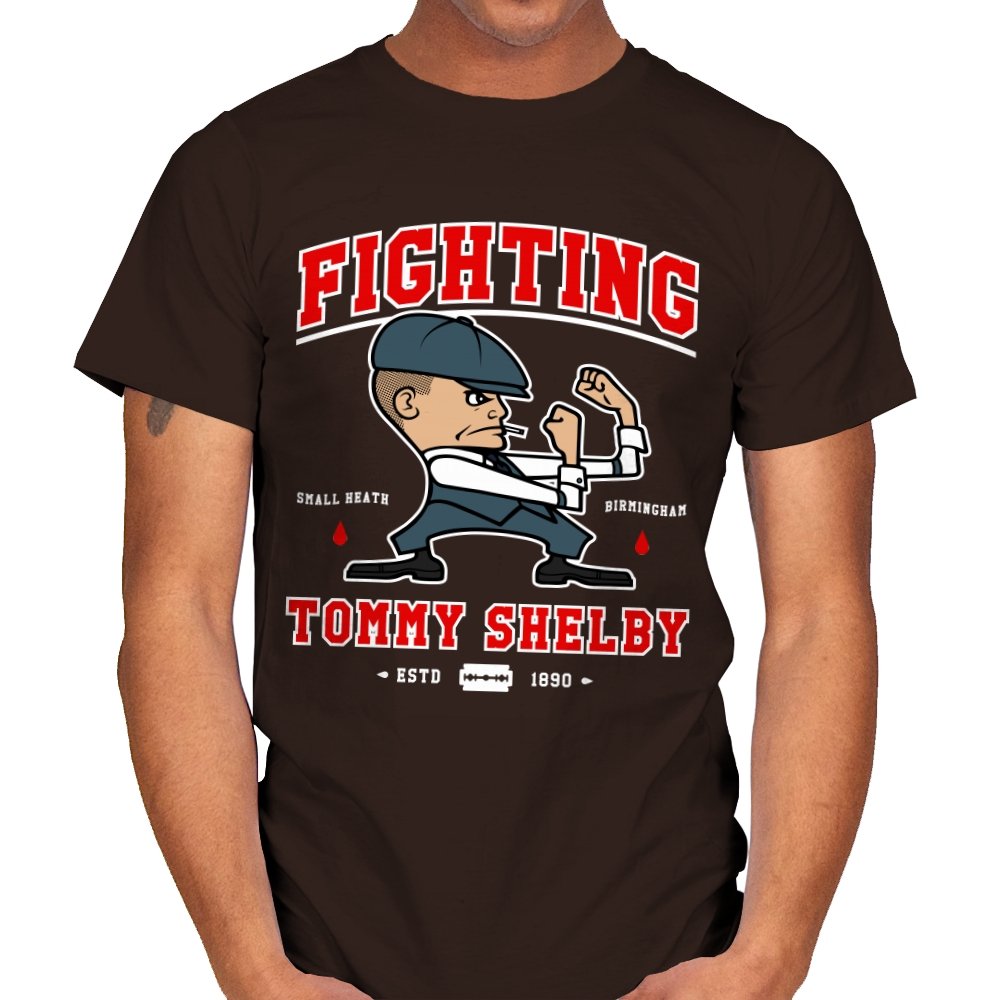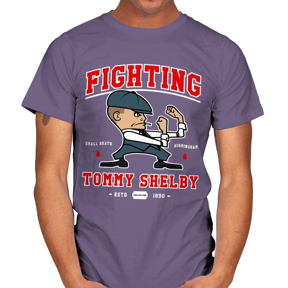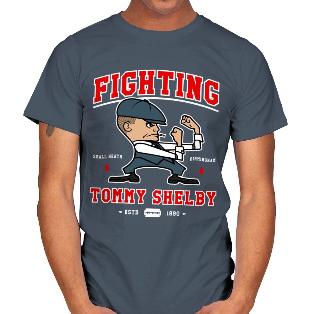 This design reimagines a certain razor sharp Birmingham strategist as a cartoon prizefighter. The flat cap stays on while he squares up in a classic boxing stance, fists tight and jaw set. The typography around him borrows from sports logos and vintage fight posters, complete with city names, dates, and tiny blood drops as punctuation. Fans immediately understand how the graphic winks at both crime saga drama and hometown pride.