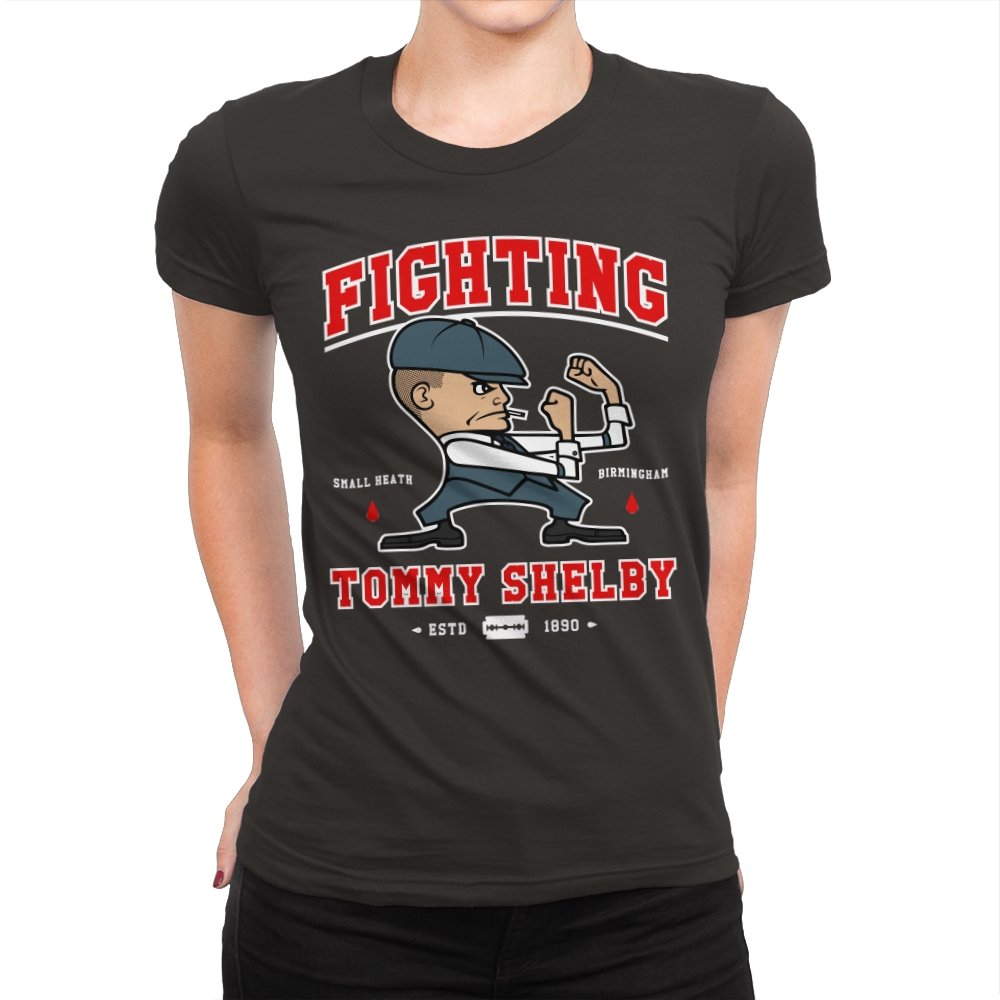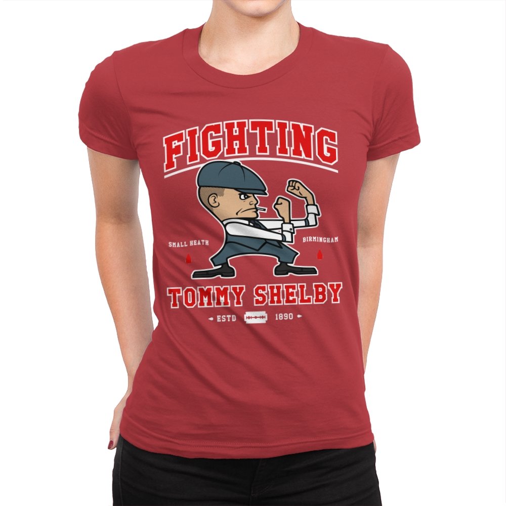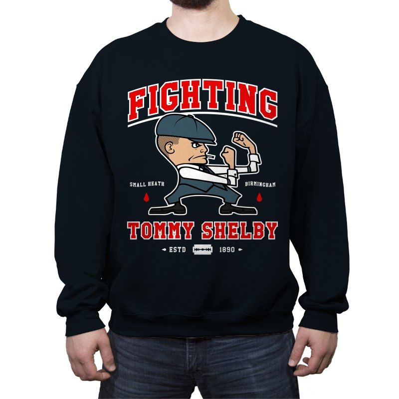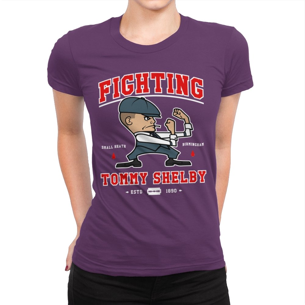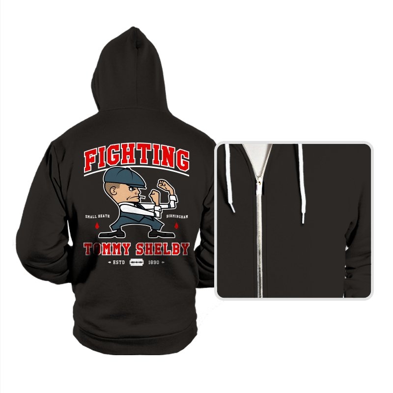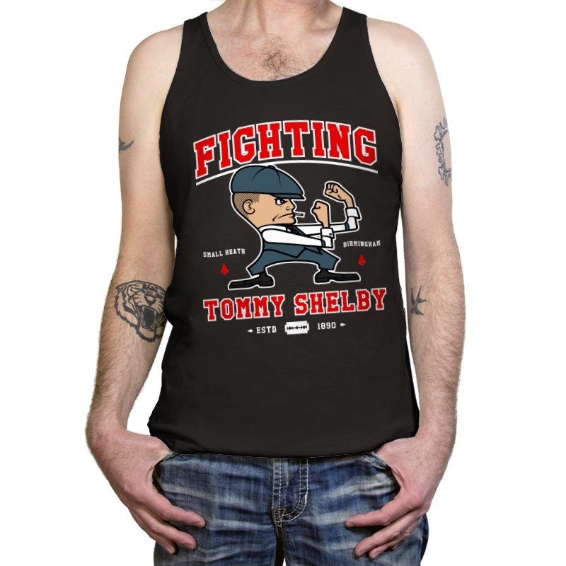 This design reimagines a certain razor sharp Birmingham strategist as a cartoon prizefighter. The flat cap stays on while he squares up in a classic boxing stance, fists tight and jaw set. The typography around him borrows from sports logos and vintage fight posters, complete with city names, dates, and tiny blood drops as punctuation. Fans immediately understand how the graphic winks at both crime saga drama and hometown pride.