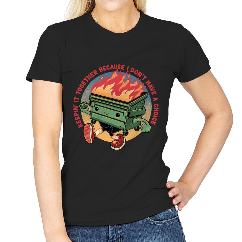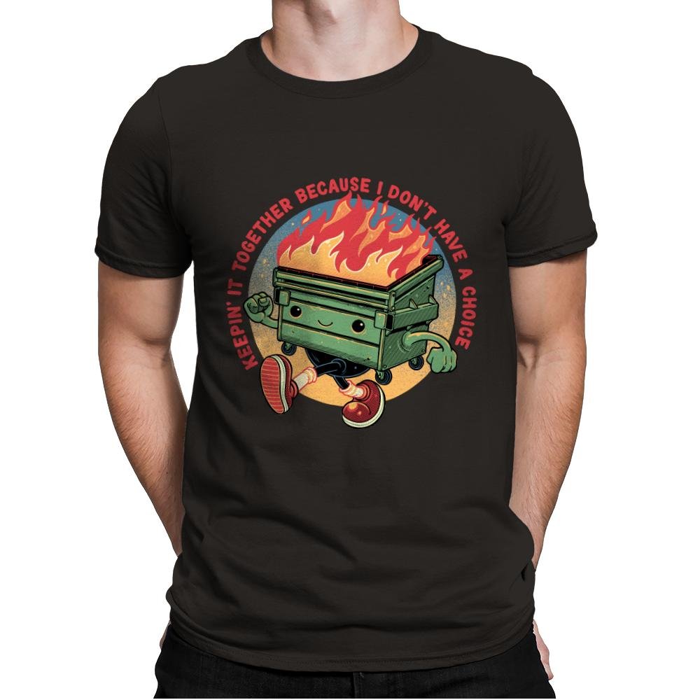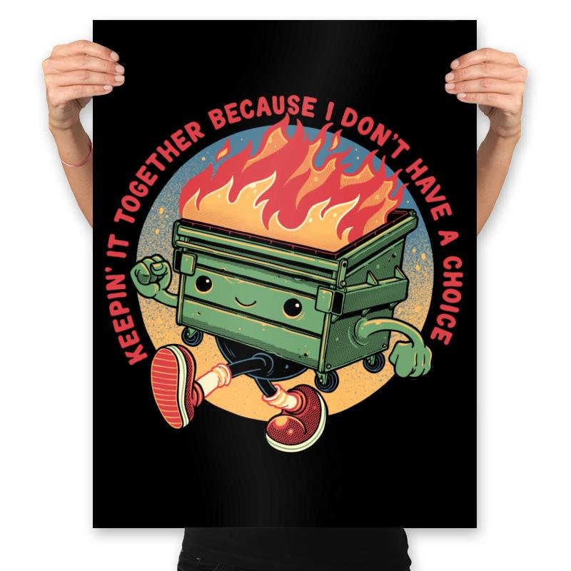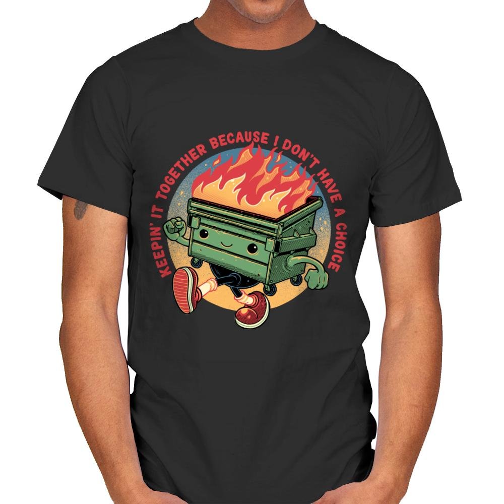 This design turns the universally understood disaster metaphor into something weirdly cheerful. A smiling dumpster jogs forward, fully engulfed, while the text frames the situation with blunt honesty. The bright flames and friendly face clash on purpose, landing somewhere between gallows humor and self-aware resignation. It feels like a cartoon coping mechanism rendered in thick lines and warm chaos.