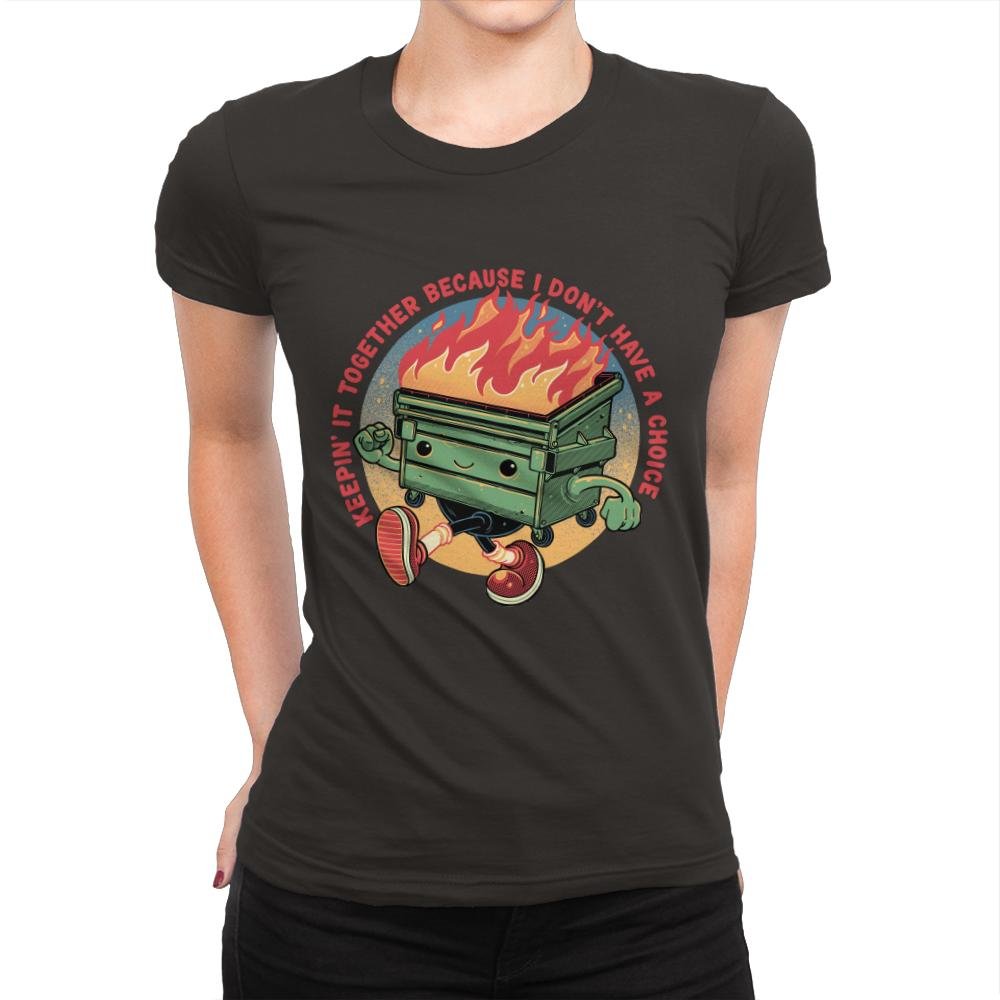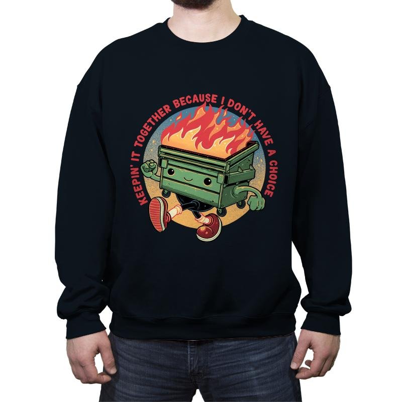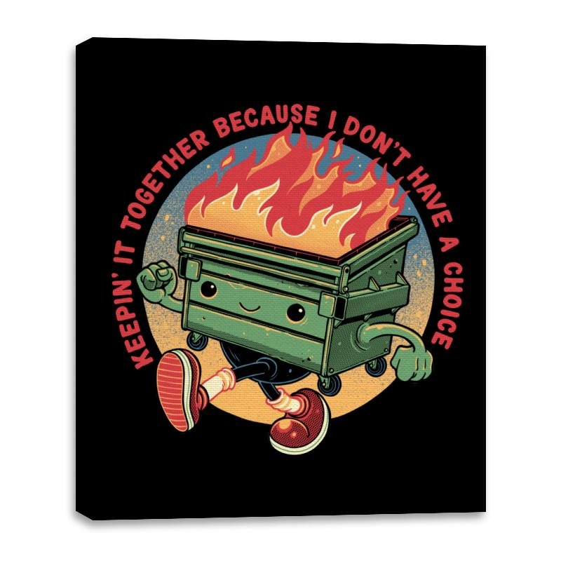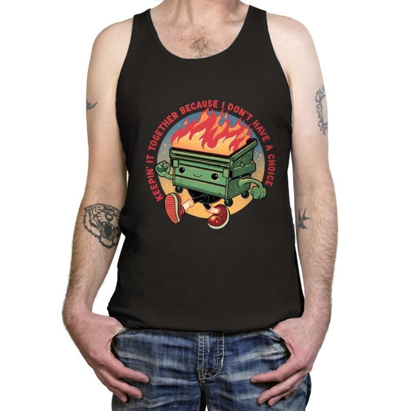 This design turns the universally understood disaster metaphor into something weirdly cheerful. A smiling dumpster jogs forward, fully engulfed, while the text frames the situation with blunt honesty. The bright flames and friendly face clash on purpose, landing somewhere between gallows humor and self-aware resignation. It feels like a cartoon coping mechanism rendered in thick lines and warm chaos.