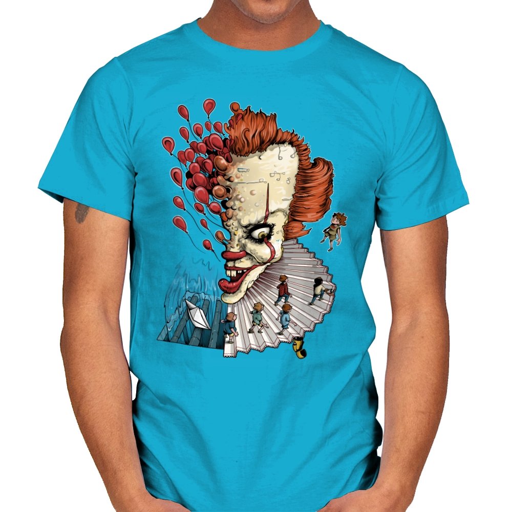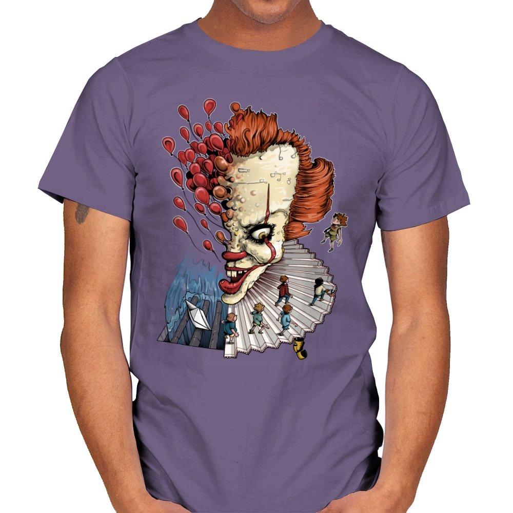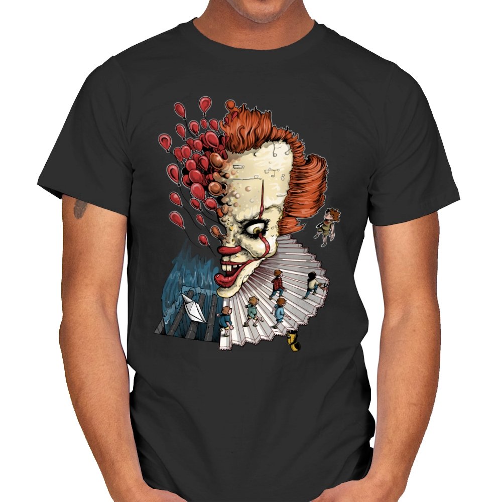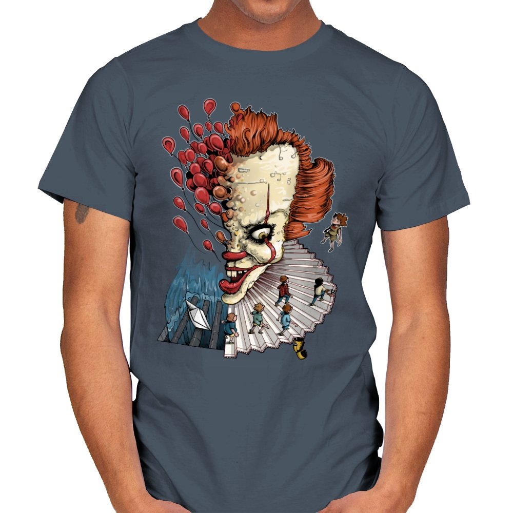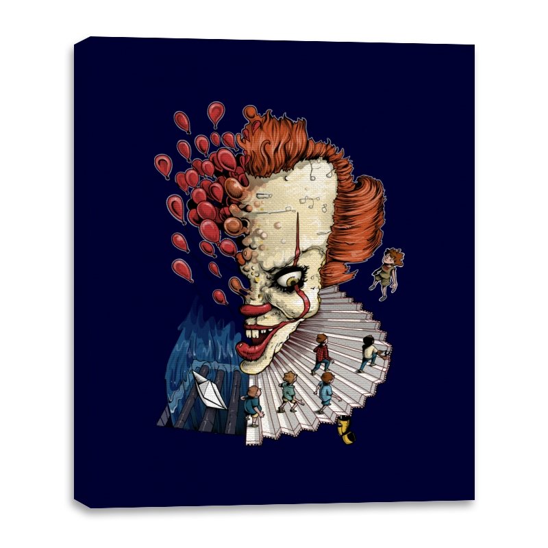 Floating Clown turns a familiar sewer nightmare into a surreal staircase of dread. The clown’s head tilts forward, all sharp teeth and painted grin, while red balloons burst outward like thoughts escaping. A tiny group of rain-coated kids walks down the ruffled collar steps toward a paper boat and a churning blue void. The scene feels equal parts storybook and fever dream, with scale-bending and perspective warping for dramatic tension.