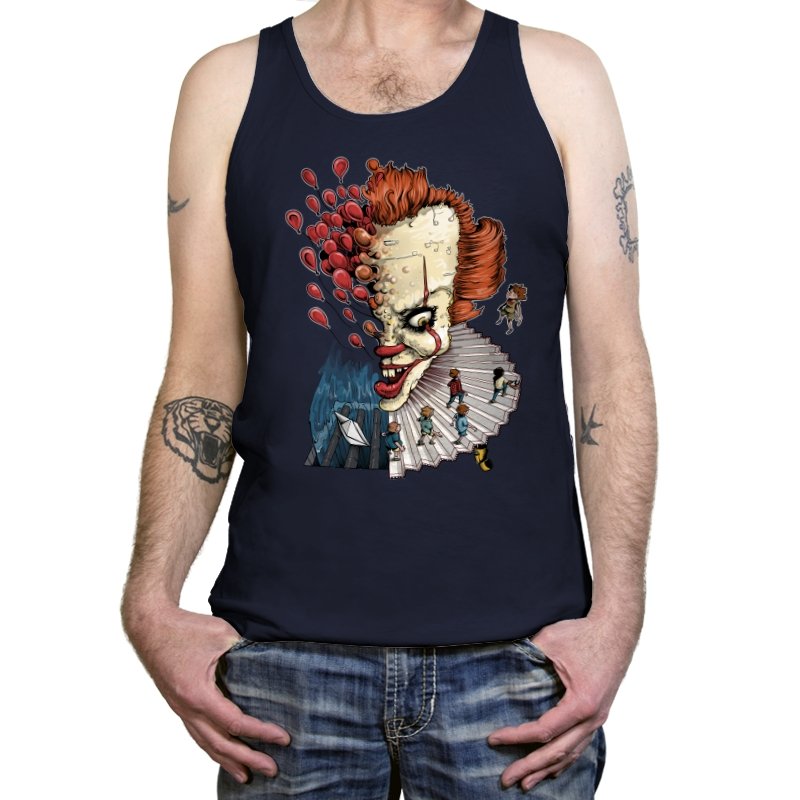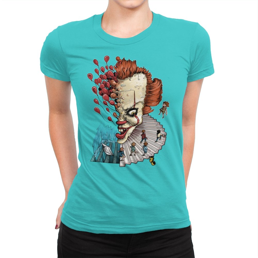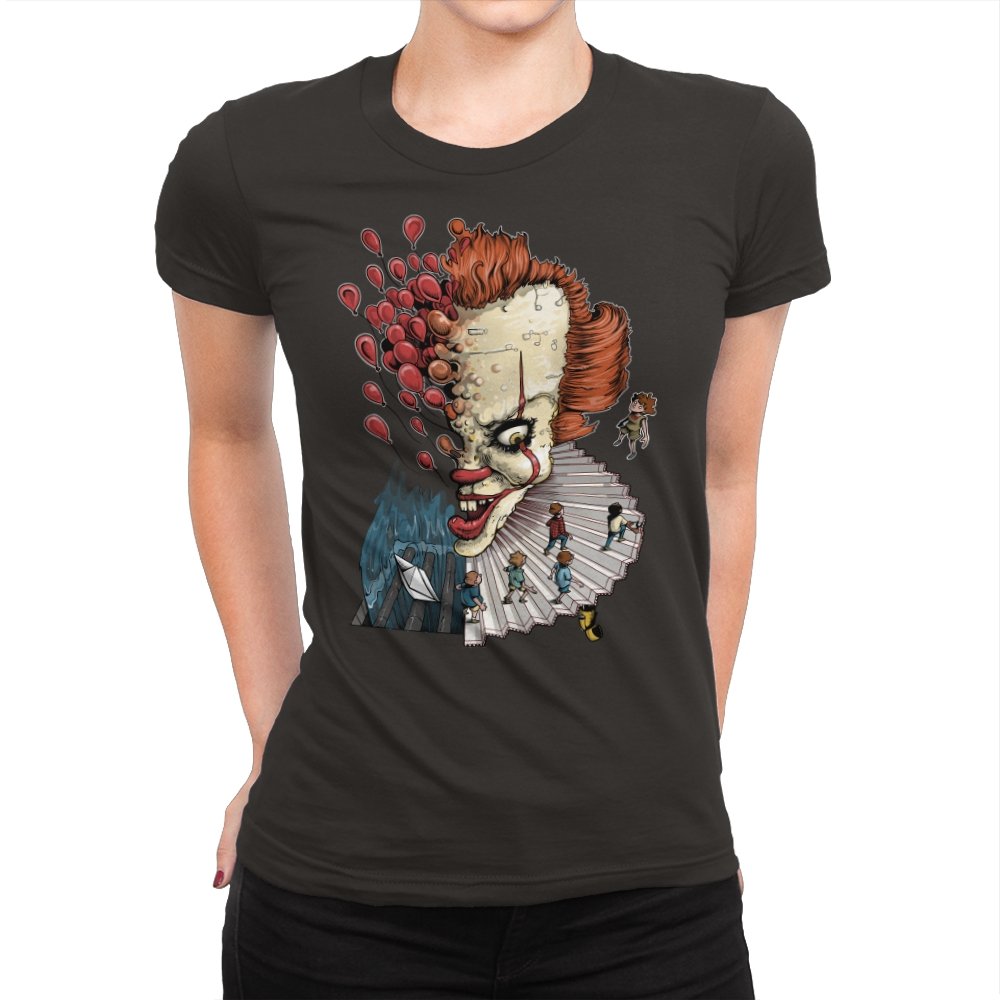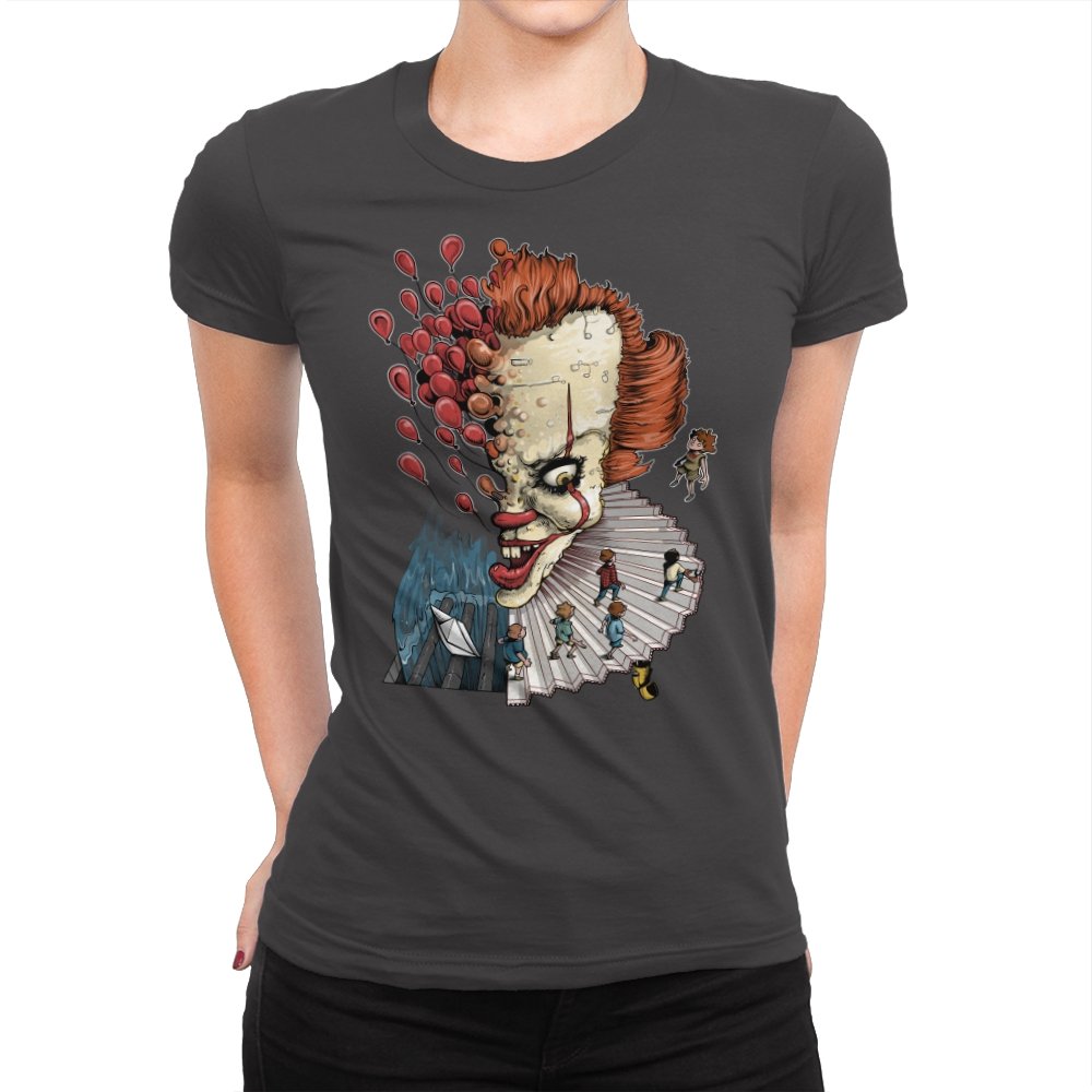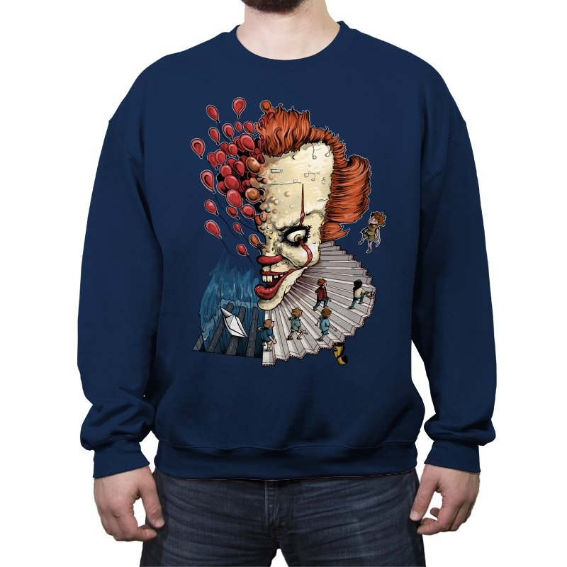 Floating Clown turns a familiar sewer nightmare into a surreal staircase of dread. The clown’s head tilts forward, all sharp teeth and painted grin, while red balloons burst outward like thoughts escaping. A tiny group of rain-coated kids walks down the ruffled collar steps toward a paper boat and a churning blue void. The scene feels equal parts storybook and fever dream, with scale-bending and perspective warping for dramatic tension.