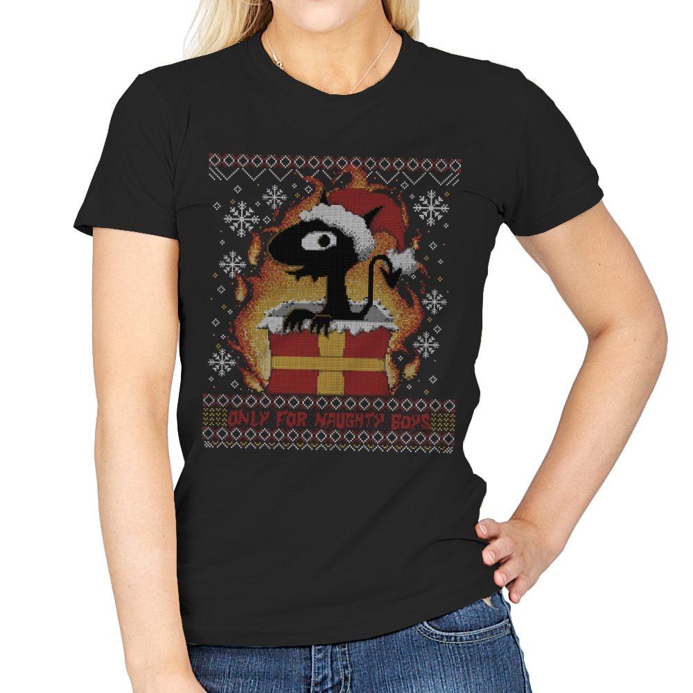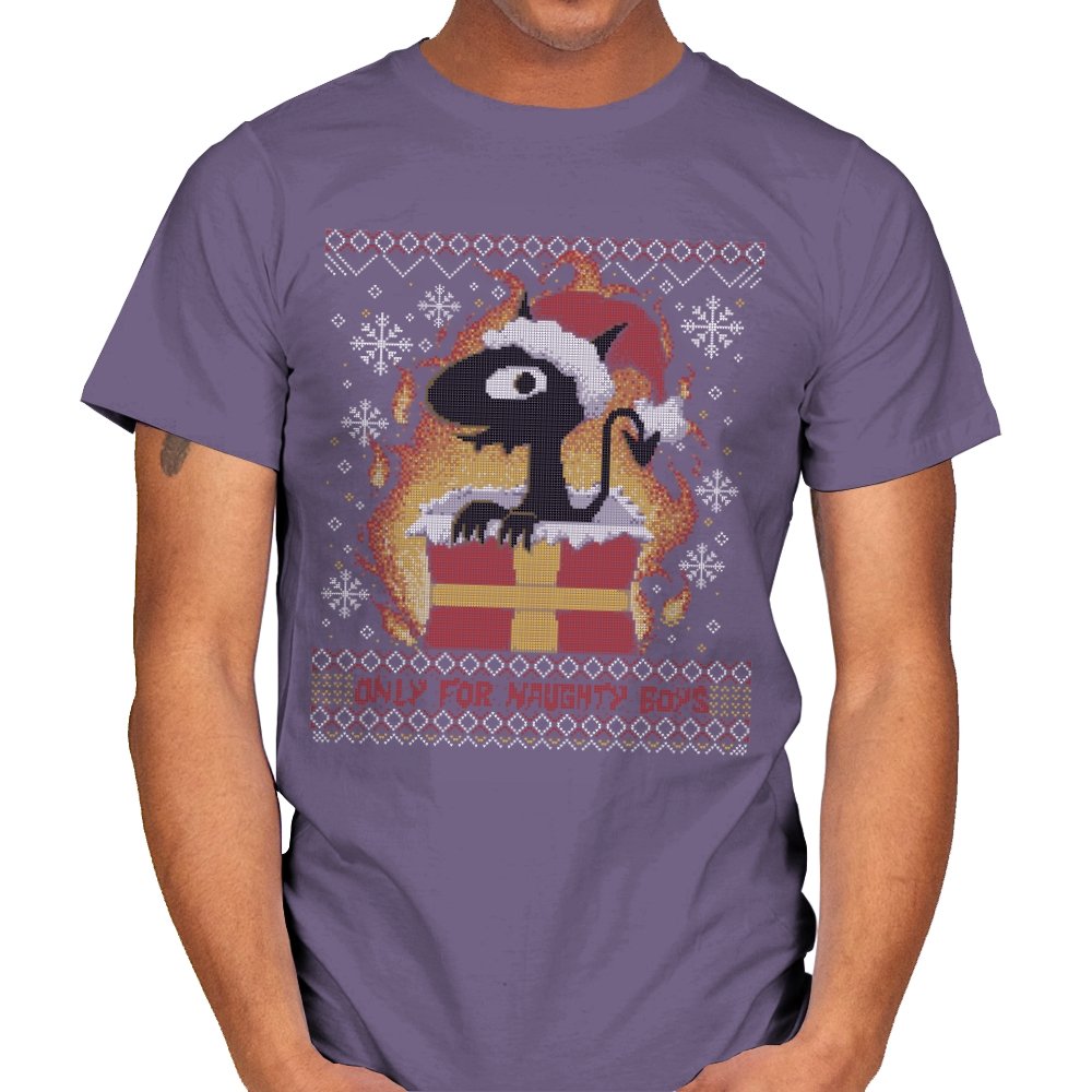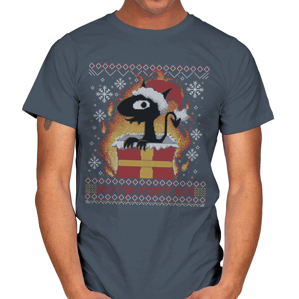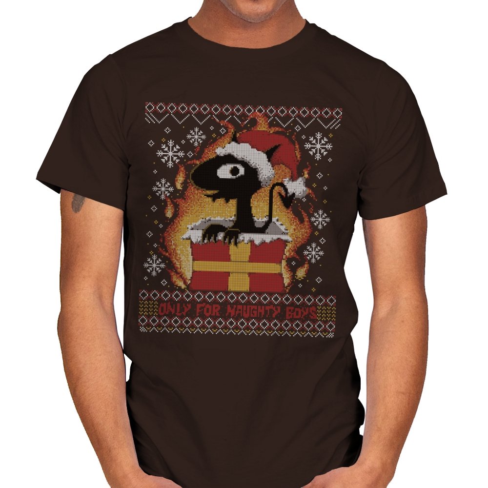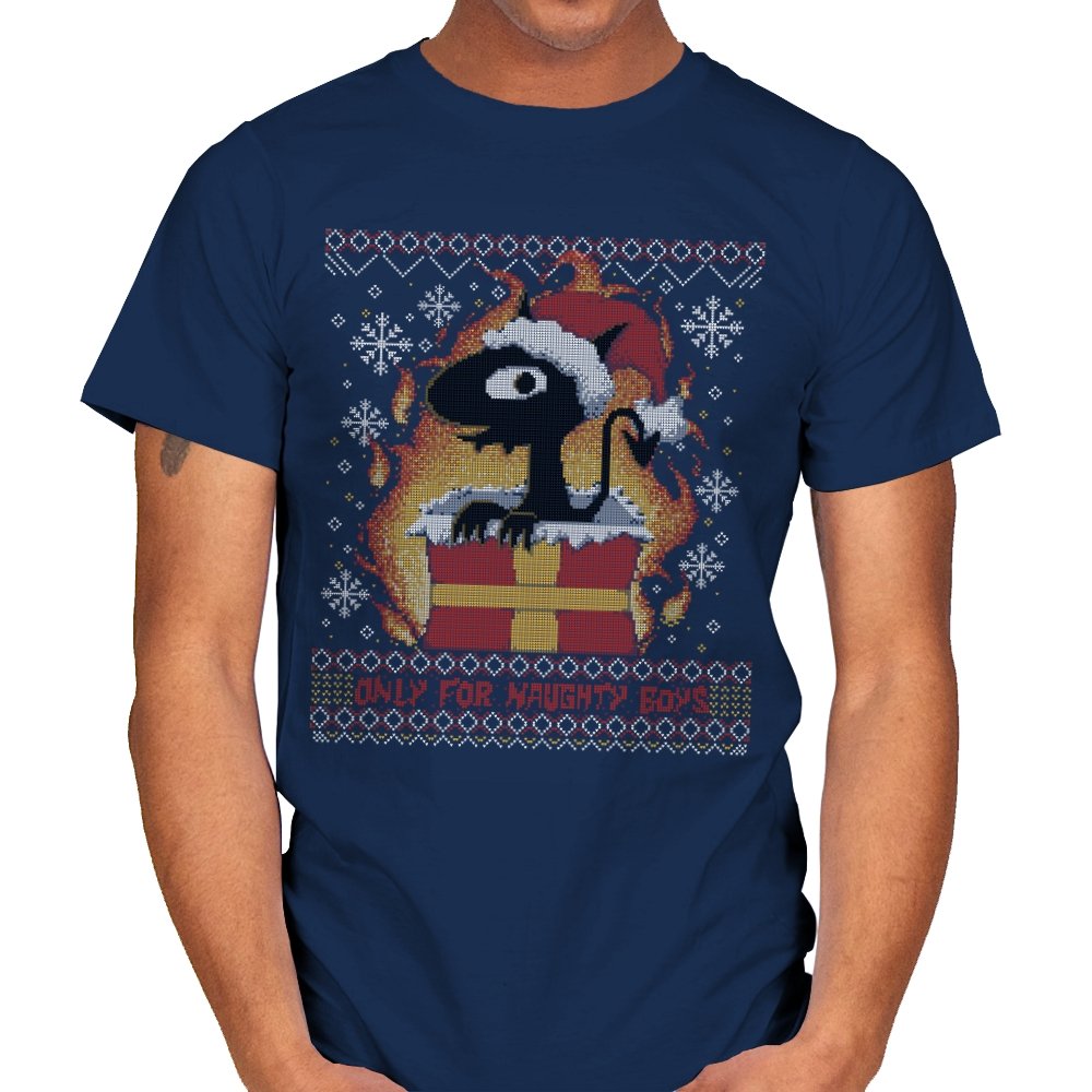 This design drops a tiny demonic creature into a holiday sweater scene. It pokes out of a wrapped box wearing a Santa hat, tail curling as flames rise behind it. Snowflake patterns surround the chaos while a stitched line reads “Only For Naughty Boys.” Fans of the source show will recognize the creature’s impish stare and love that the joke stays dark.
