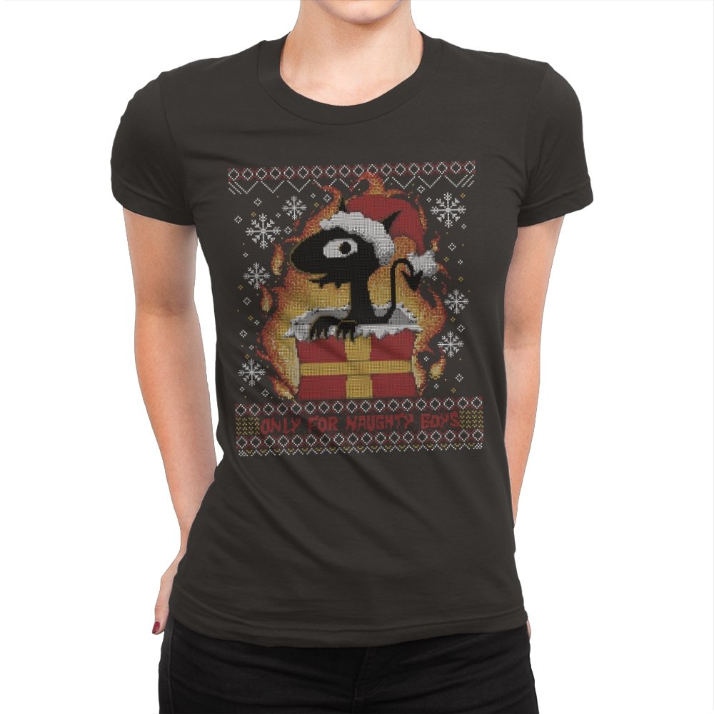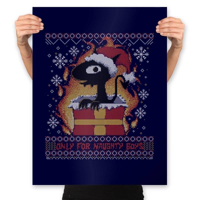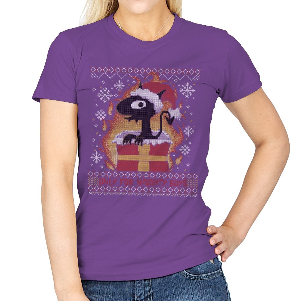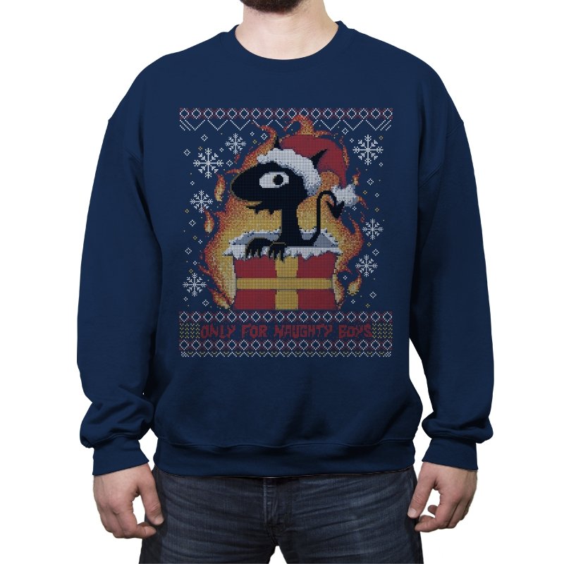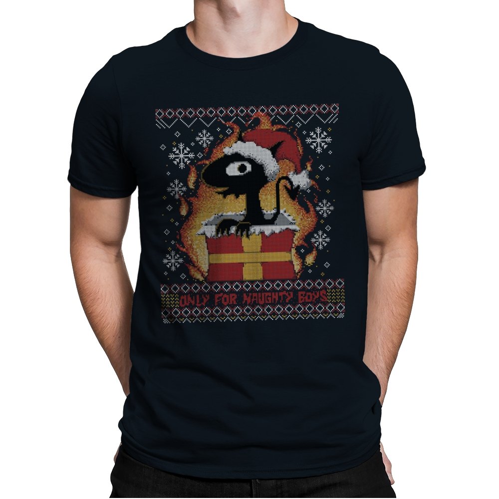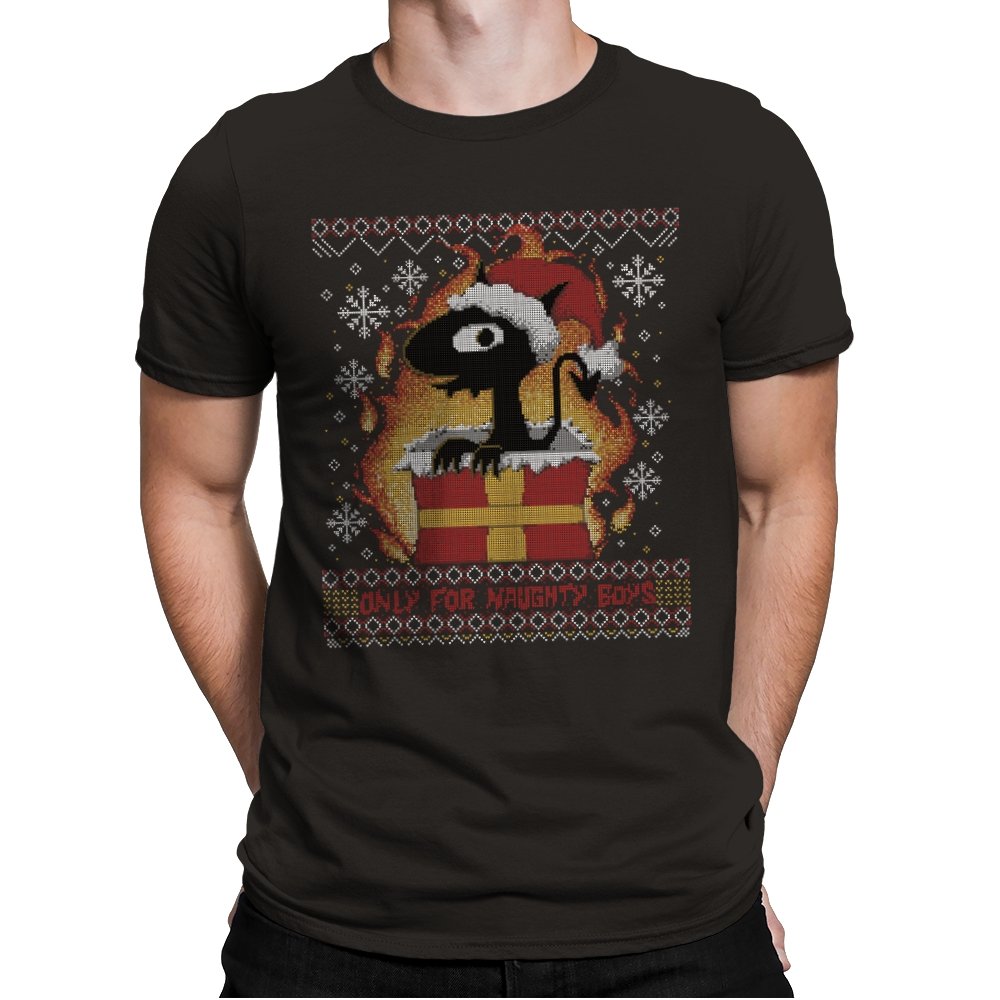 This design drops a tiny demonic creature into a holiday sweater scene. It pokes out of a wrapped box wearing a Santa hat, tail curling as flames rise behind it. Snowflake patterns surround the chaos while a stitched line reads “Only For Naughty Boys.” Fans of the source show will recognize the creature’s impish stare and love that the joke stays dark.