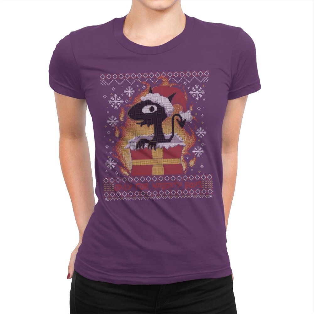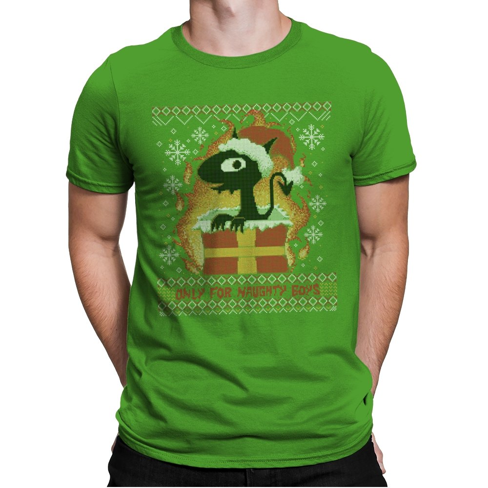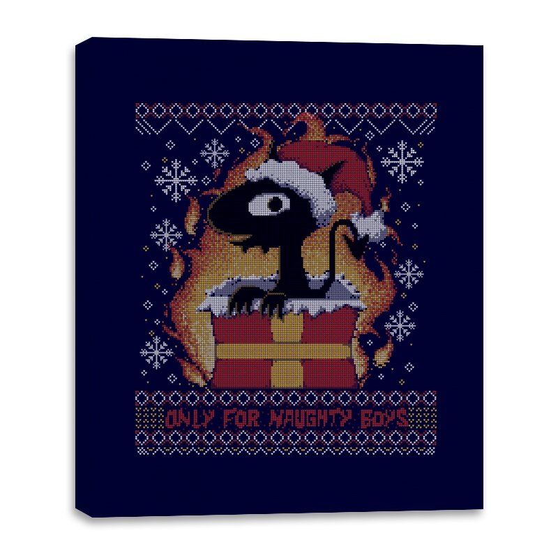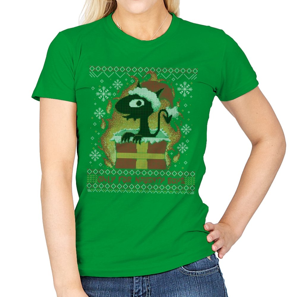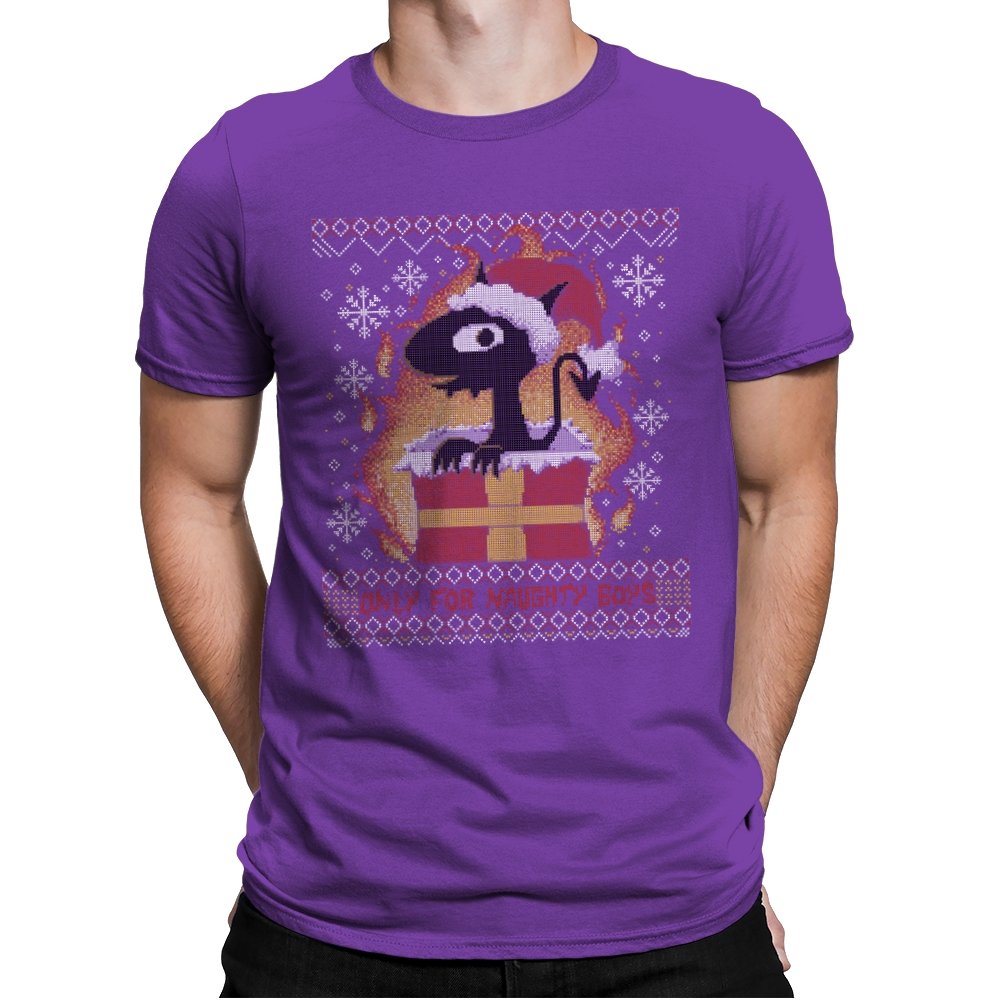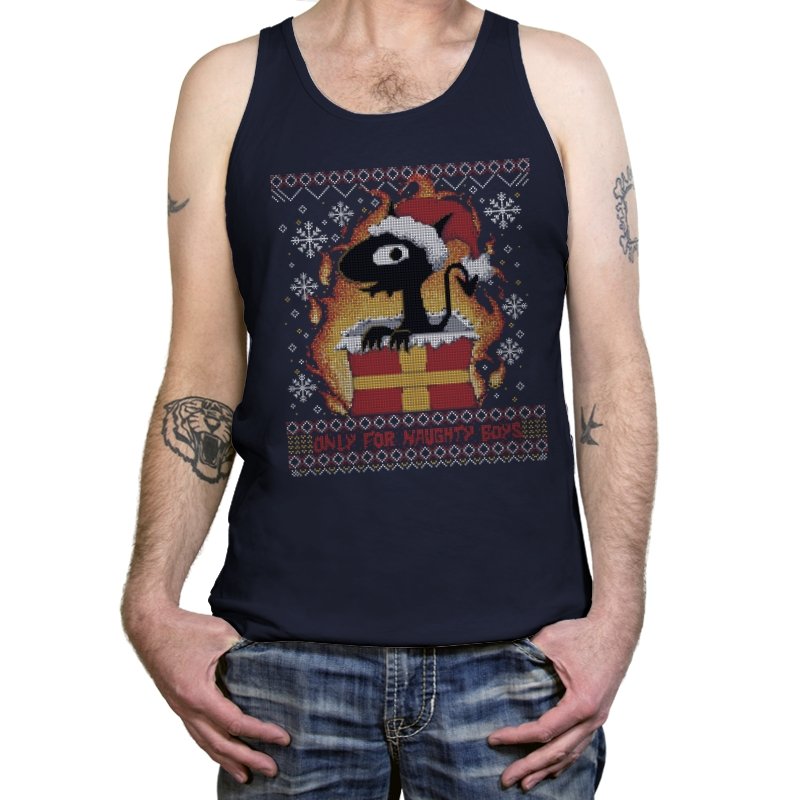 This design drops a tiny demonic creature into a holiday sweater scene. It pokes out of a wrapped box wearing a Santa hat, tail curling as flames rise behind it. Snowflake patterns surround the chaos while a stitched line reads “Only For Naughty Boys.” Fans of the source show will recognize the creature’s impish stare and love that the joke stays dark.