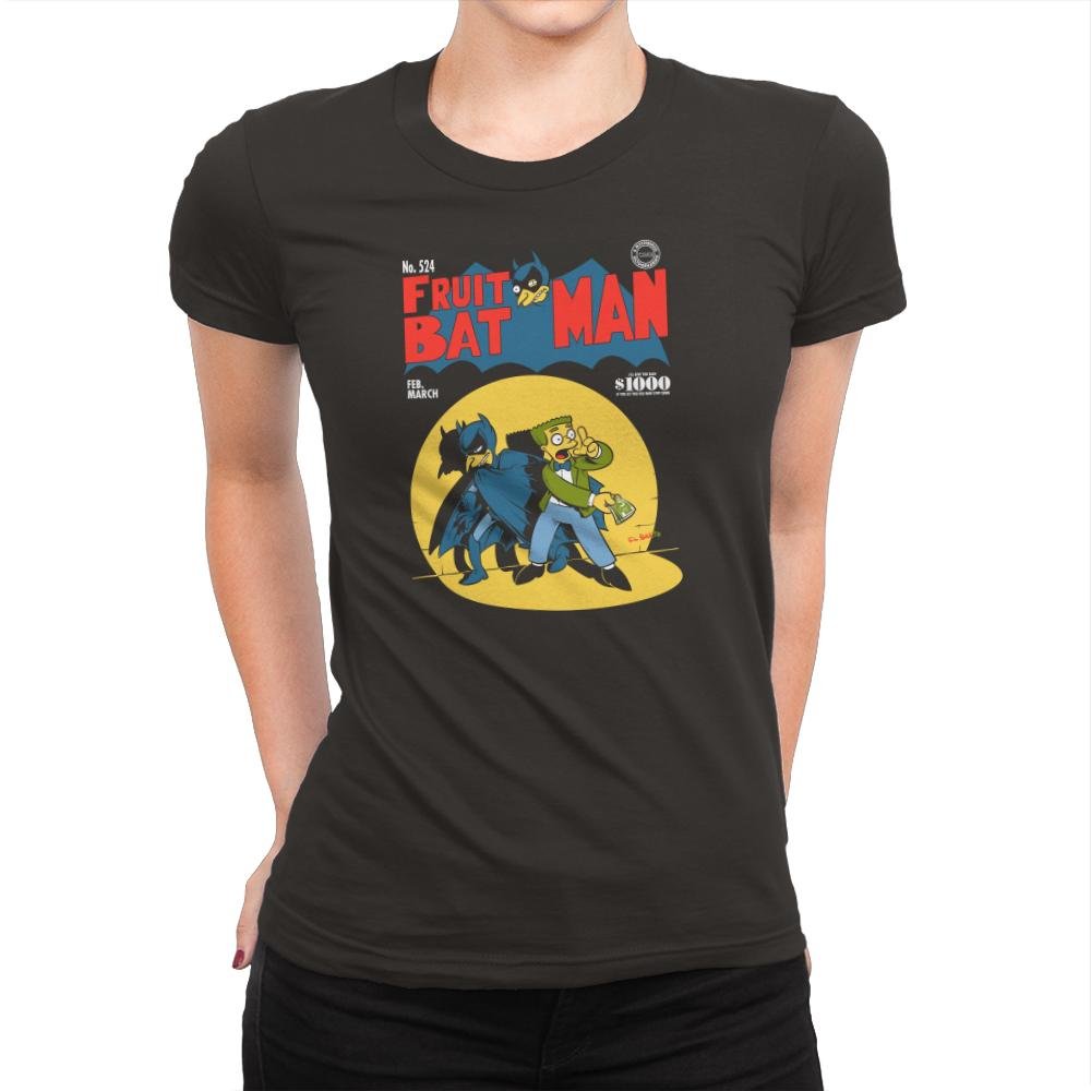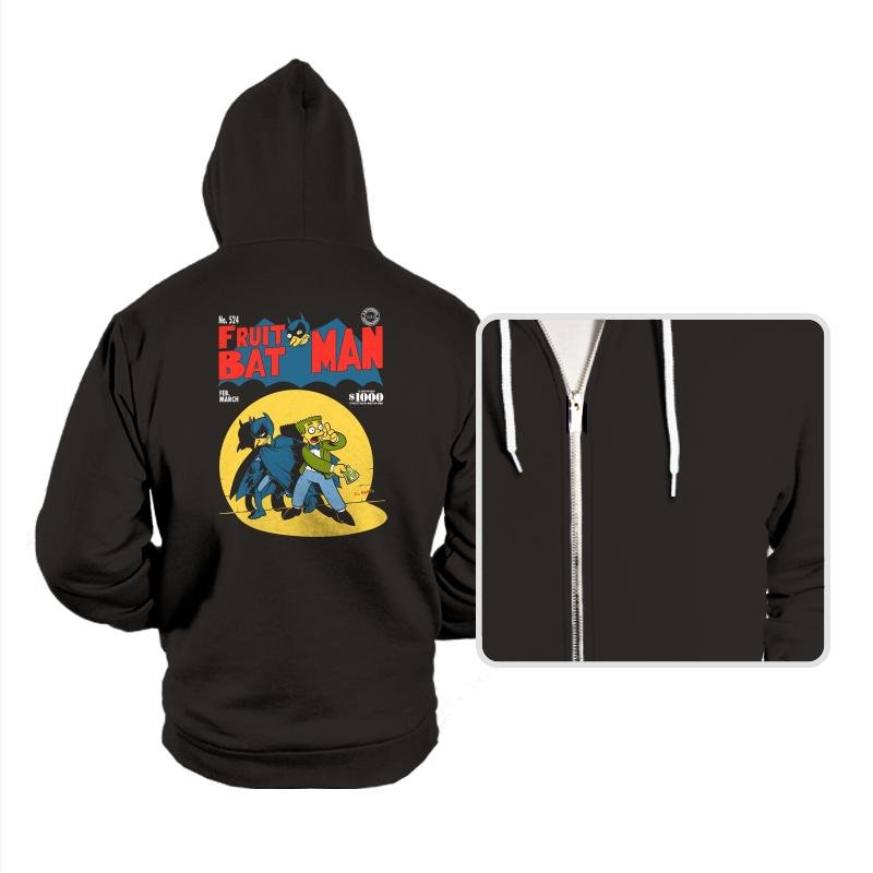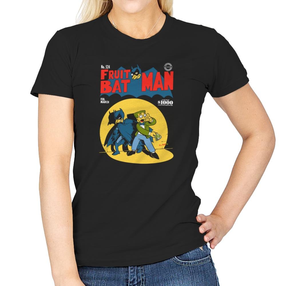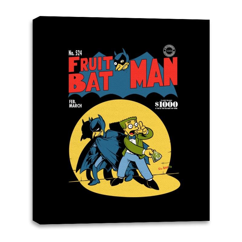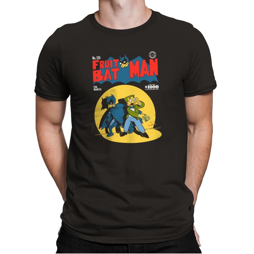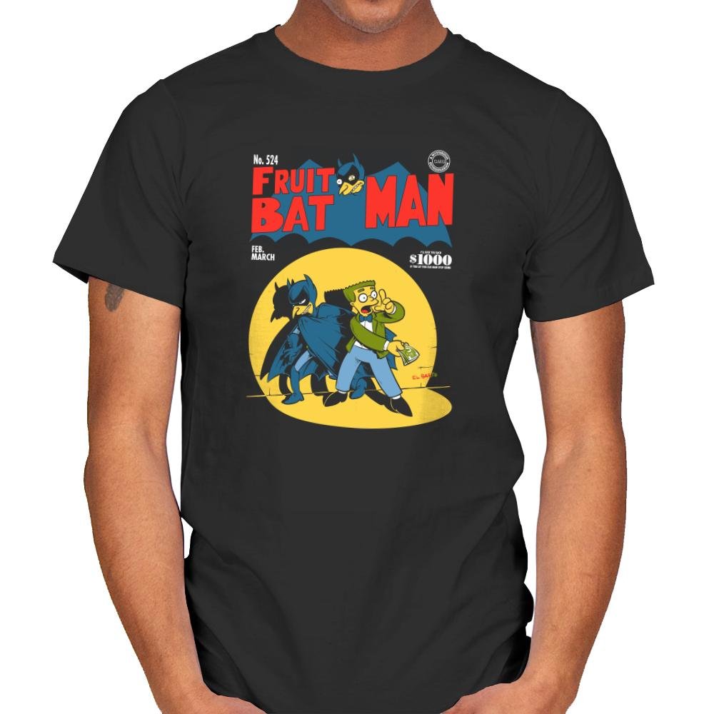 This design parodies a vintage comic cover where a brooding caped hero teams up with a yellow skinned cartoon character who is clearly in over his head. The title swaps in “Fruit Bat Man” and even includes a tiny fruit bat perched on the lettering like a fake mascot. The layout matches mid century comic styles with a price bubble, issue number, and seasonal date. Fans of both cape comics and animated sitcom weirdness will spot the crossover immediately.