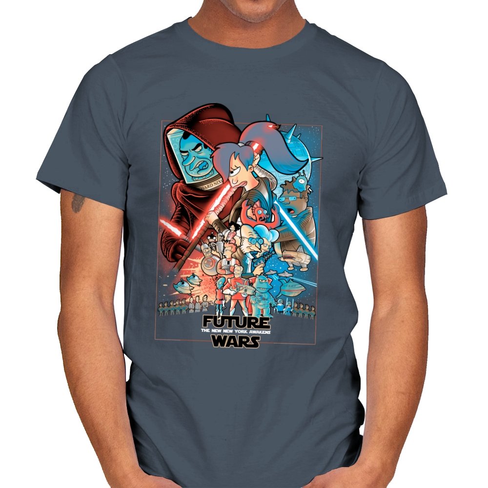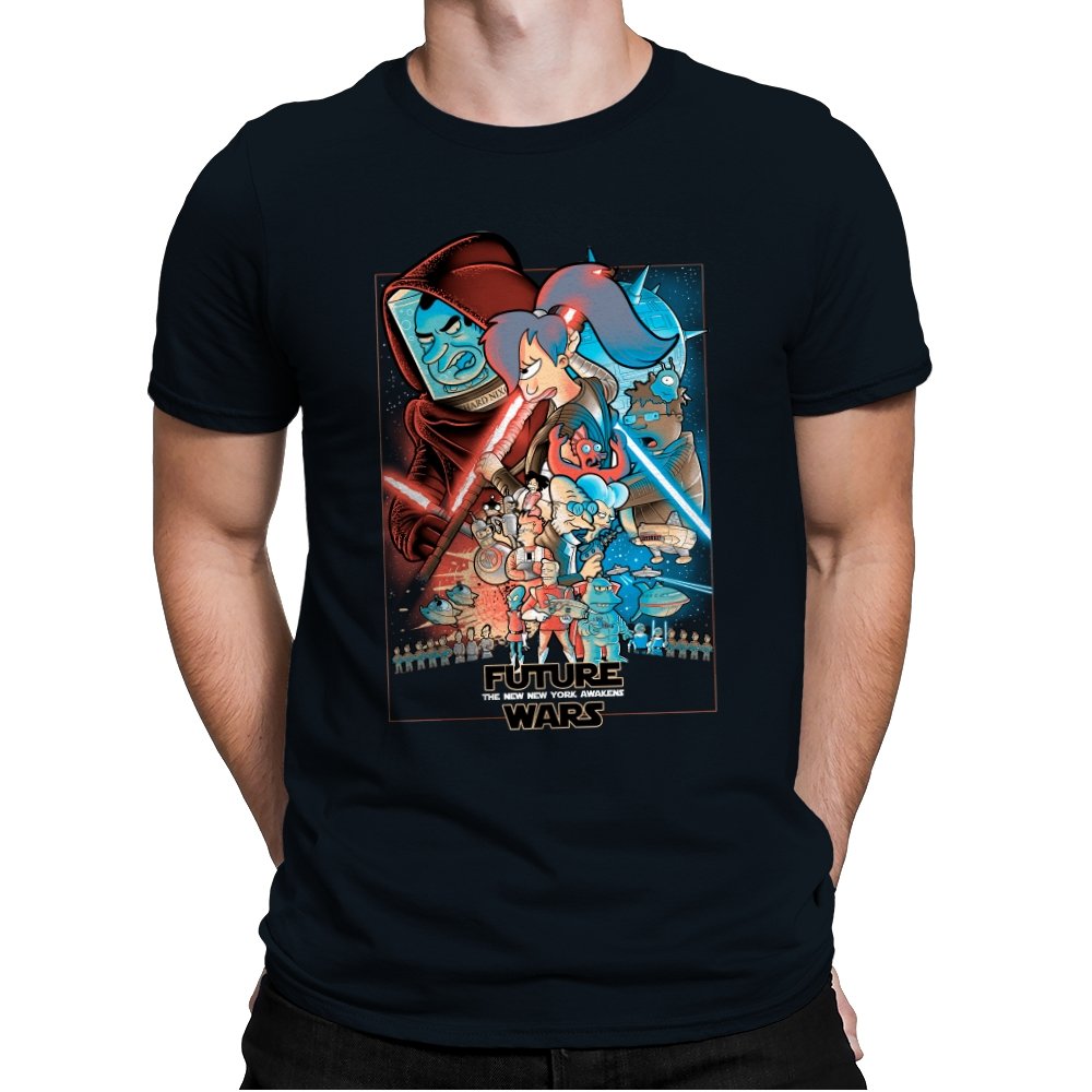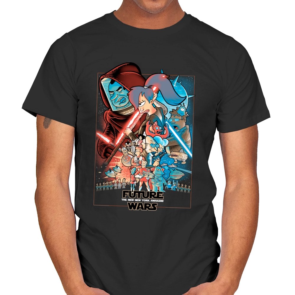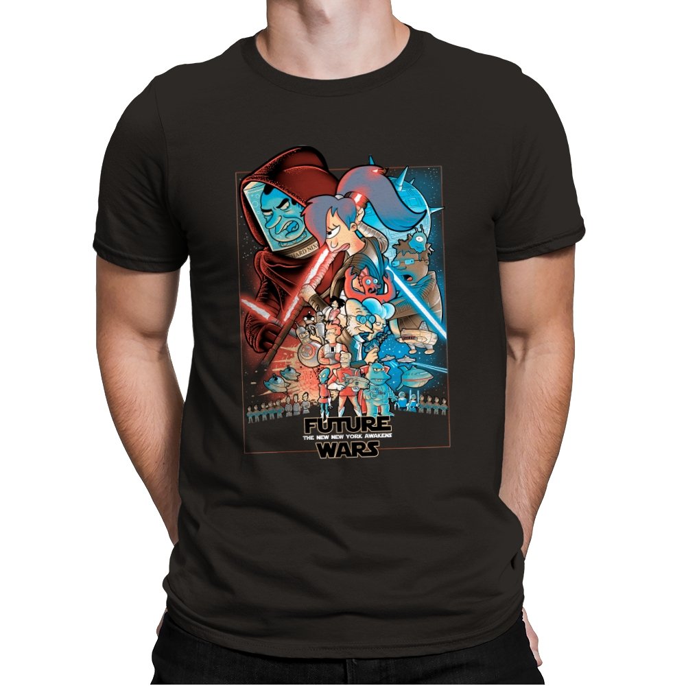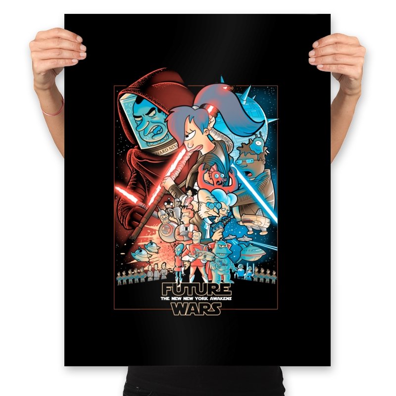 This design stages an all-out collision between space opera drama and animated sci-fi chaos. Familiar heroic and villainous silhouettes clash with glowing blades and blasters, while expressive cartoon figures anchor the center in motion and panic. The composition mirrors a classic theatrical poster, but filters it through bold colors and exaggerated emotion. Fans who know both worlds will recognize the parody immediately.