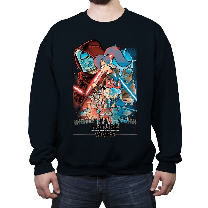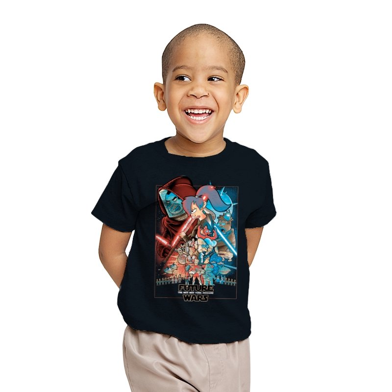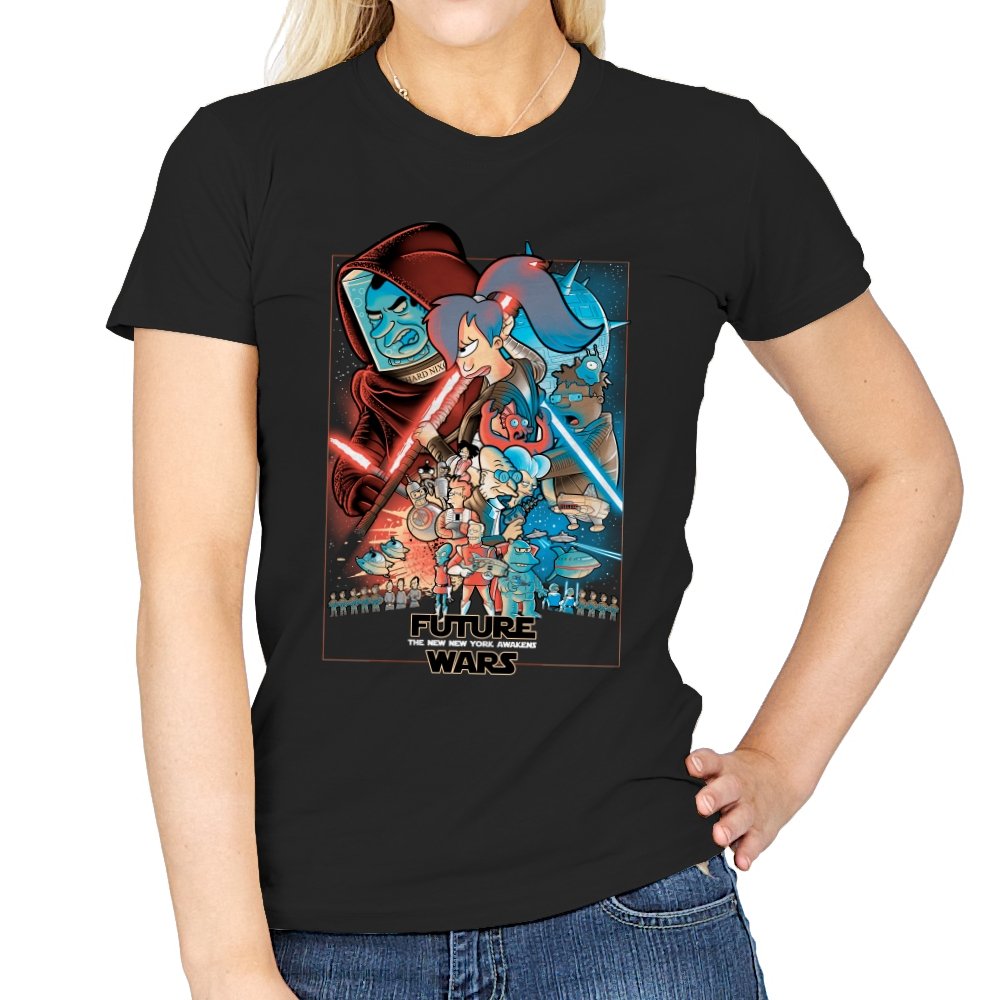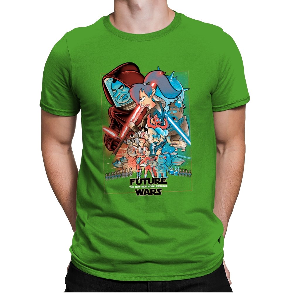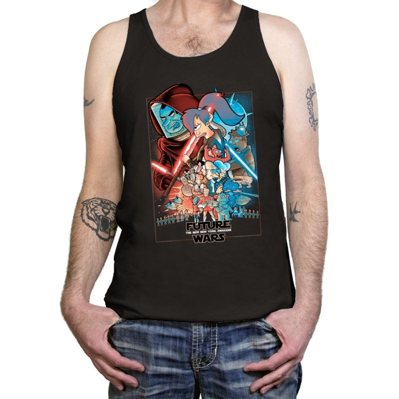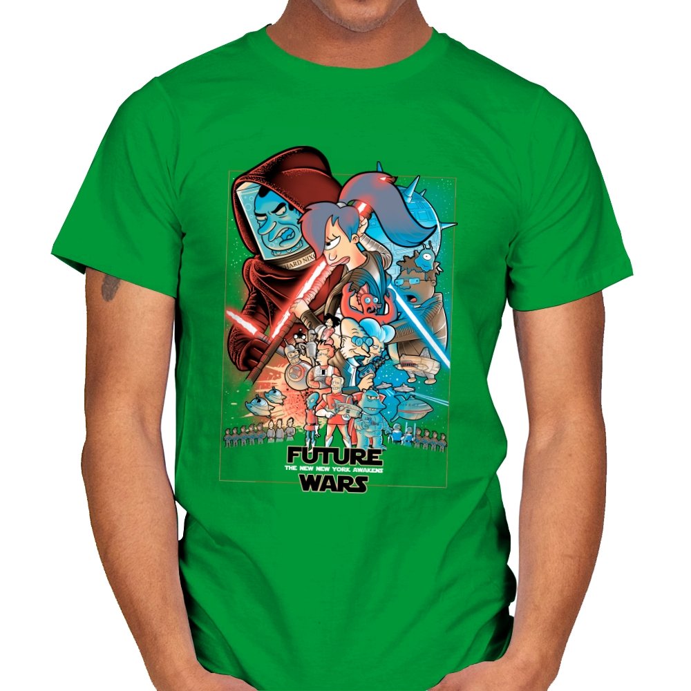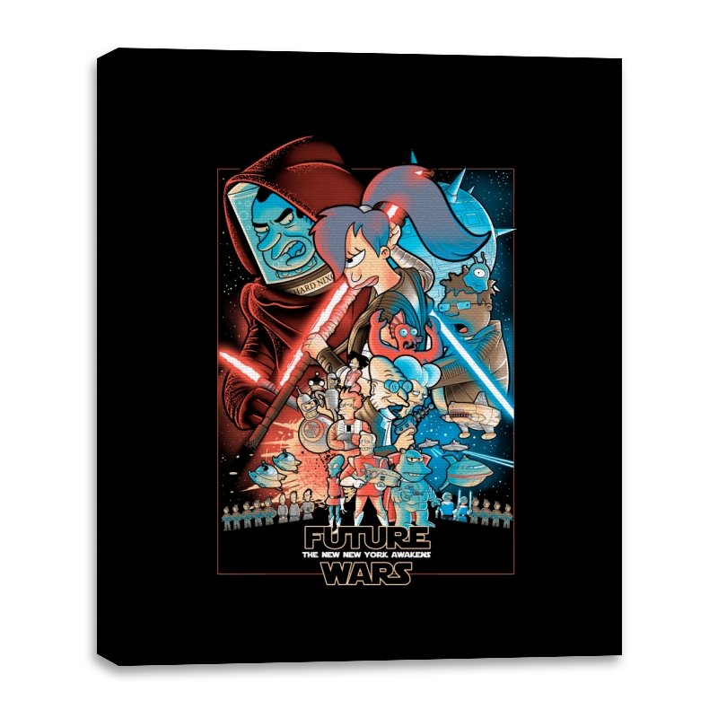 This design stages an all-out collision between space opera drama and animated sci-fi chaos. Familiar heroic and villainous silhouettes clash with glowing blades and blasters, while expressive cartoon figures anchor the center in motion and panic. The composition mirrors a classic theatrical poster, but filters it through bold colors and exaggerated emotion. Fans who know both worlds will recognize the parody immediately.