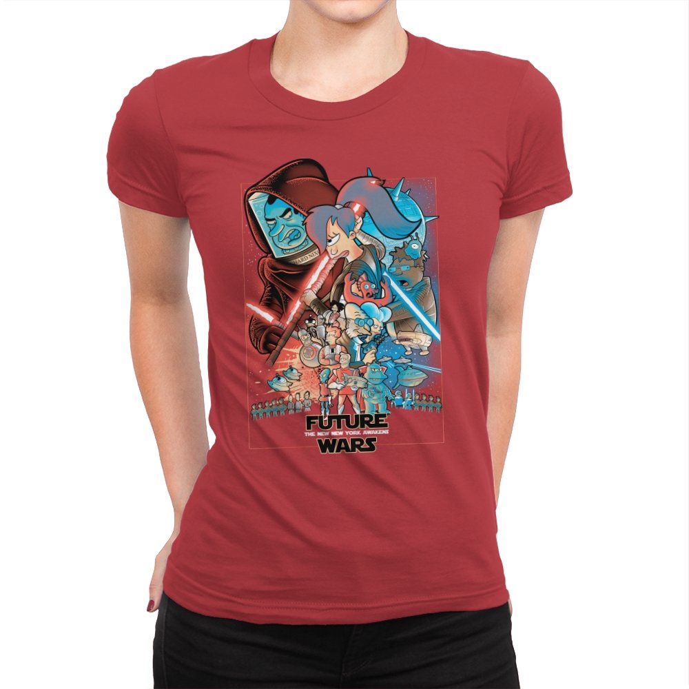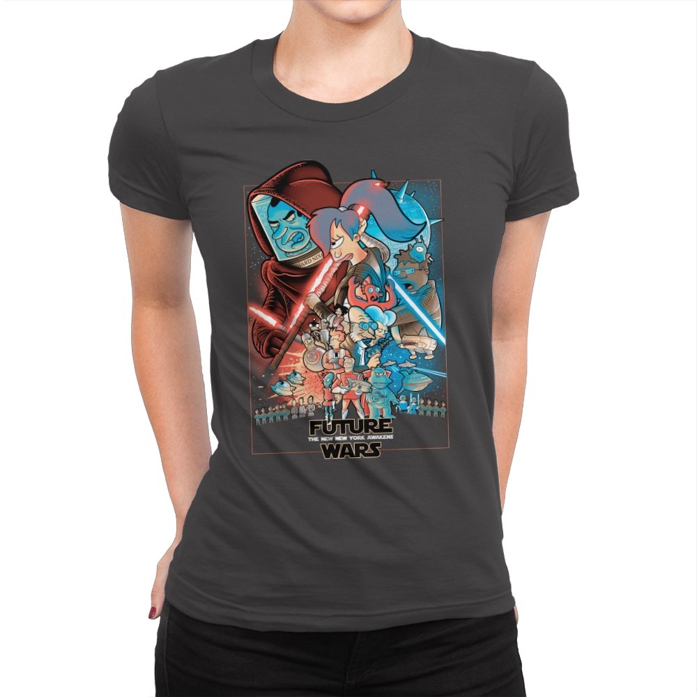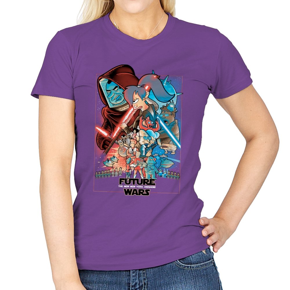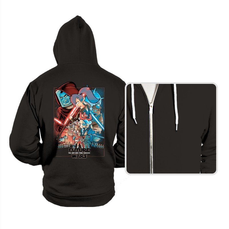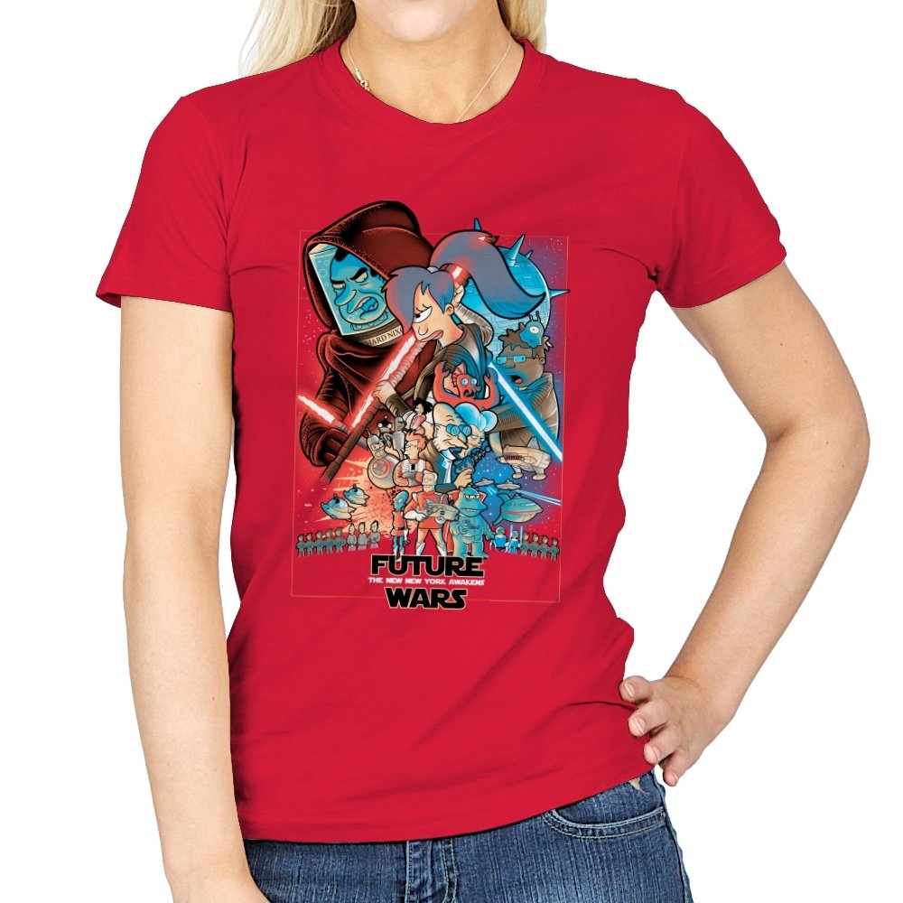 This design stages an all-out collision between space opera drama and animated sci-fi chaos. Familiar heroic and villainous silhouettes clash with glowing blades and blasters, while expressive cartoon figures anchor the center in motion and panic. The composition mirrors a classic theatrical poster, but filters it through bold colors and exaggerated emotion. Fans who know both worlds will recognize the parody immediately.