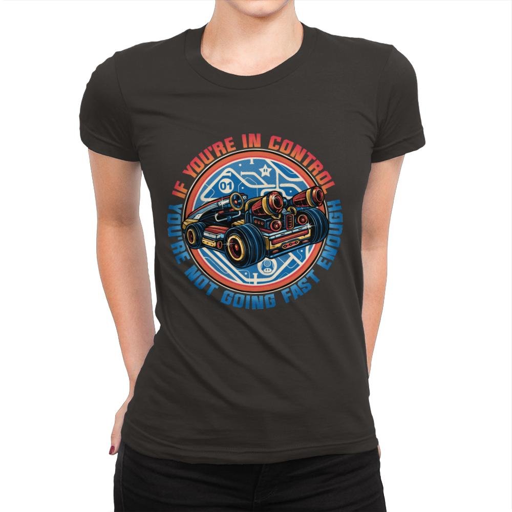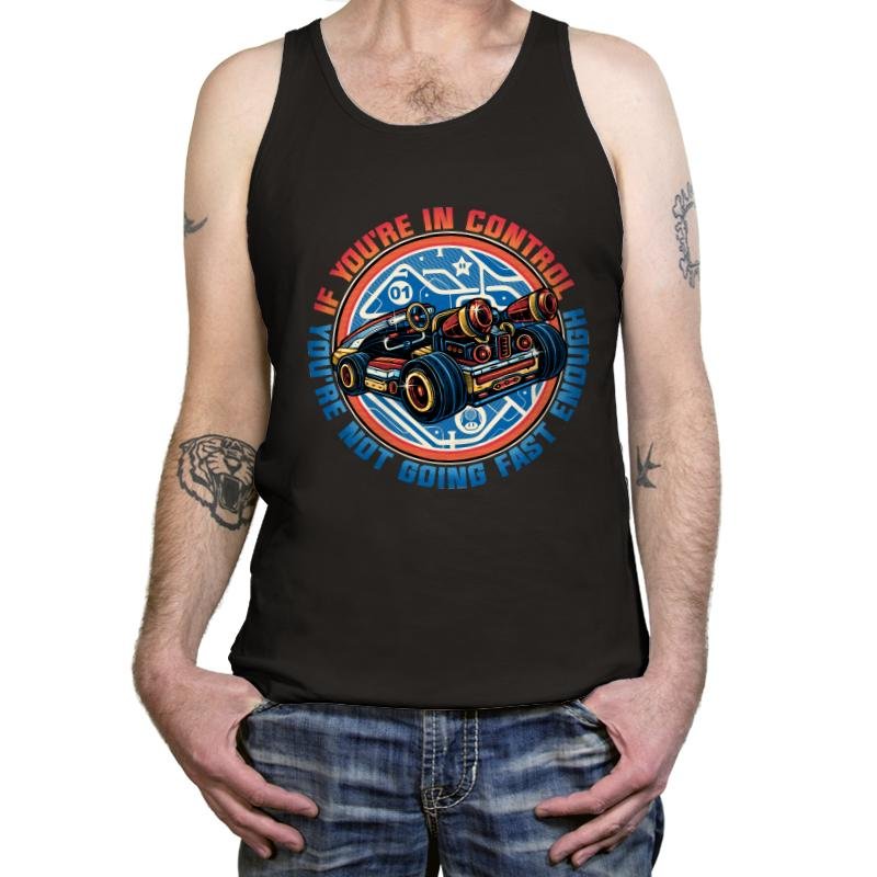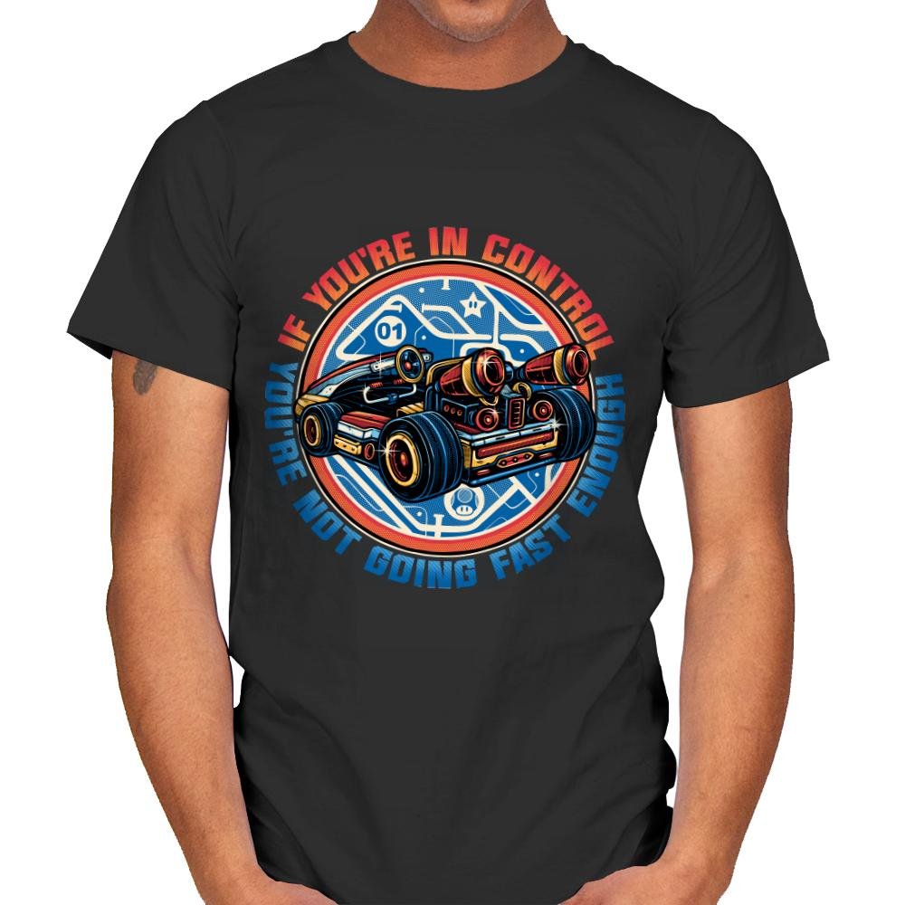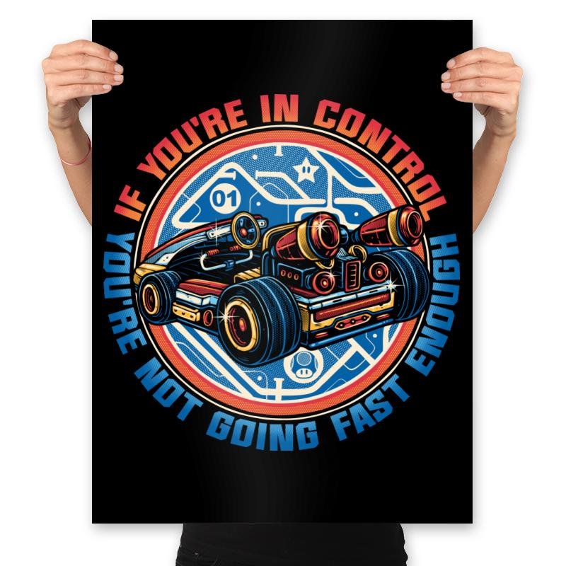 This design centers on a low slung sci fi racer built like a weapon, all exposed engines, oversized wheels, and glowing tech lines. The circular badge framing and blueprint style graphics suggest a future where speed is engineered, not accidental. The phrase around it reads like a warning and a joke at the same time, aimed at anyone who understands that control and velocity rarely coexist. It feels pulled from arcade cabinets, racing sims, and animated futures that never slow down.