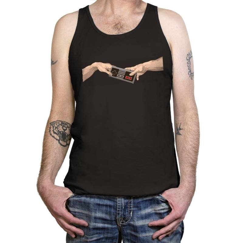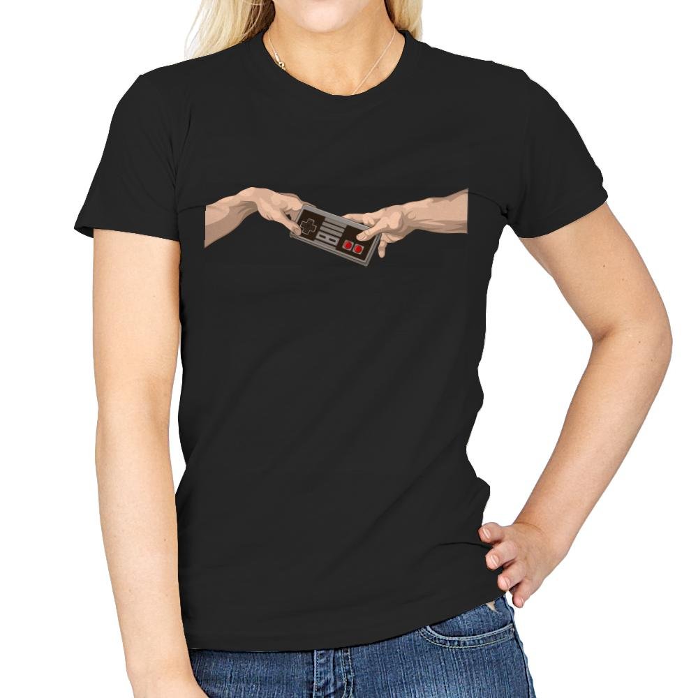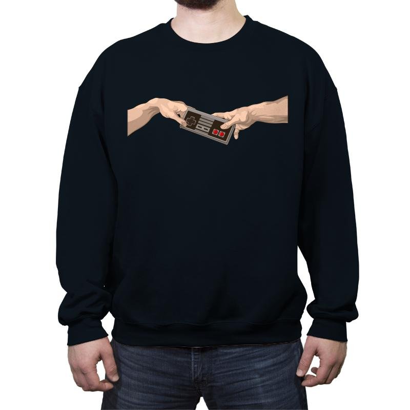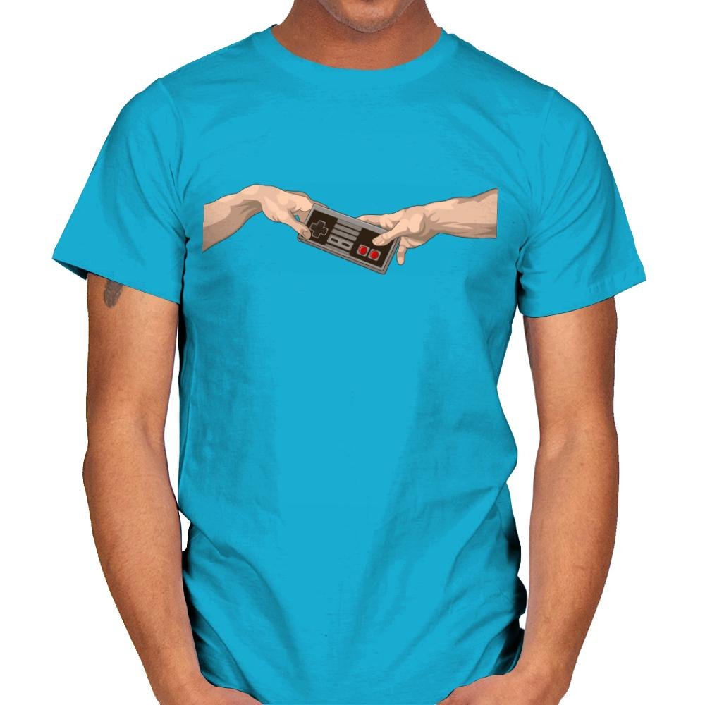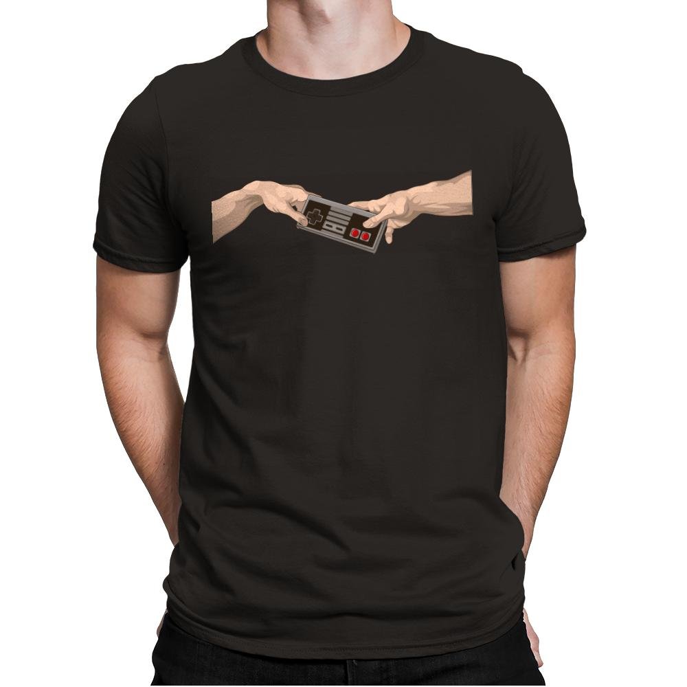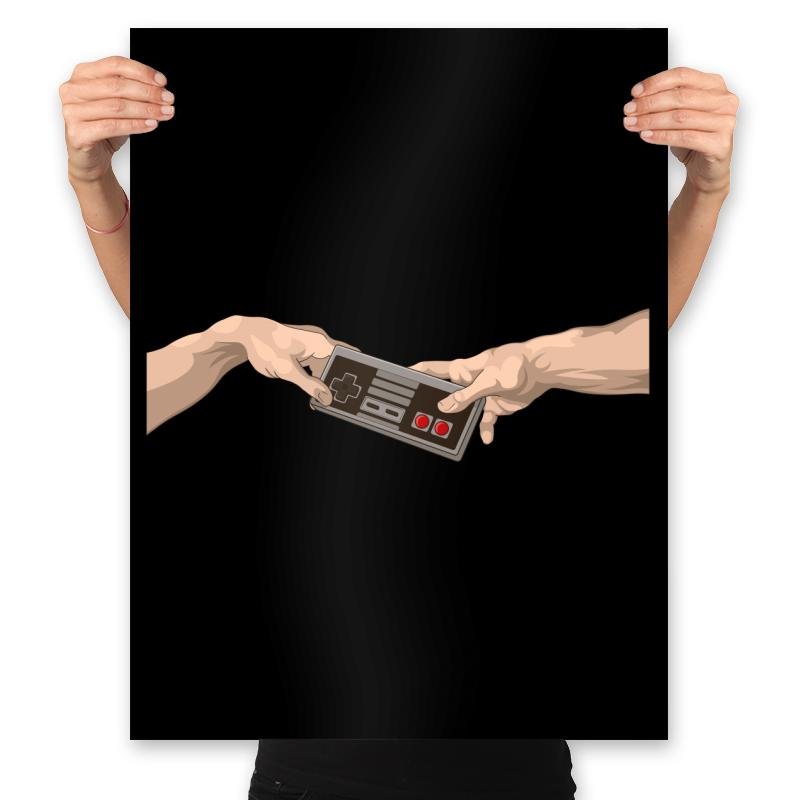 Two hands reach toward each other across empty space, but instead of a spark, they share a classic game controller. The pose mirrors a famous ceiling fresco composition, swapped with pure button mashing culture. Minimal lines and strong contrast keep the joke clean and instantly readable. It turns digital power ups into something almost sacred.