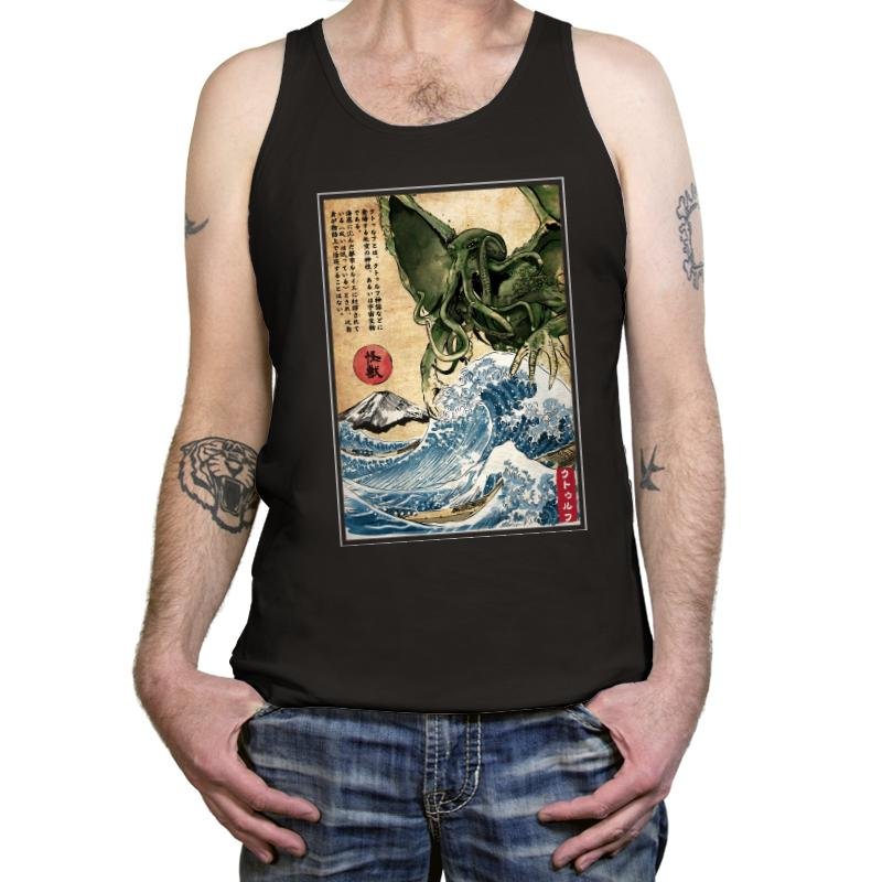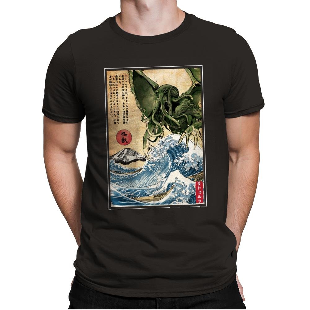 This design merges a certain cosmic sea deity with the visual language of Edo era prints. Tentacles loom above crashing waves, while a familiar peak sits calmly in the distance. The aged paper texture and vertical script sell the illusion of a forgotten woodblock, as if the artist documented a myth no sailor survived to tell. Fans of pulp horror and Japanese art history will spot the reference immediately.