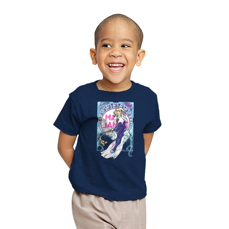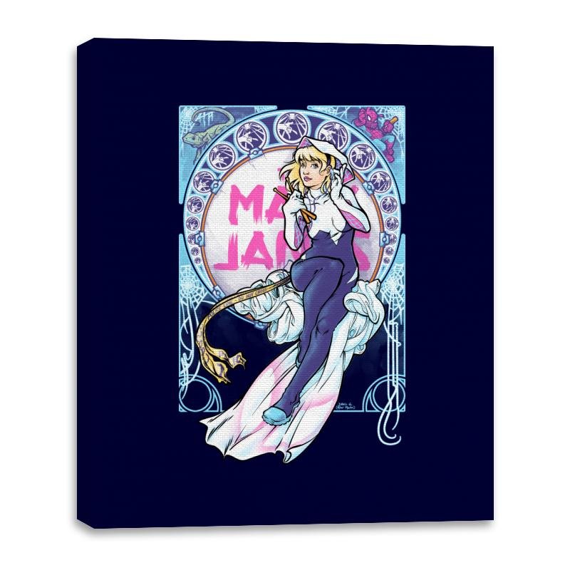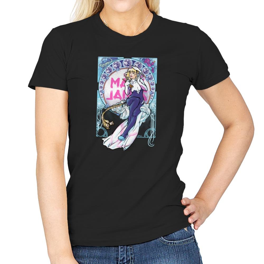 This design reimagines a familiar heroine through an Art Nouveau lens, blending elegance, danger, and quiet confidence. She sits centered in an ornate frame of webs and symbols, poised and self aware, holding her power rather than announcing it. The visual language nods to vintage poster art while grounding the character in a darker, more self possessed mood. Fans who understand the reference will catch the balance between innocence and control immediately.