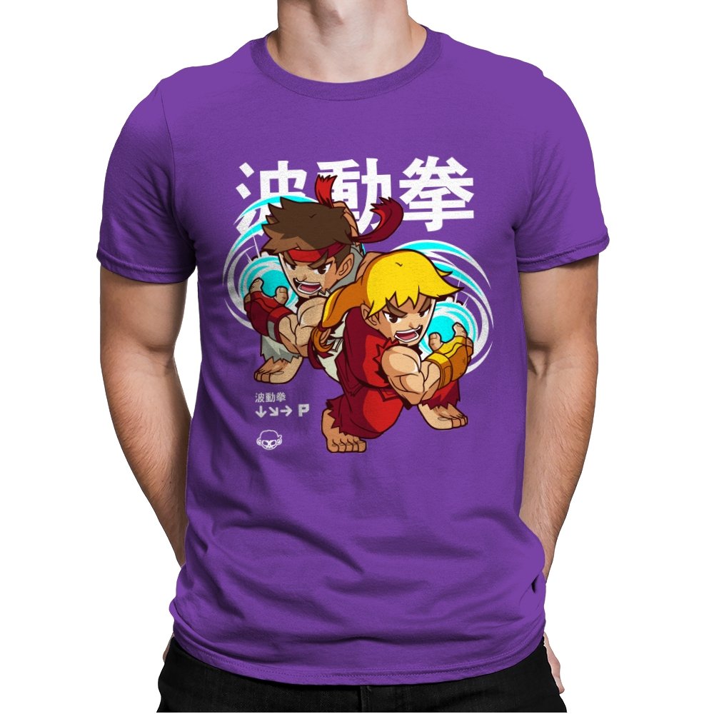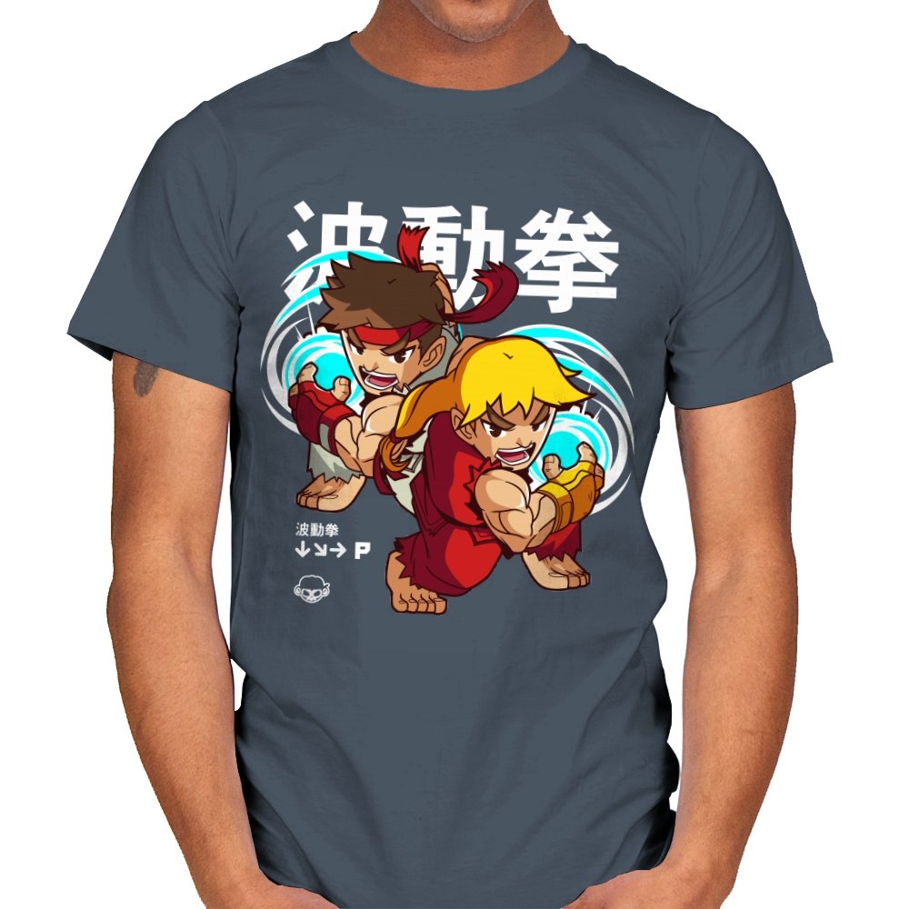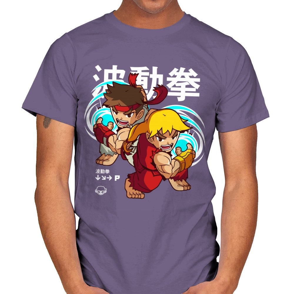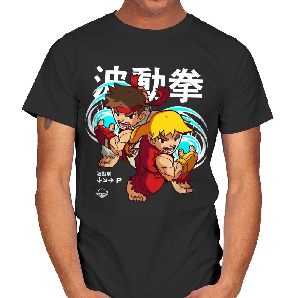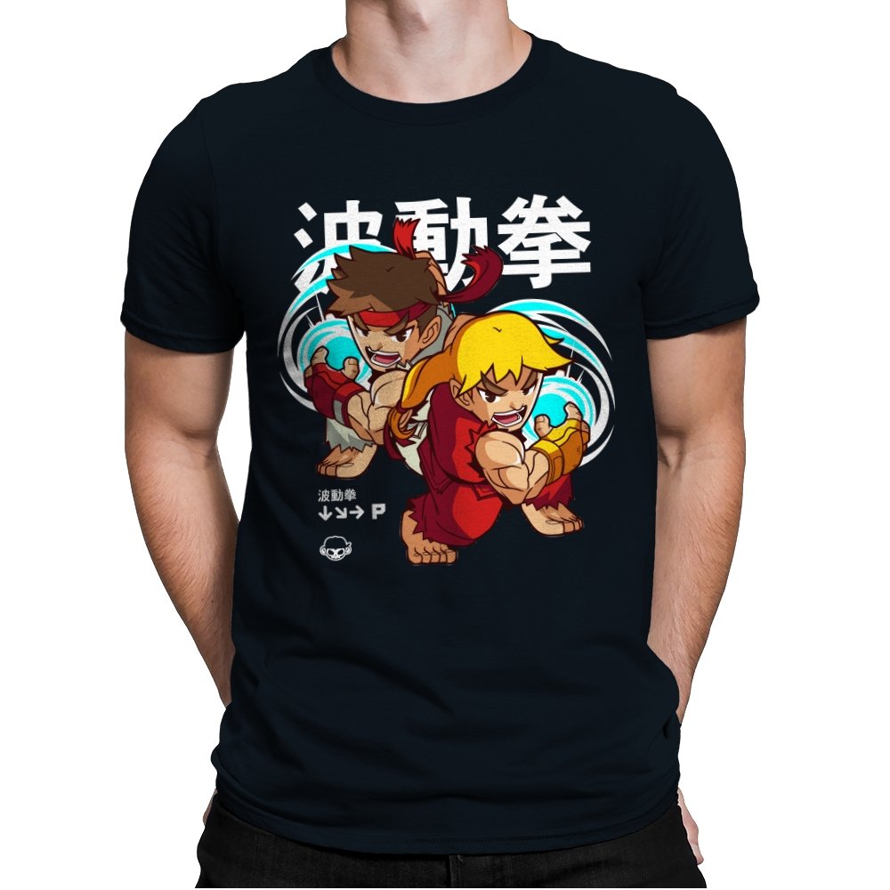 This design takes a familiar fighting game moment and filters it through a playful, chibi lens. Two compact martial artists mirror each other mid-strike, energy swirling as if frozen between inputs. The exaggerated expressions and rounded proportions soften the intensity without losing the motion. Fans who learned the move by muscle memory will spot it instantly.